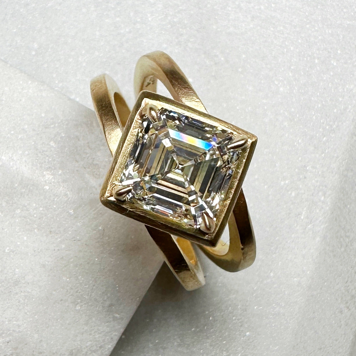 This 2.36ct Lab Grown Asscher Cut Diamond is set in 18k yellow gold in our signature metal halo design