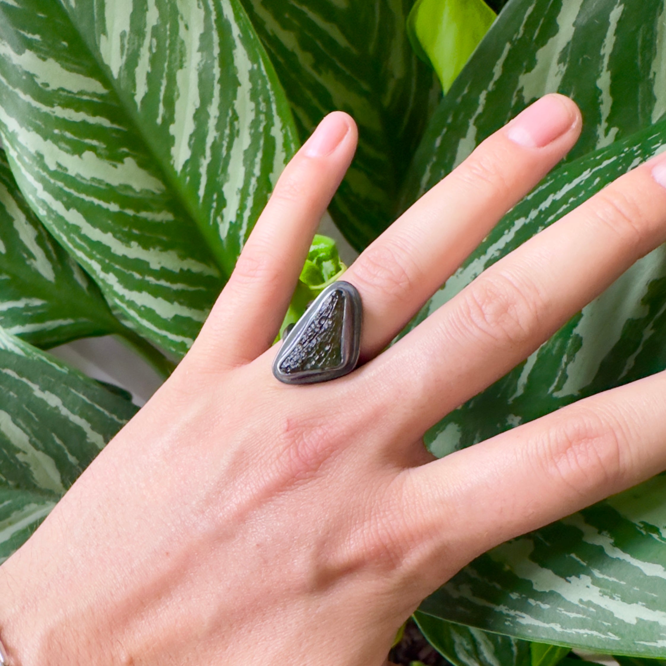 This natural Moldavite, a rare gemstone with extraterrestrial origins was set in blackened sterling silver to emulate this fascinating origin story.