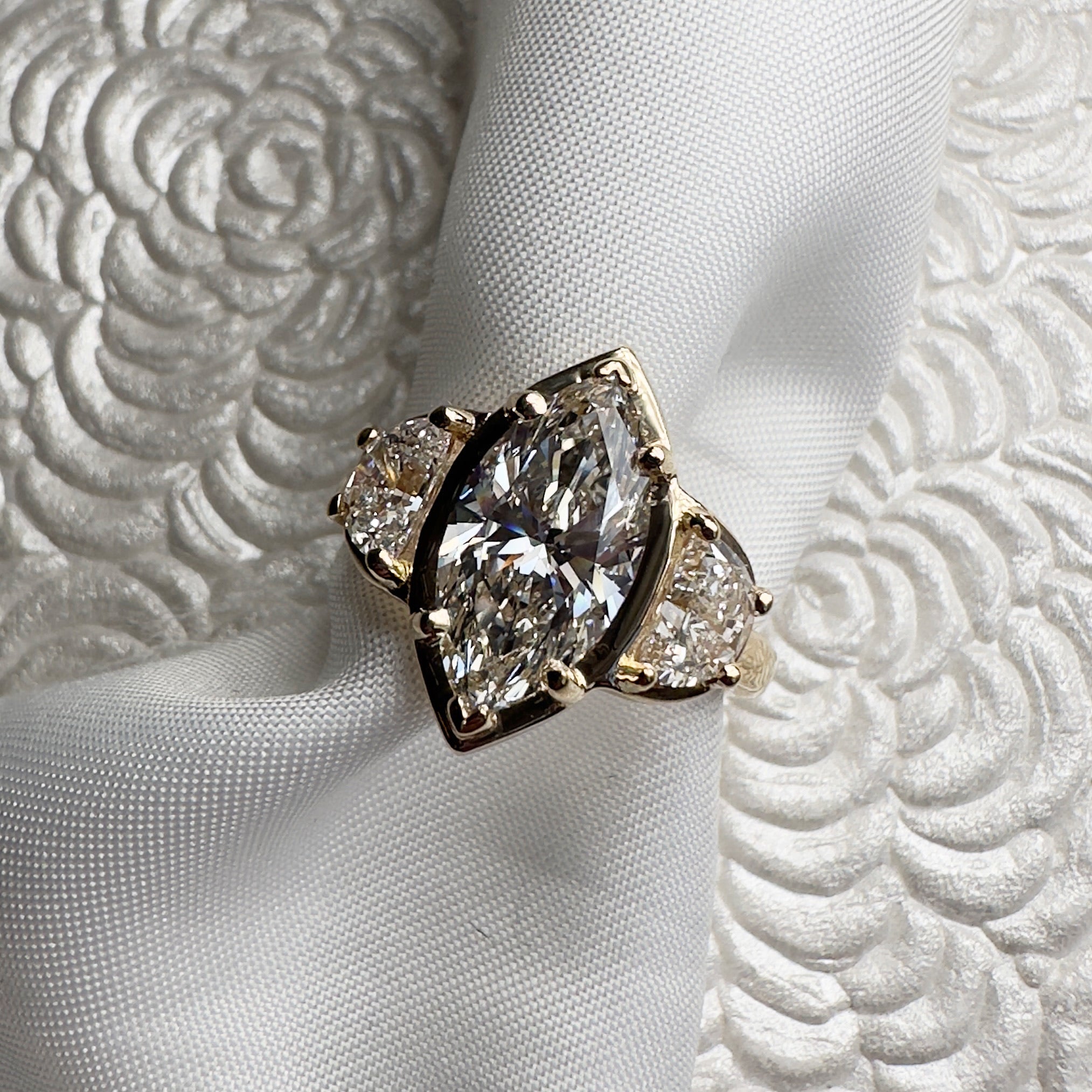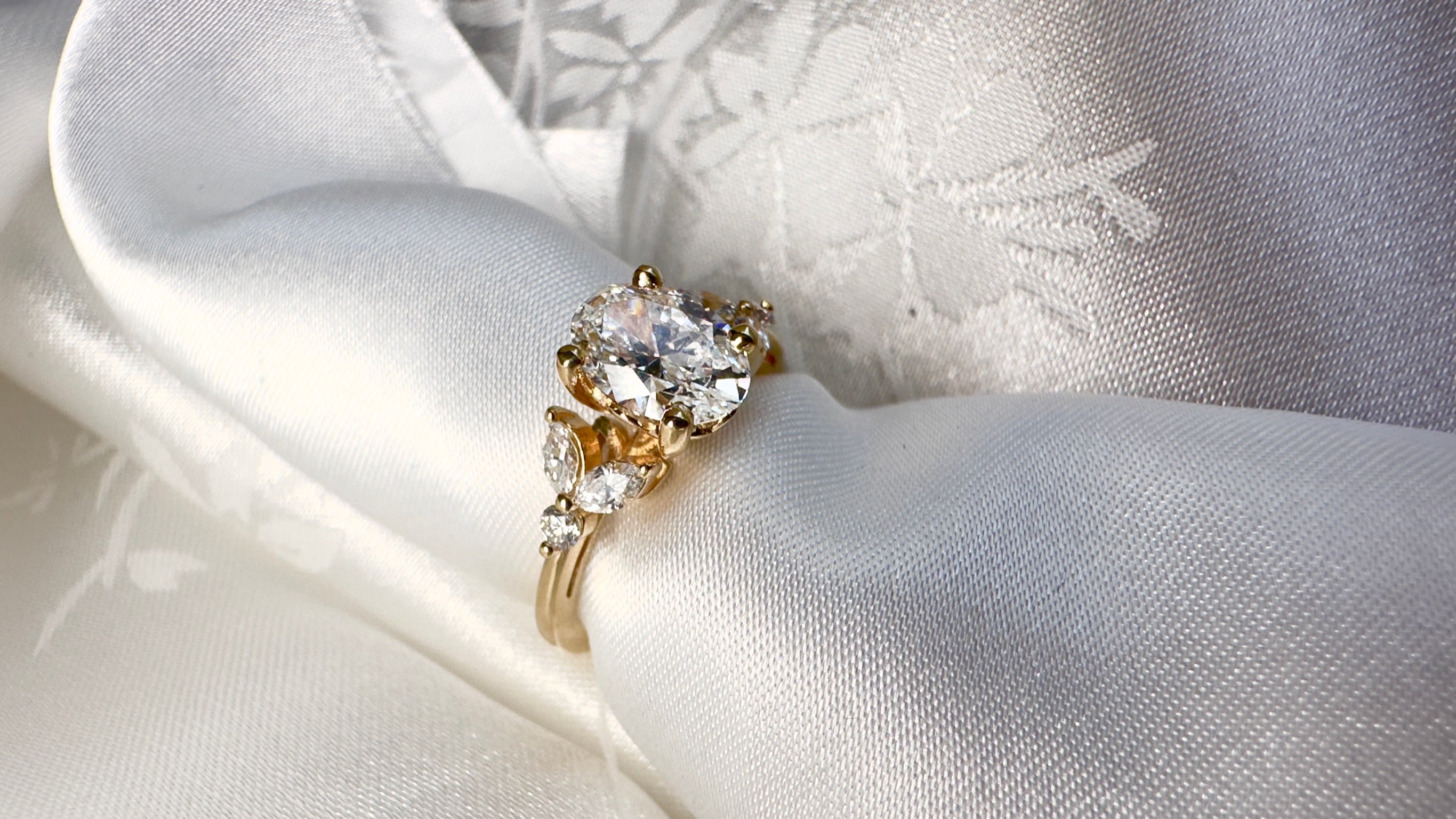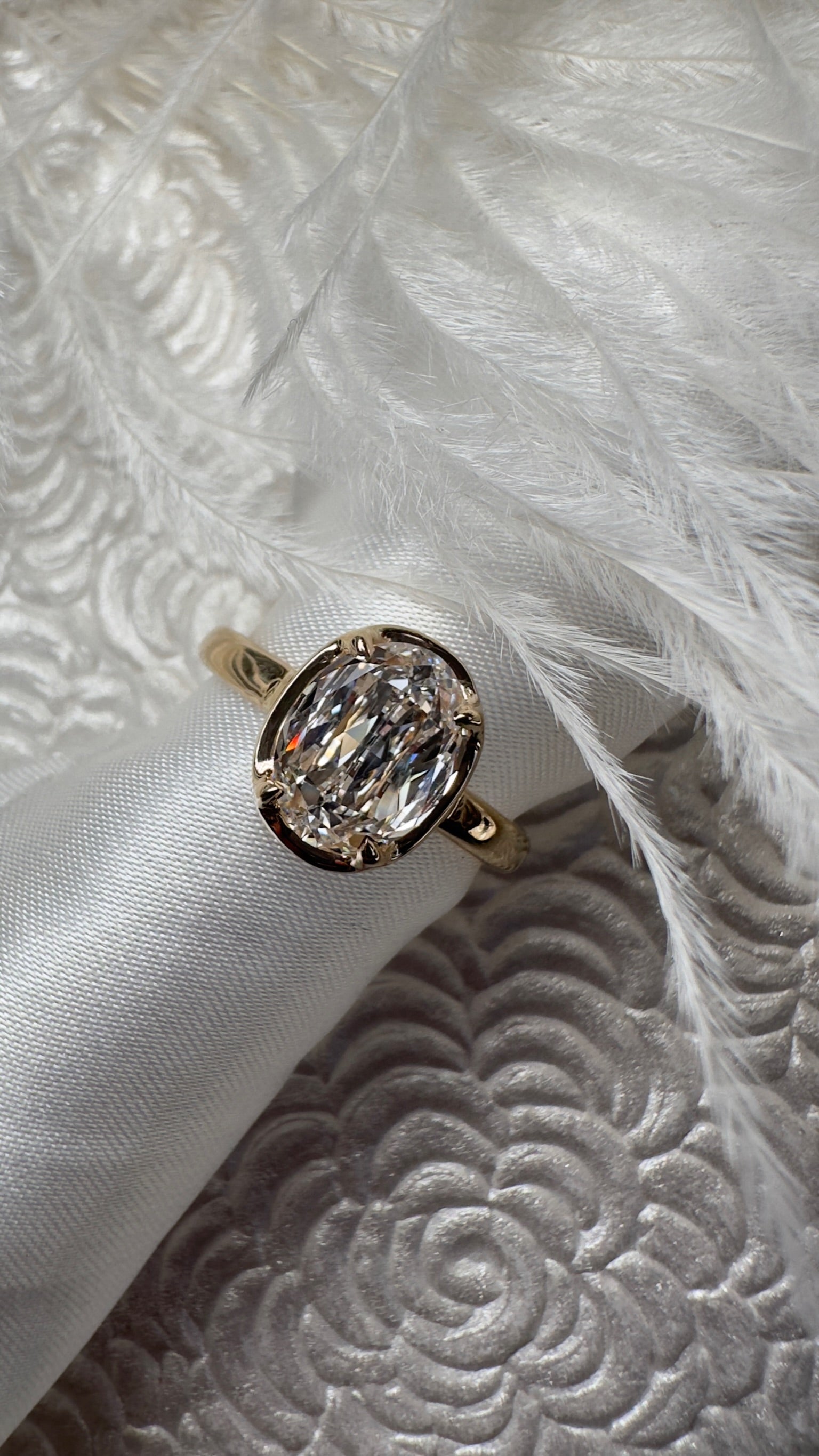 3+ carat Lab Grown Oval diamond, set in 14k yellow gold with double prongs and a cathedral-style band for added security and longevity.