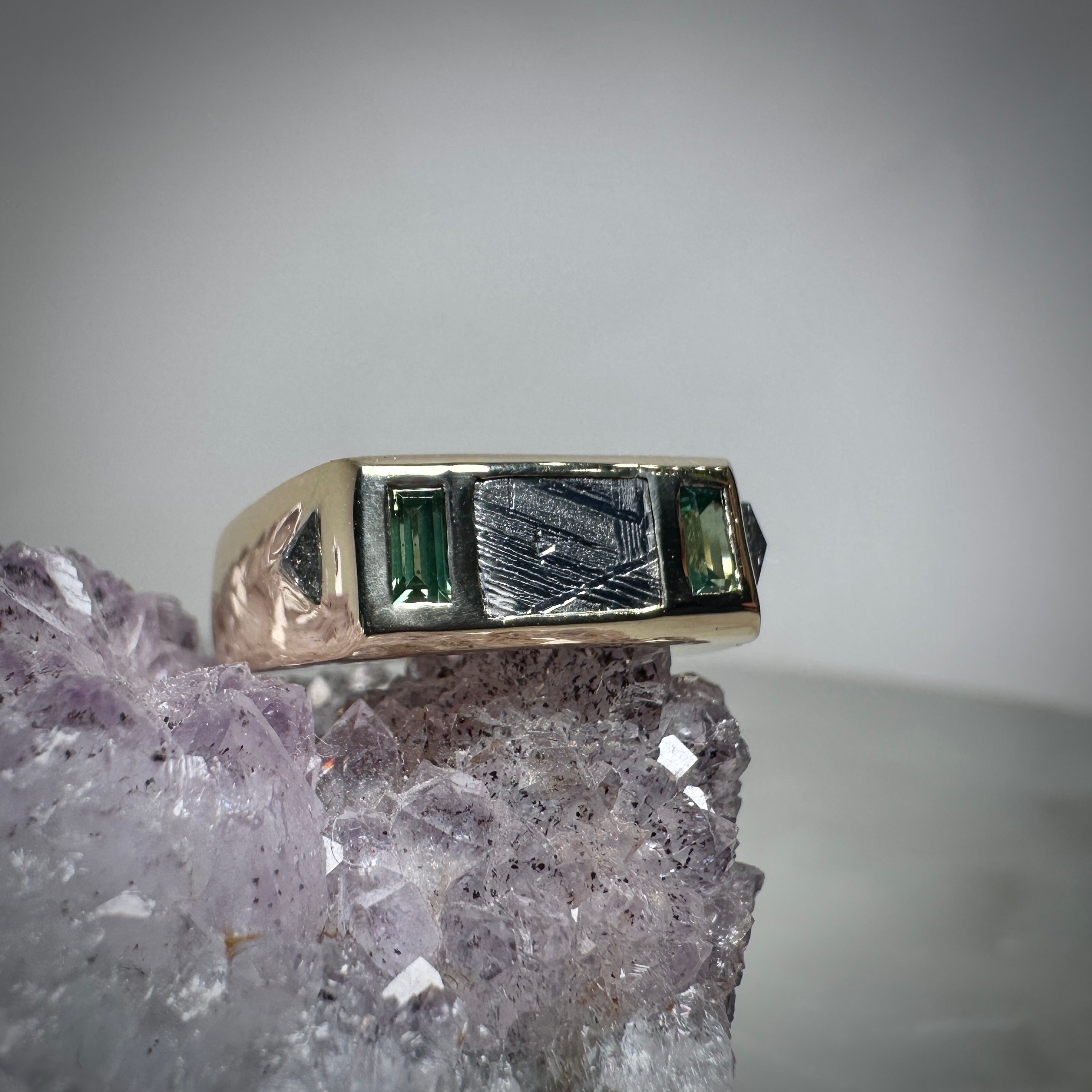This ring features five brilliant stones: a gibeon meteorite slice, two green Australian sapphire baguettes, and two triangular grey ‘salt and pepper’ diamonds