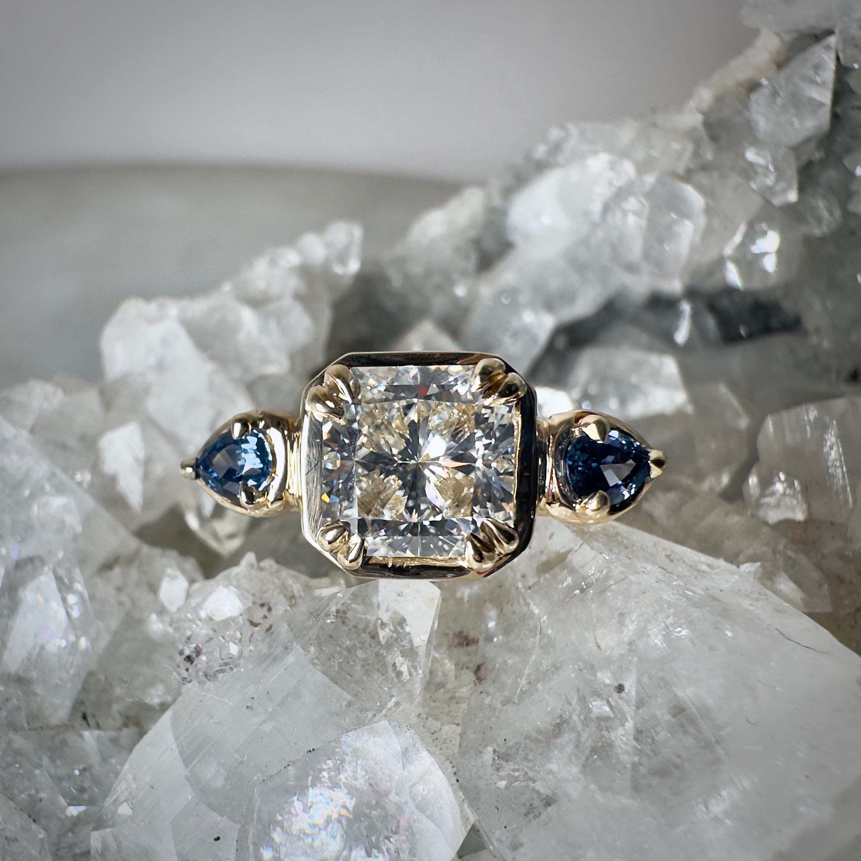 Yogo Sapphires from Montana are world-renowned for their periwinkle blue color and sparkling clarity. They perfectly accent the center diamond, which is a 2-carat square radiant cut lab grown diamond