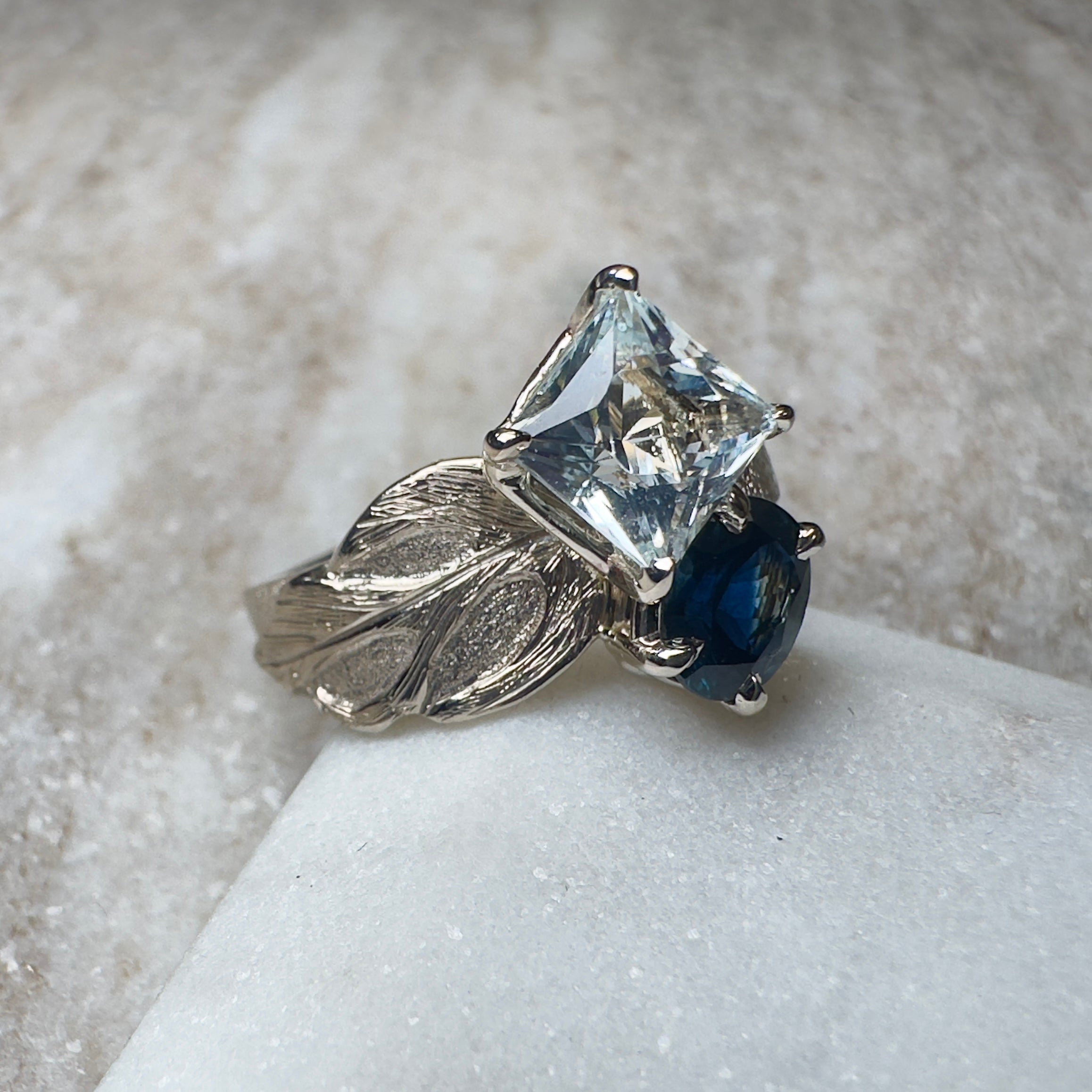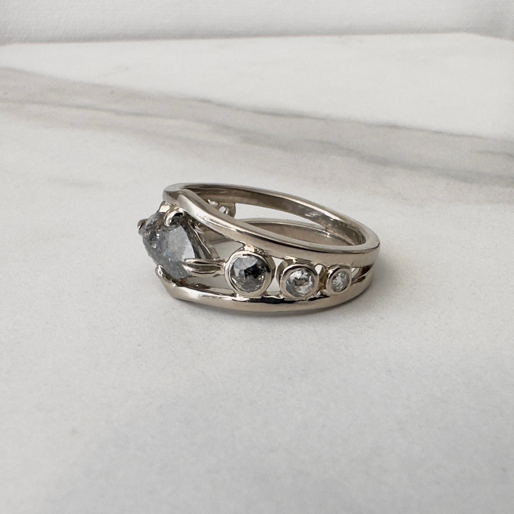 Creative freedom is music to our ears — and this ring is a fantastic example of it! We absolutely treasured the whole process of creating this ring. From sourcing the perfect stones, to hand crafting it from 14k palladium white gold, we proudly delivered a truly unique ring to our clients. And most importantly of all, they love it!