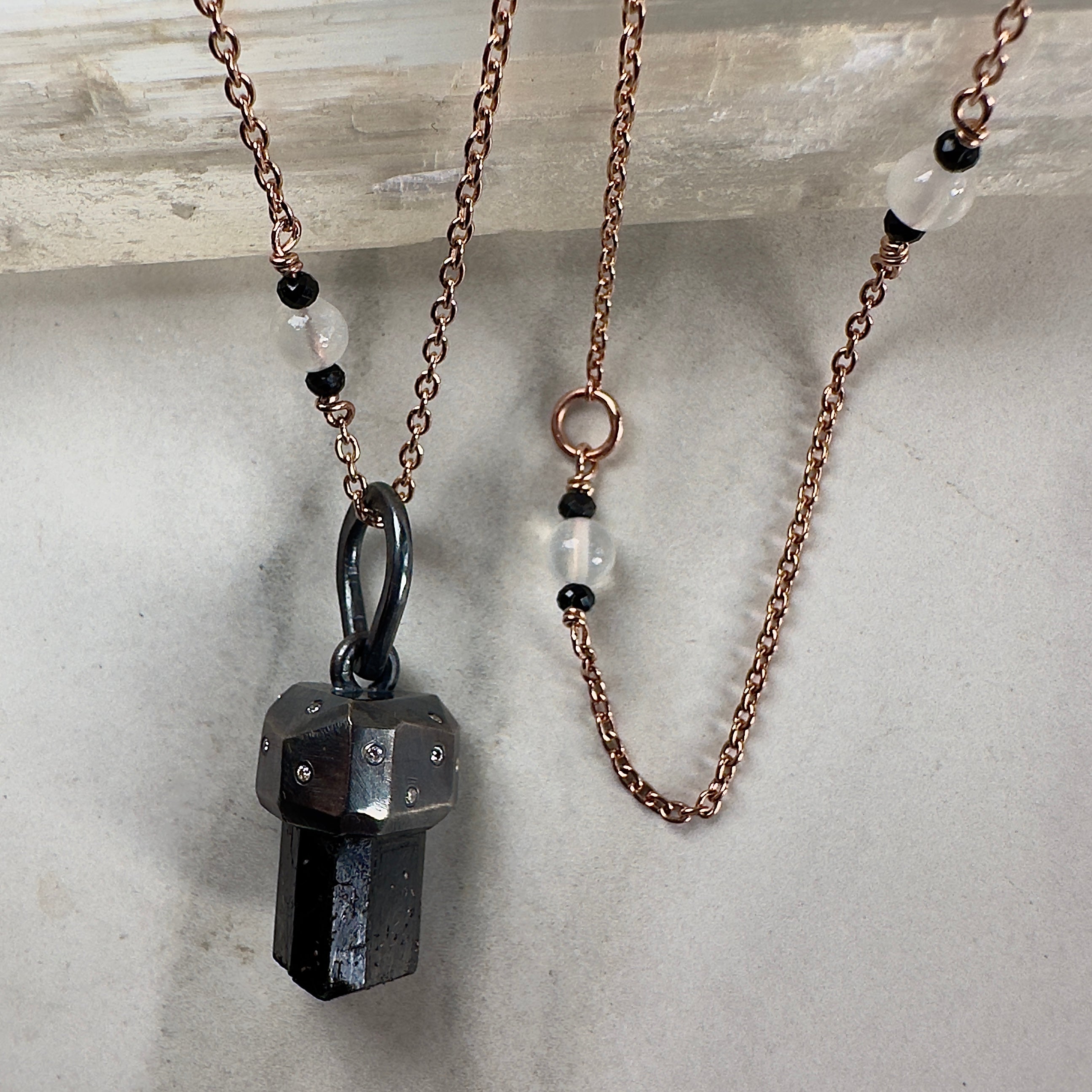Black tourmaline and white selenite are known for their energy-calming and protective properties, which was exactly what our client needed when she embarked on her entrepreneurial adventure.