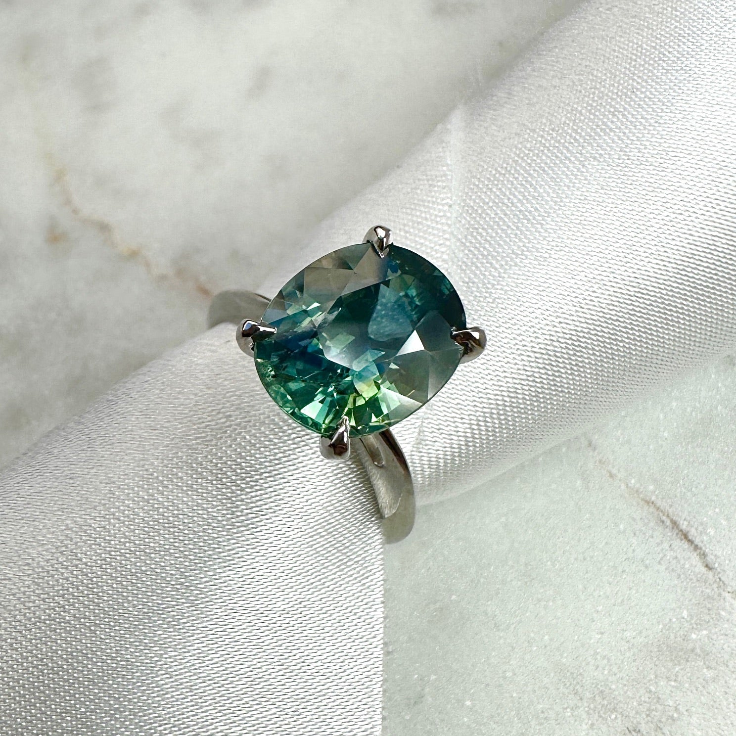 Madagascar has been producing some of the most stunning, uniquely colored sapphires in the last few years. This simple platinum solitaire shows off the rich ‘mermaid’ hues of this stunning stone.