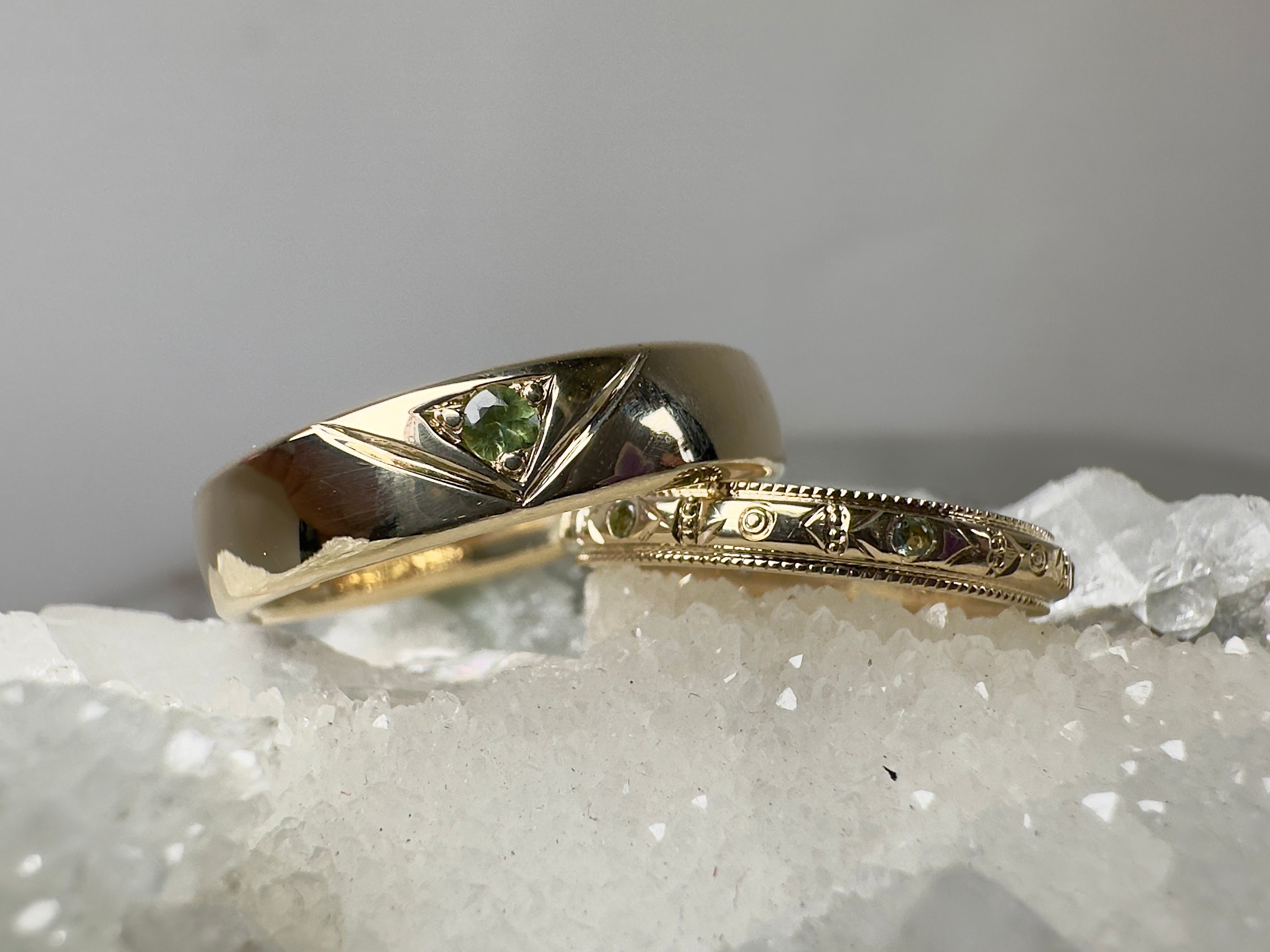 This pair of rings has glowing green sapphires, which were chosen for the couple’s adoration of houseplants and nature. The engraved details are reminiscent of art deco geometric aesthetic with a 21st century twist.