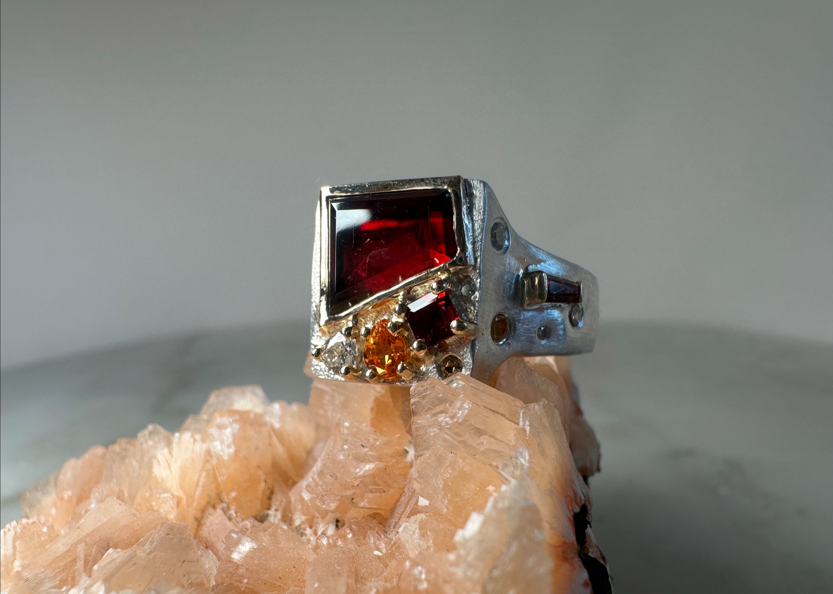 This beautiful signet ring features a variety of natural garnets (our client’s birthstone) as well as a variety of diamonds! Made in silver & 14k yellow gold