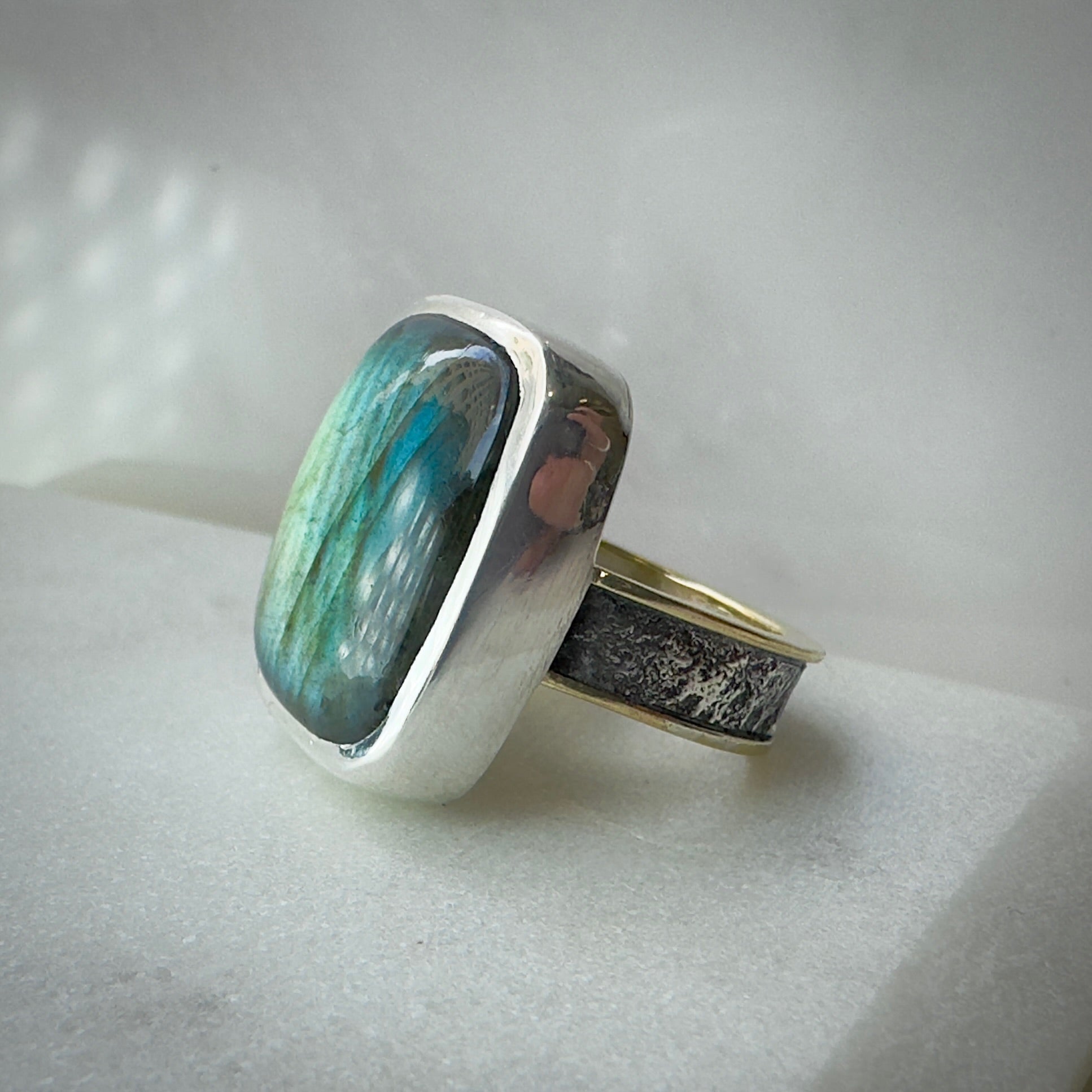 This ring features several of our favorite elements, which we are so thankful for our client’s appreciation for! The rounded rectangle labradorite is complemented by our signature granite texture and 14k yellow gold band.