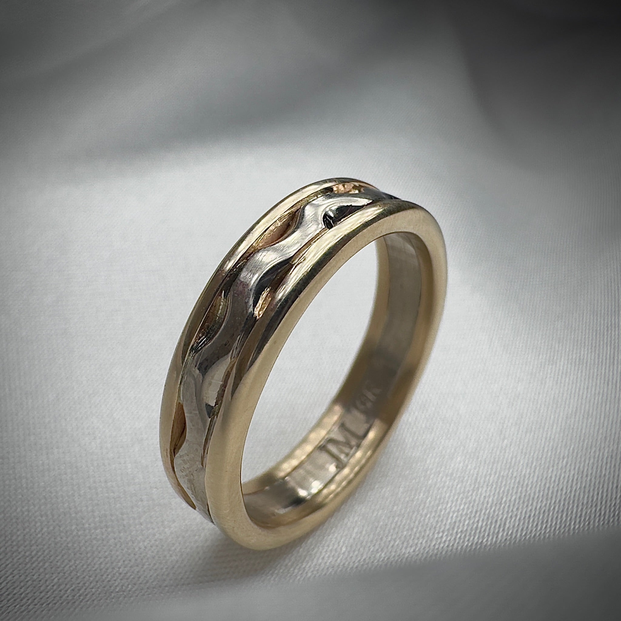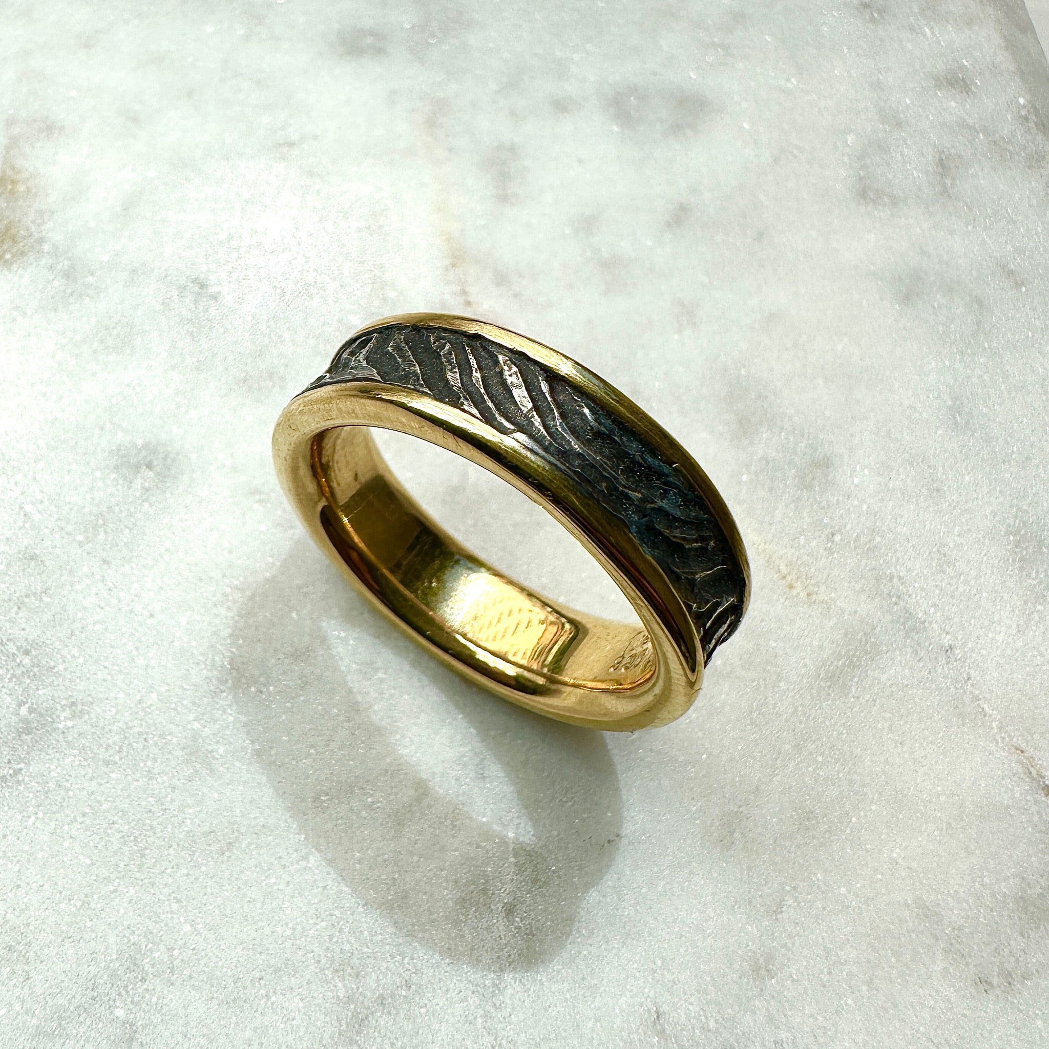Our client loved Damascus steel, but wasn’t crazy about the unfortunate reality that steel rings can’t be resized! We created ‘faux’ Damascus steel by hand carving sterling silver and wrapping it in a layer of 18k yellow gold.