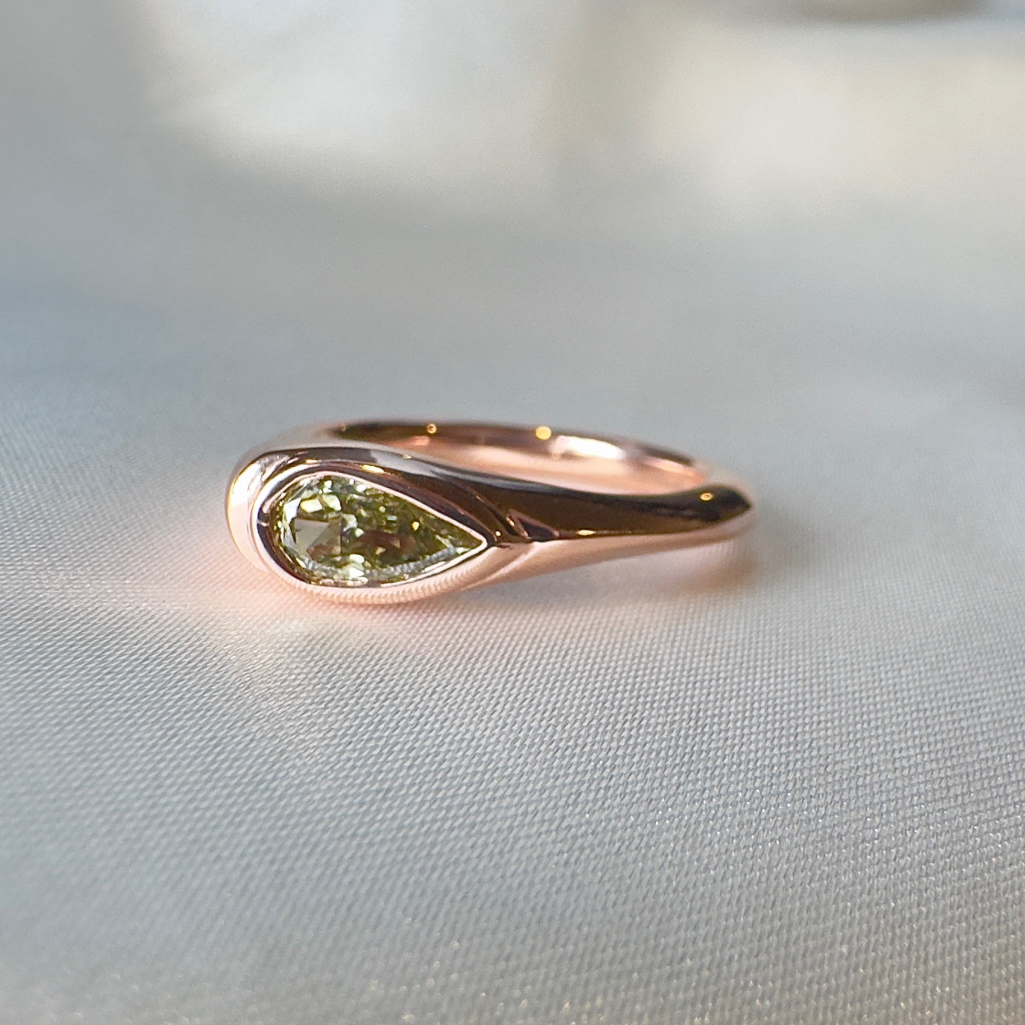 This pinky ring was made with a super-rare natural green diamond. We chose to set it in 14k rose gold to make the complimentary colored green hues of the diamond to pop using color theory!