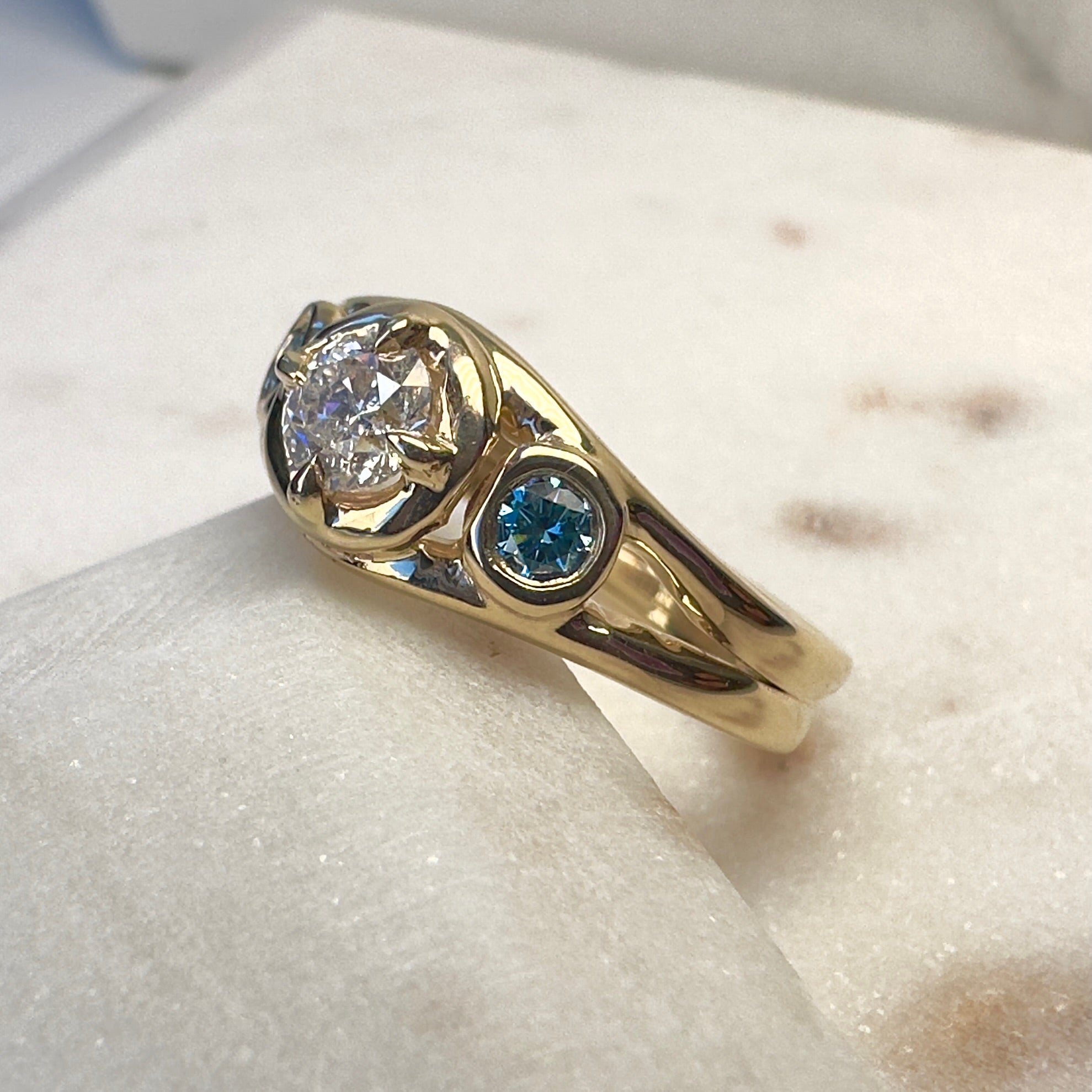 This blended design of a ring features a half-carat natural heirloom diamond and has two aqua-blue diamonds on either side, bezel set within the double 14k yellow gold bands.