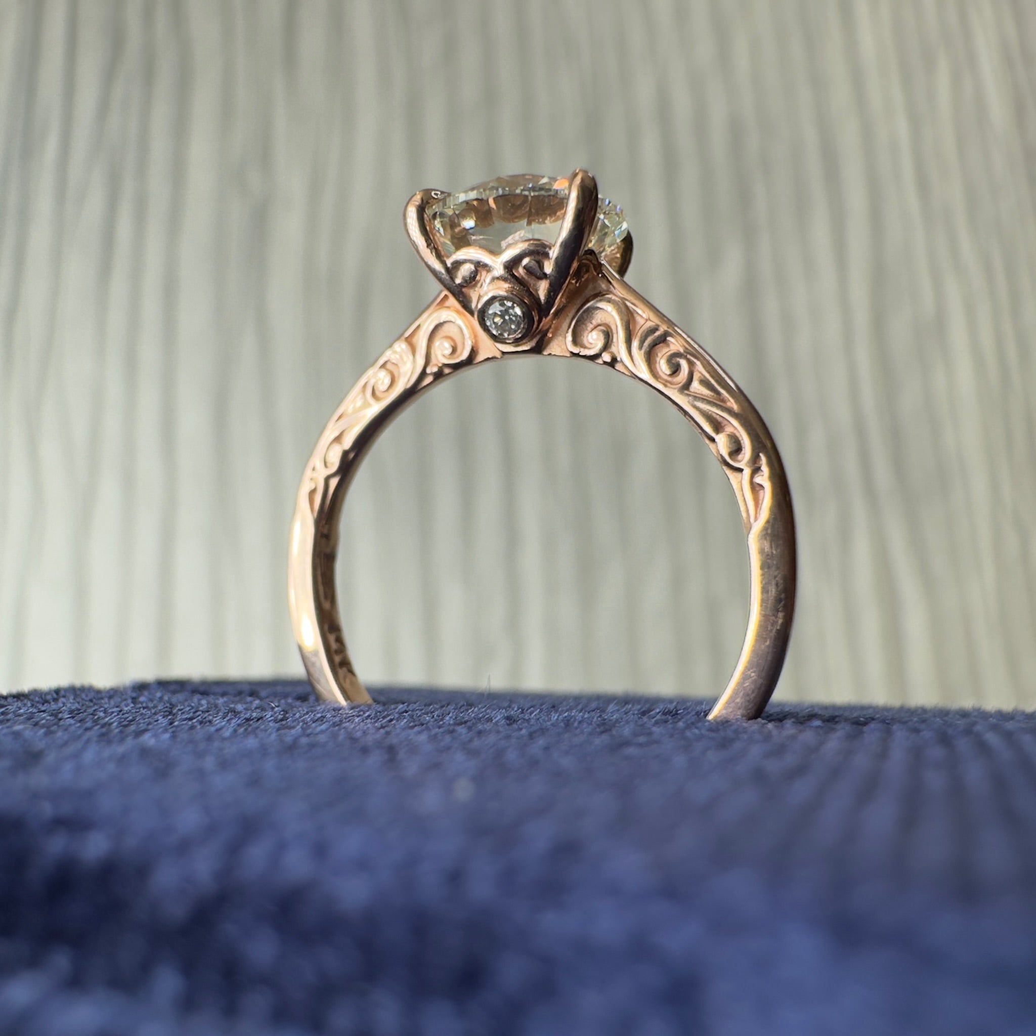 This vintage-inspired ring features a carved swirl pattern and ‘peekaboo’ diamonds below the center stone.