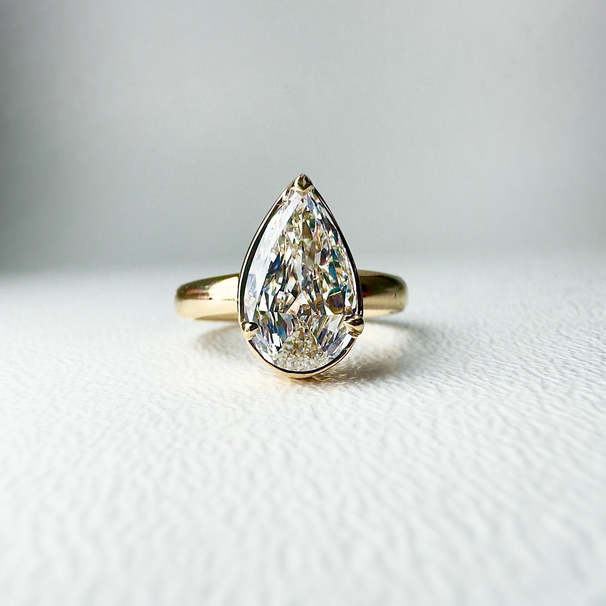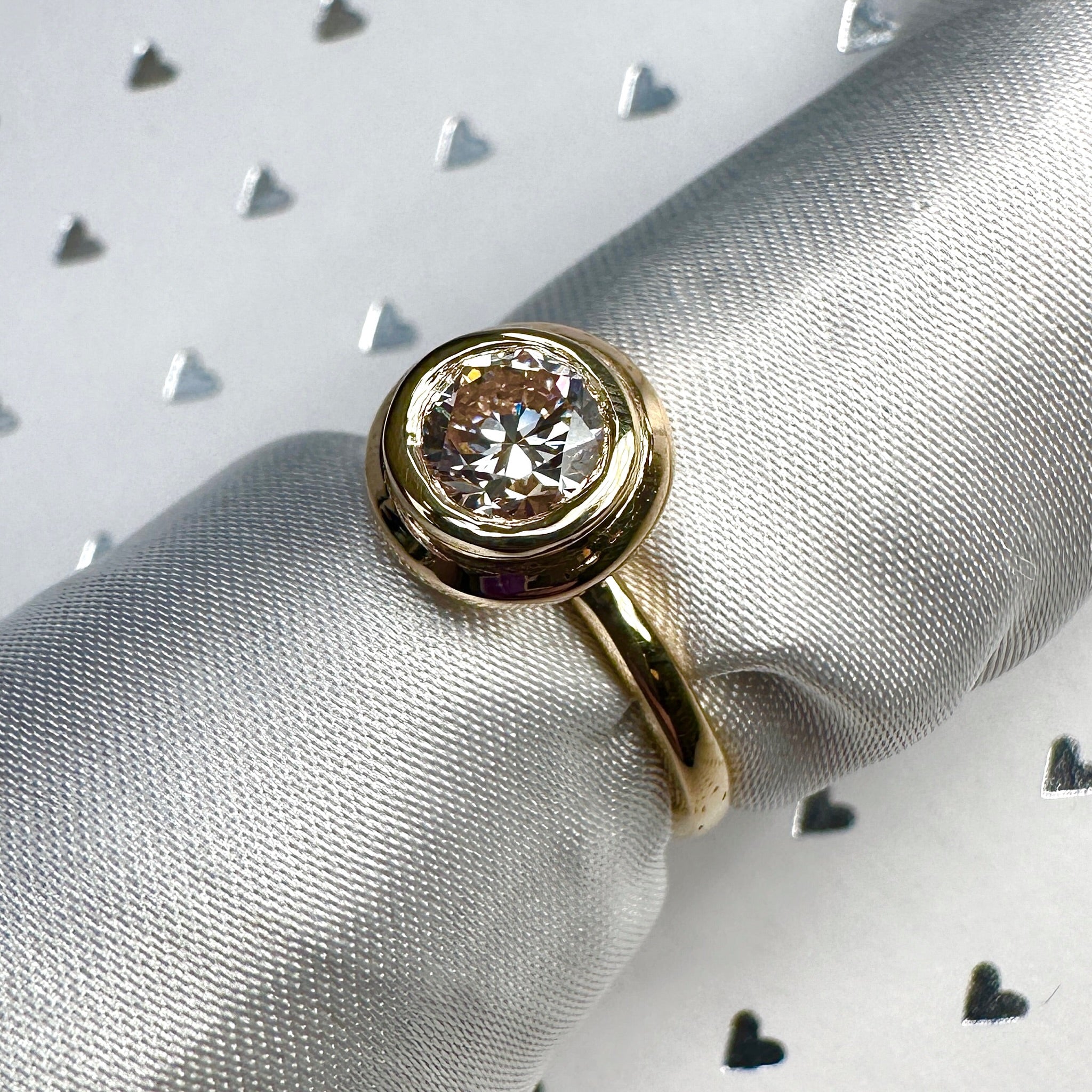 This 1.25 carat lab grown diamond was set in a minimalist bezel setting with a thinner band so she can stack lots of rings with her new engagement ring!