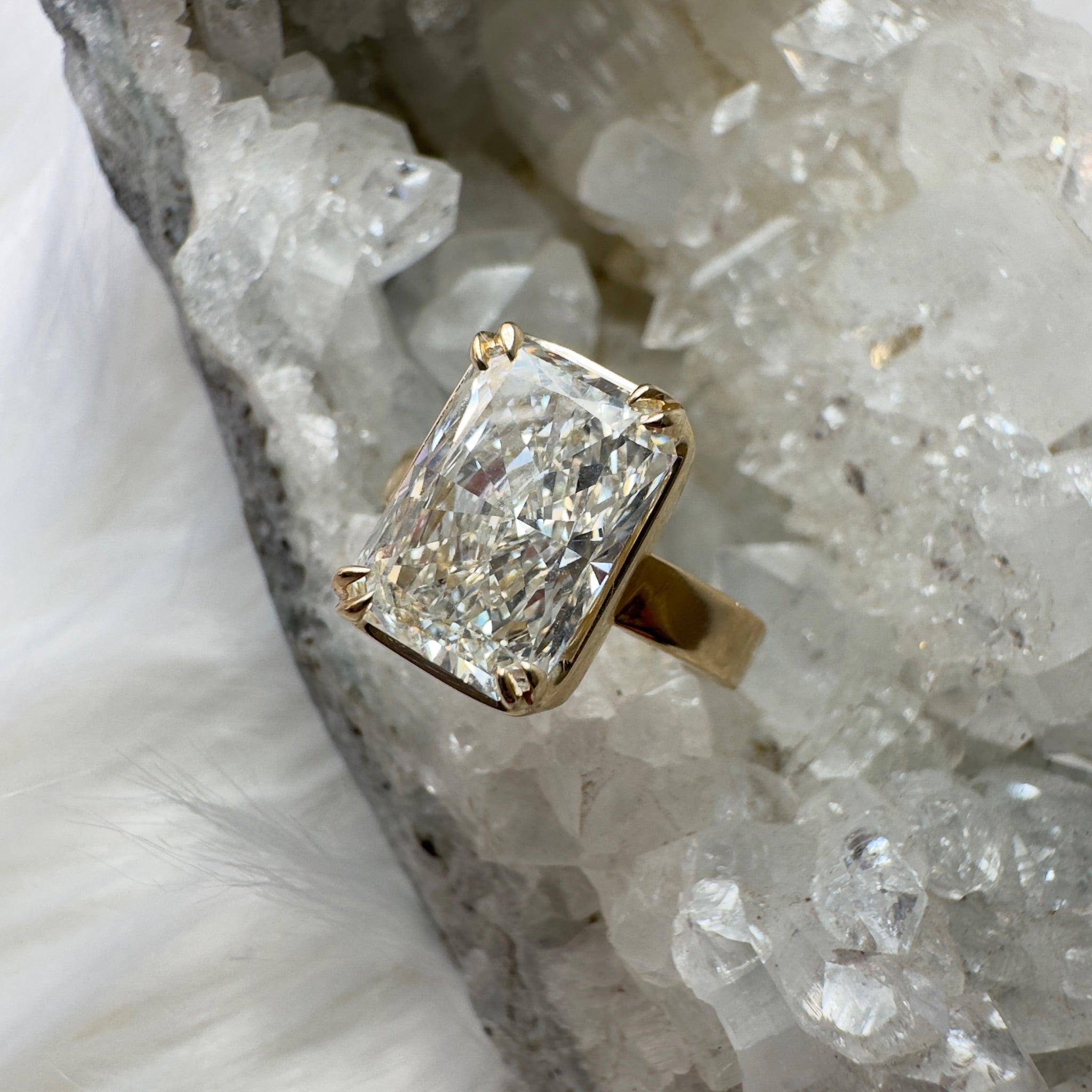 2+ Carat radiant cut diamond, accented with small diamonds on the 14k yellow gold band.