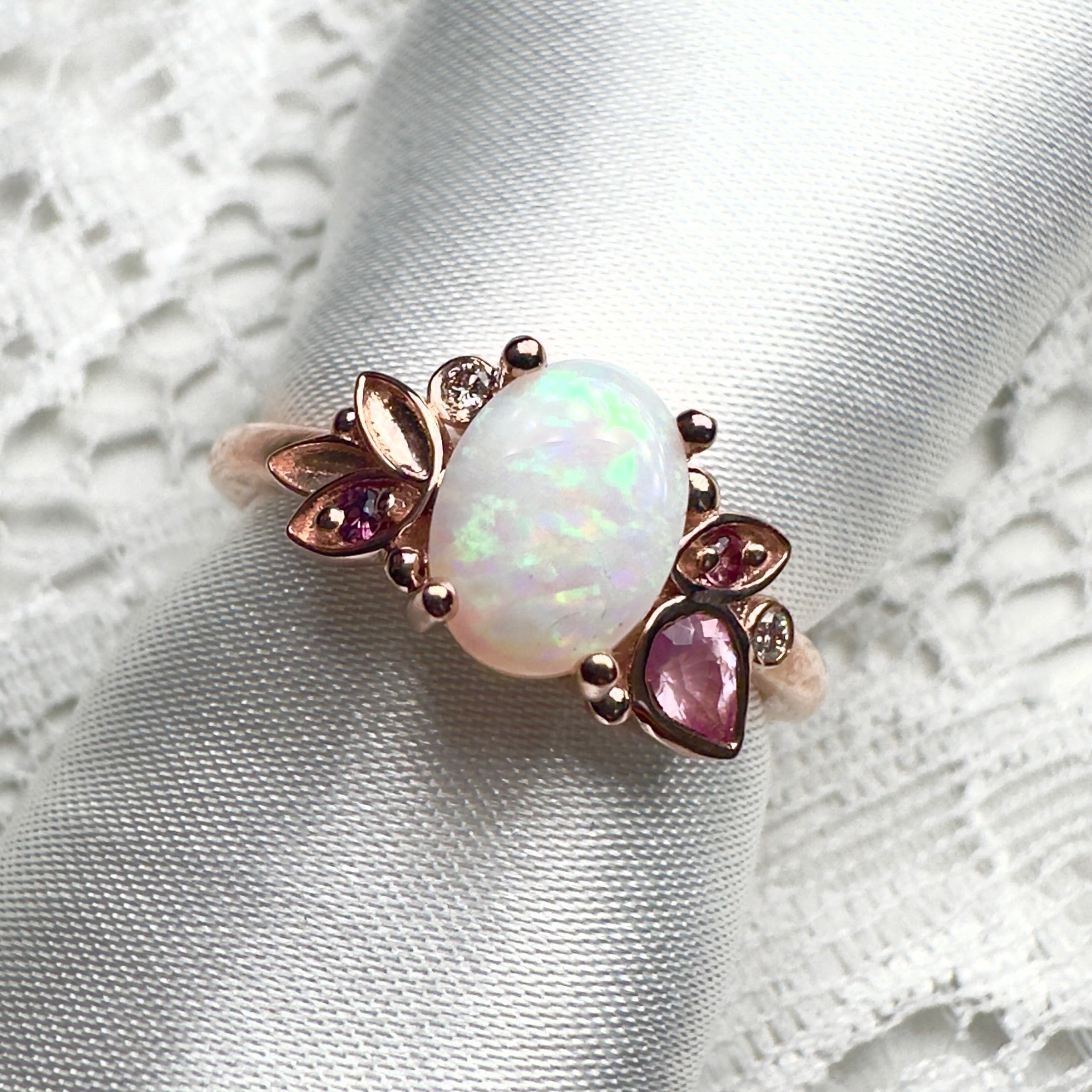 This super feminine ring features several different gemstones in 14k rose gold. Our client knew that his soon-to-be-fiancée wanted opal as a center stone, so we chose to bring out the warm rosy hues of the opal by setting complementary gemstones around it.