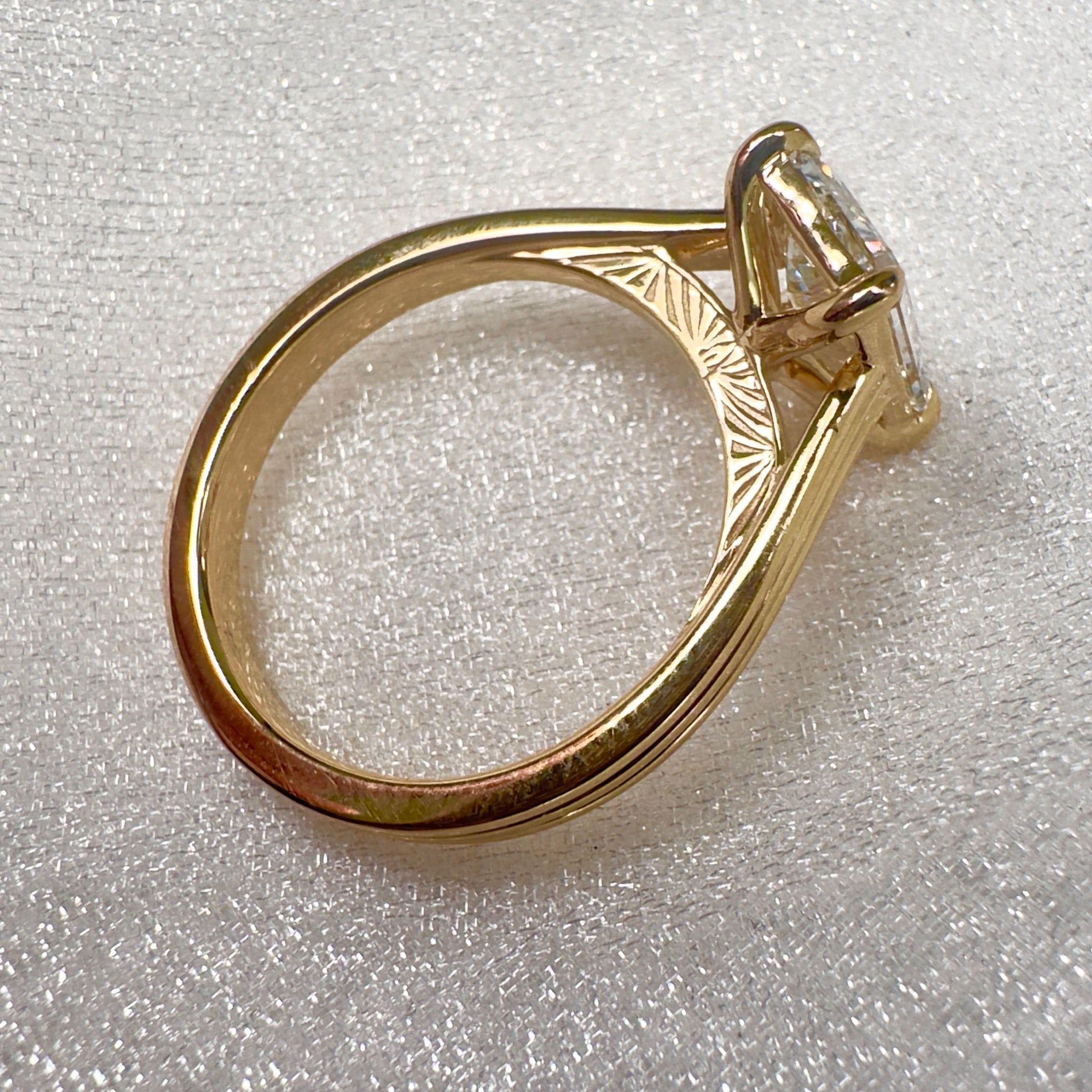 Cratfed in 18k Yellow Gold, this ring features a gorgeous emerald cut diamond and an intricately engraved geometric pattern below the stone.