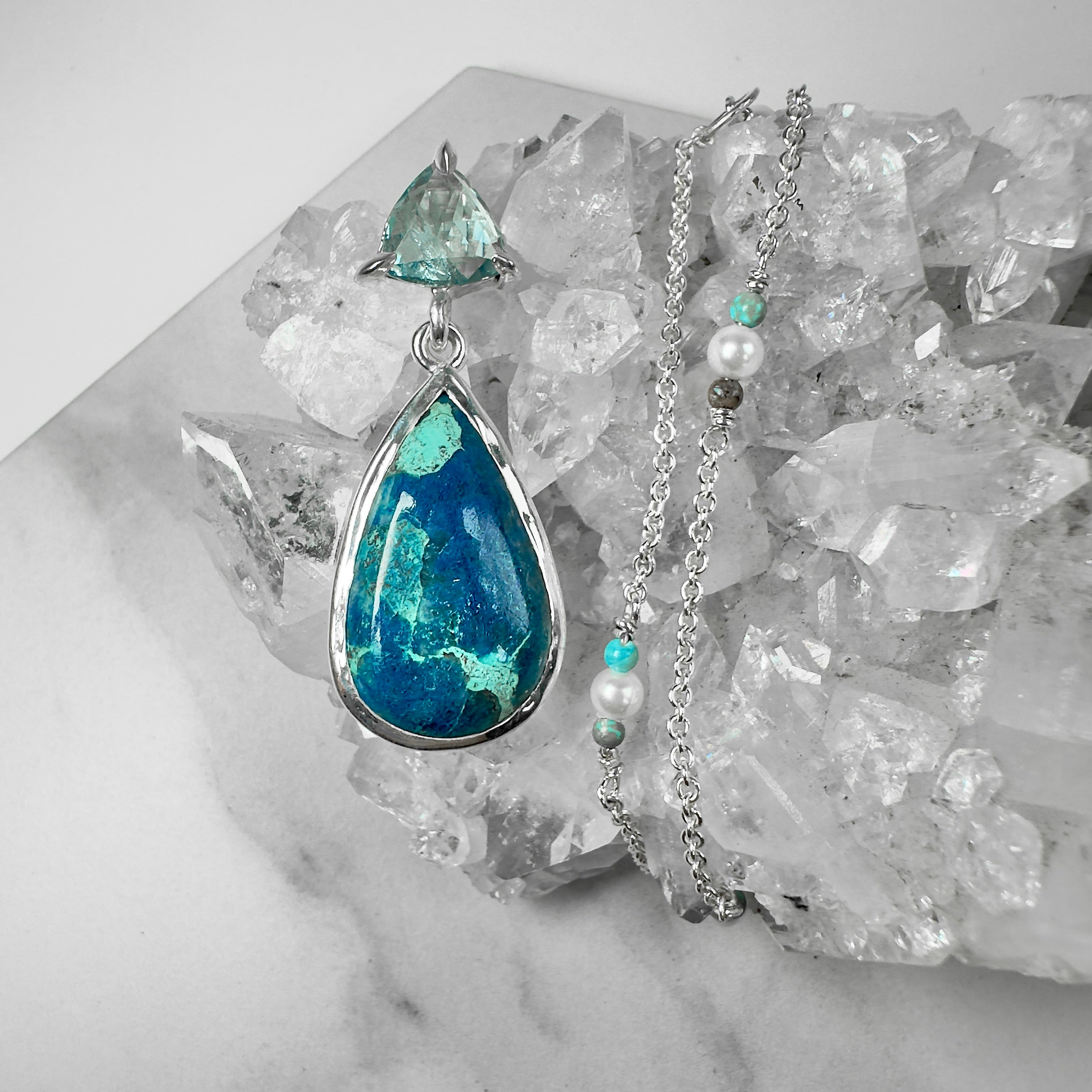 CHRYSOCOLLA, AQUAMARINE, PEARL & TURQUOISE PENDANT and CHAIN