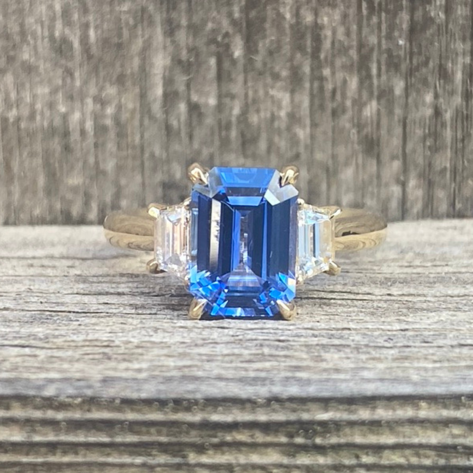 This timeless 18k yellow gold ring features a stunning emerald cut sapphire in the center, and its complemented by two half-carat trapezoid cut natural diamonds on either side.