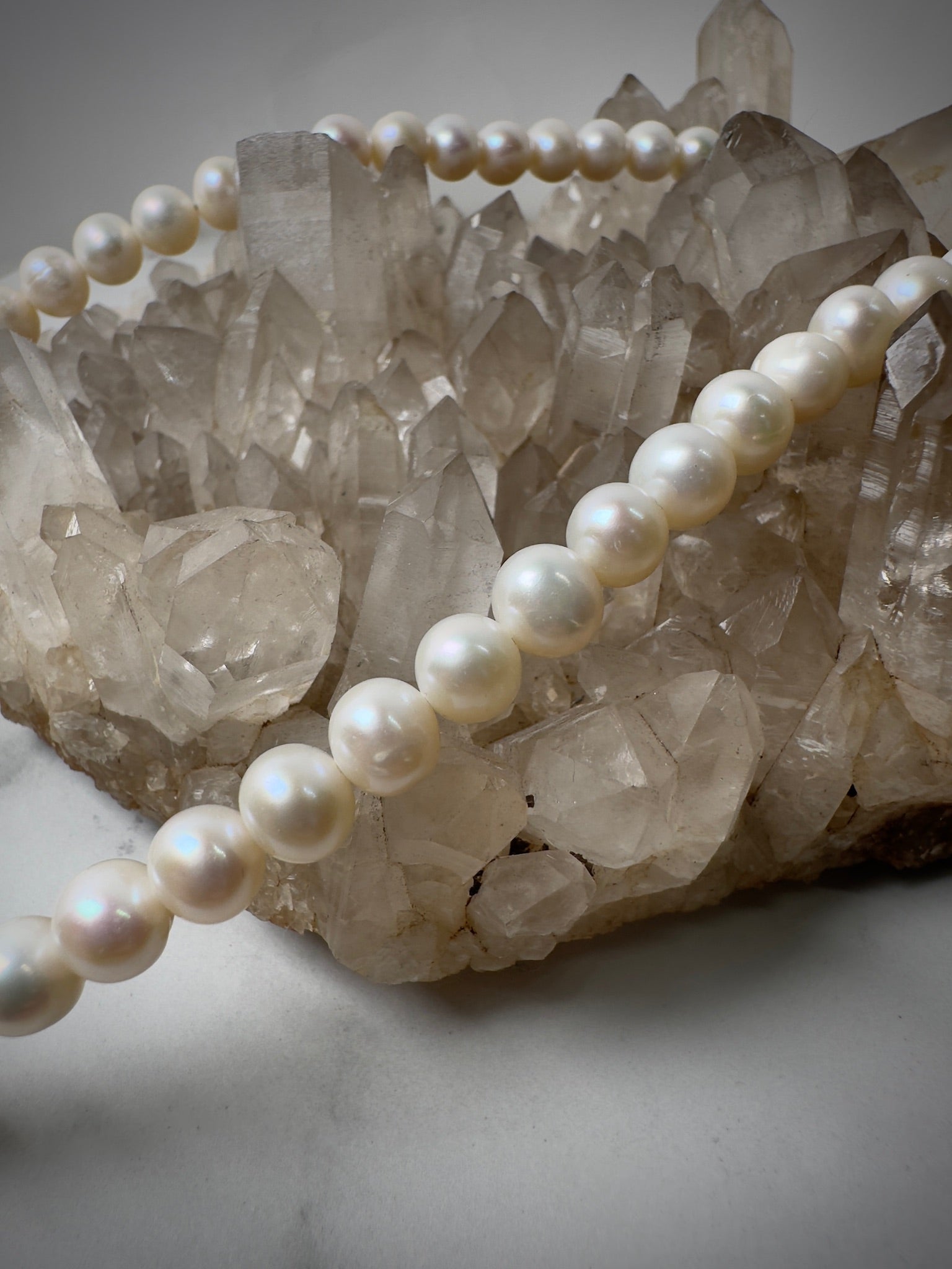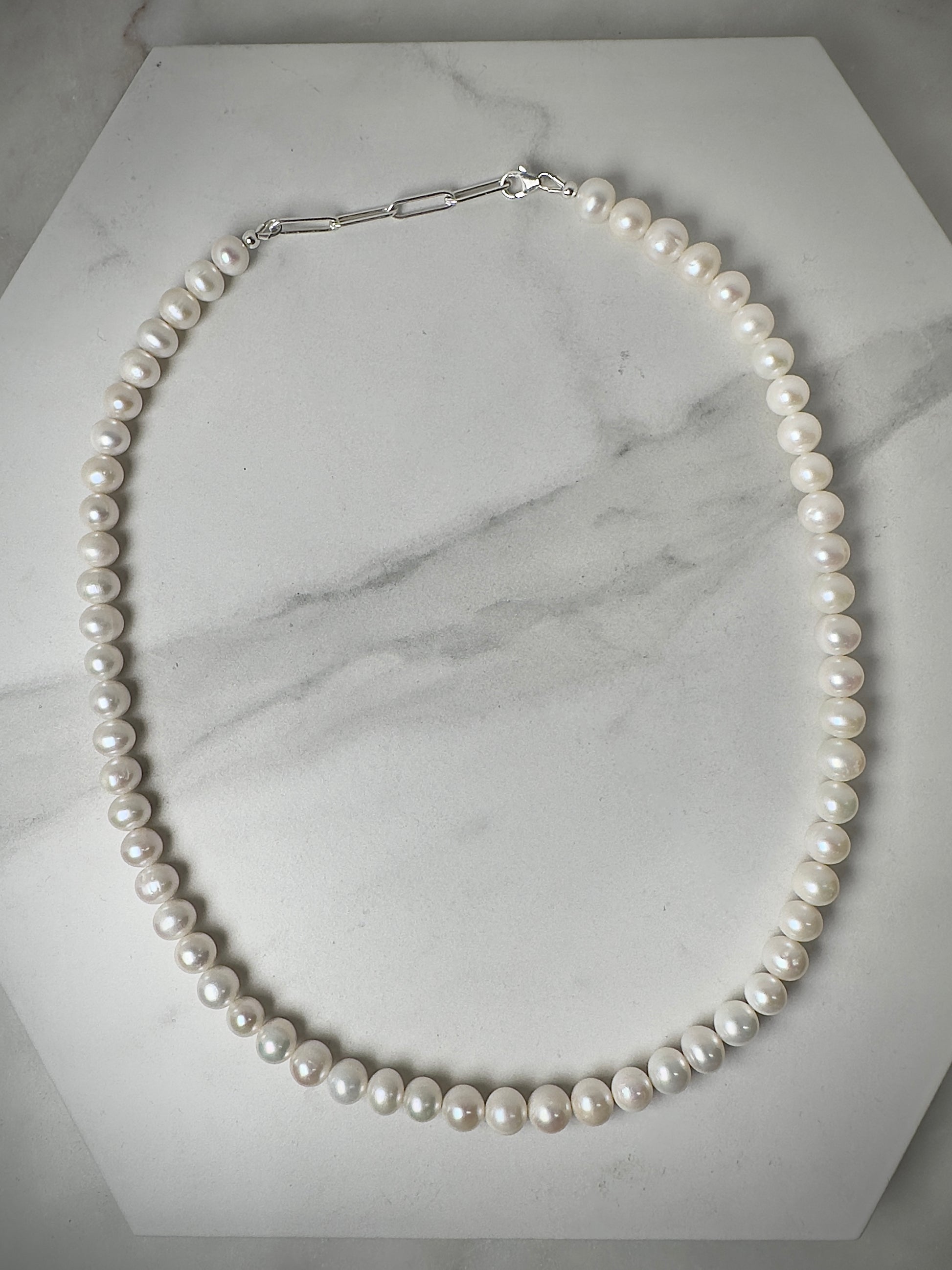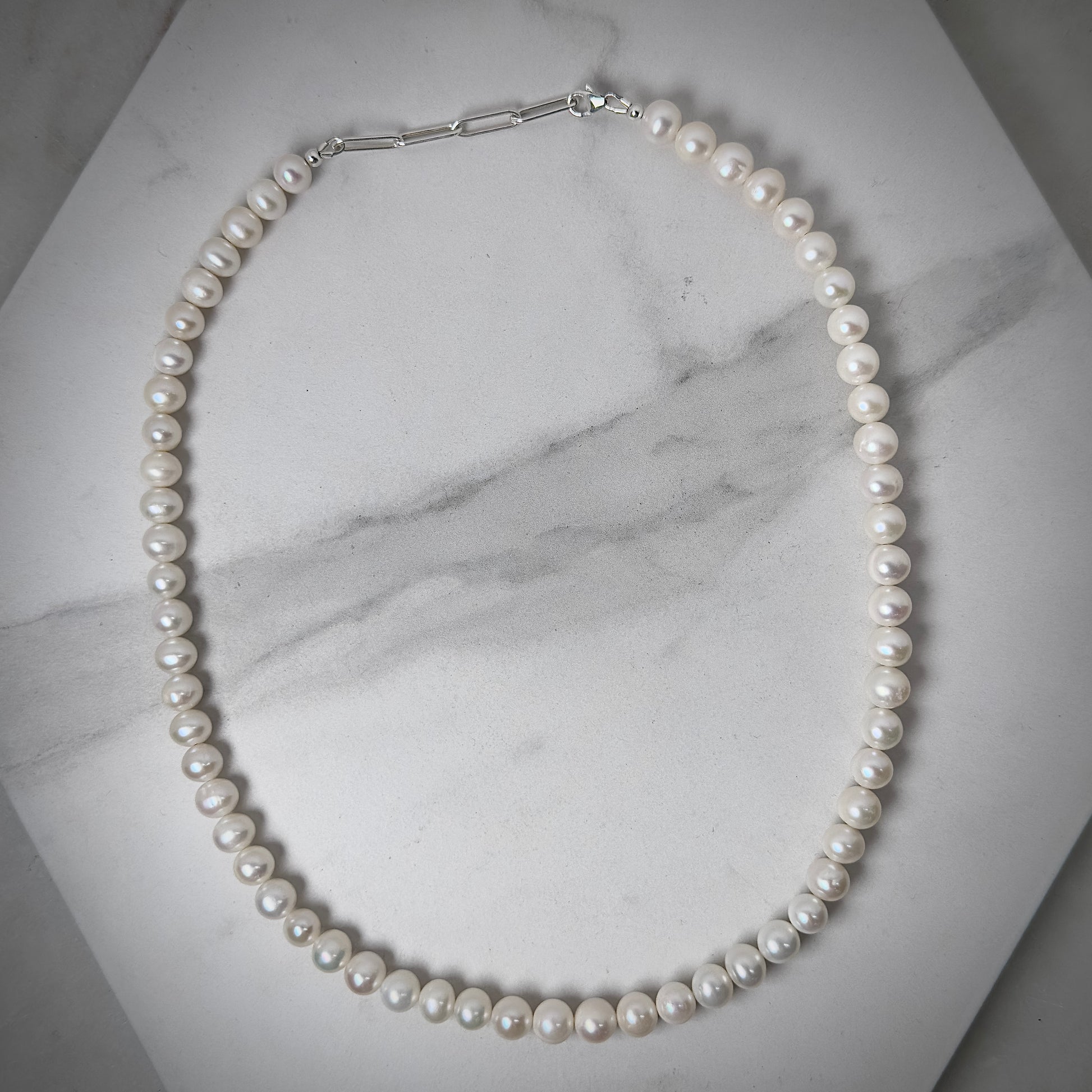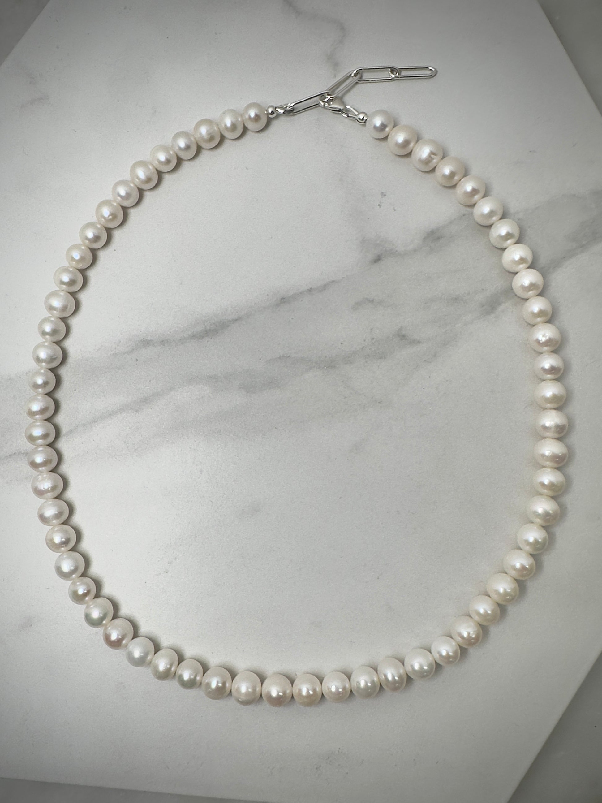 This gorgeous beaded necklace features freshwater pearls strung on a stainless steel wire. The length is adjustable and can be worn at 17” through 19” making this a great piece to layer with other necklaces.