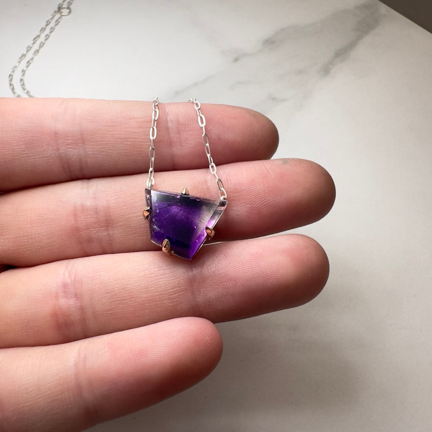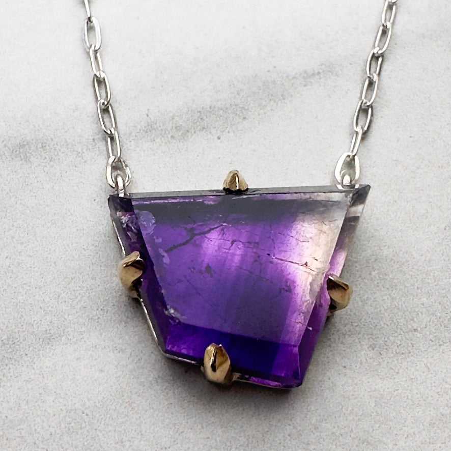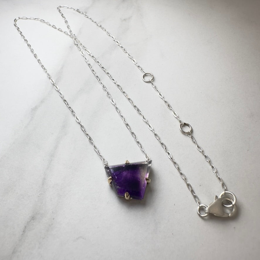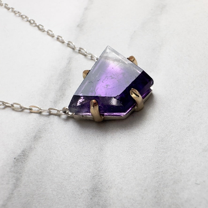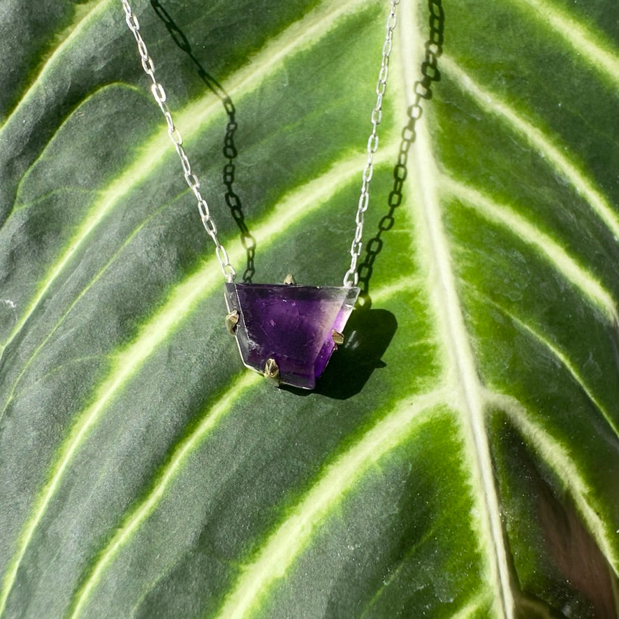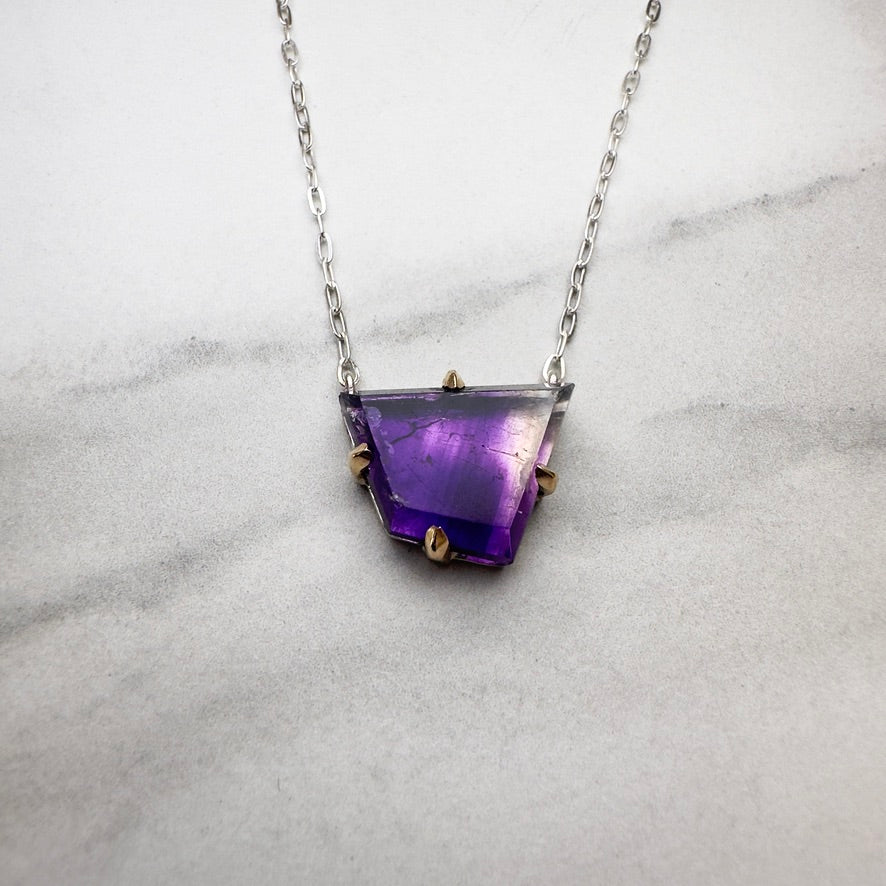 This pendant features a vibrant natural Amethyst slice from Brazil, which has been cut and polished in a unique geometric shape. 14k Yellow gold prongs hold the stone in place securely, while still allowing the stone to glow in the light.