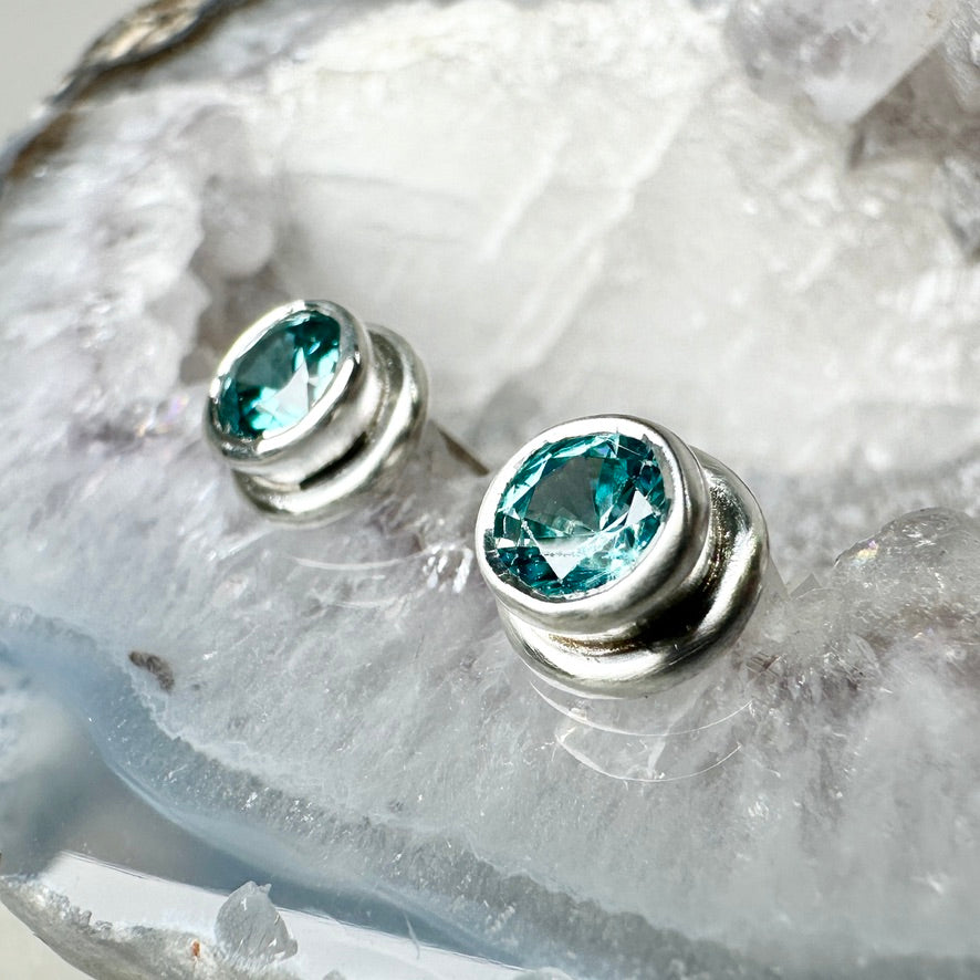 Bezel Set Blue Zircon Stud Earrings | Sterling Silver