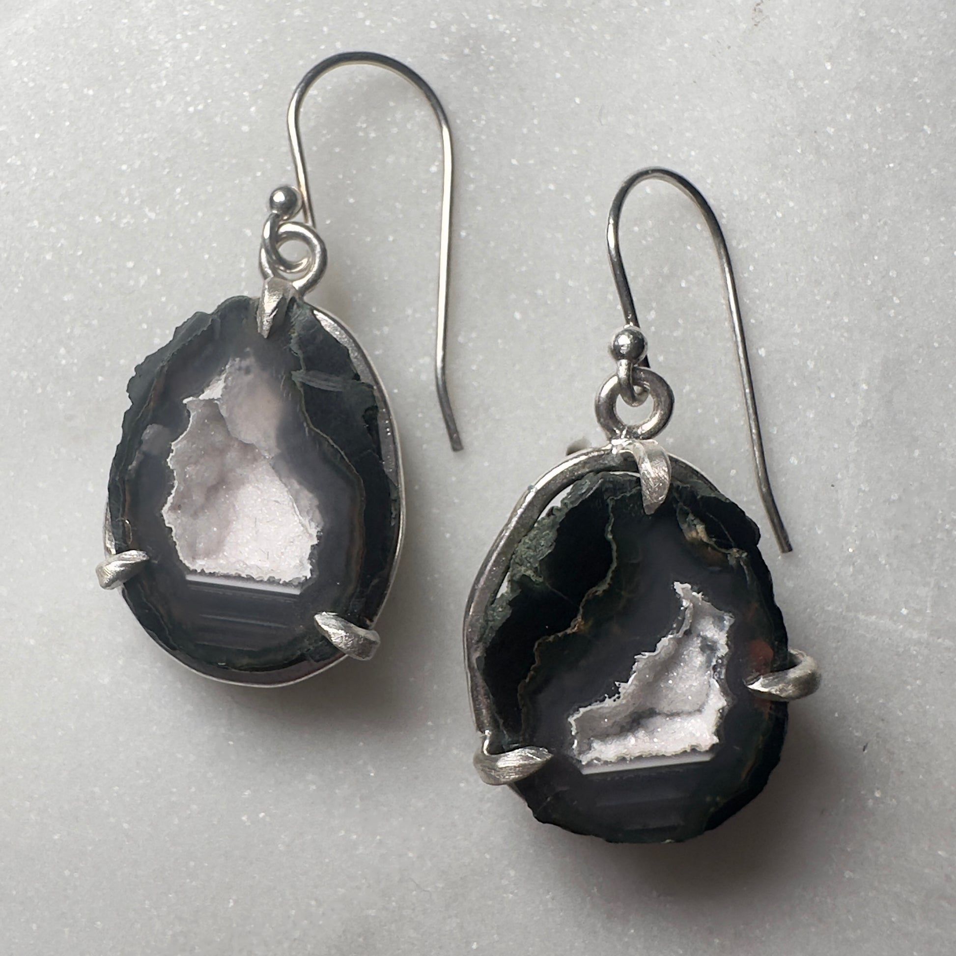 This pair of earrings feature a gorgeous two-toned pair of Tabasco Geodes, which have an unusually contrasting color palette — grey, white and black. This natural geode pair was set in a minimalist sterling silver setting, as to let the stones shine on their own and to show off the natural exterior. A comfortable, hand-wrought earring wire secures these to the ear.