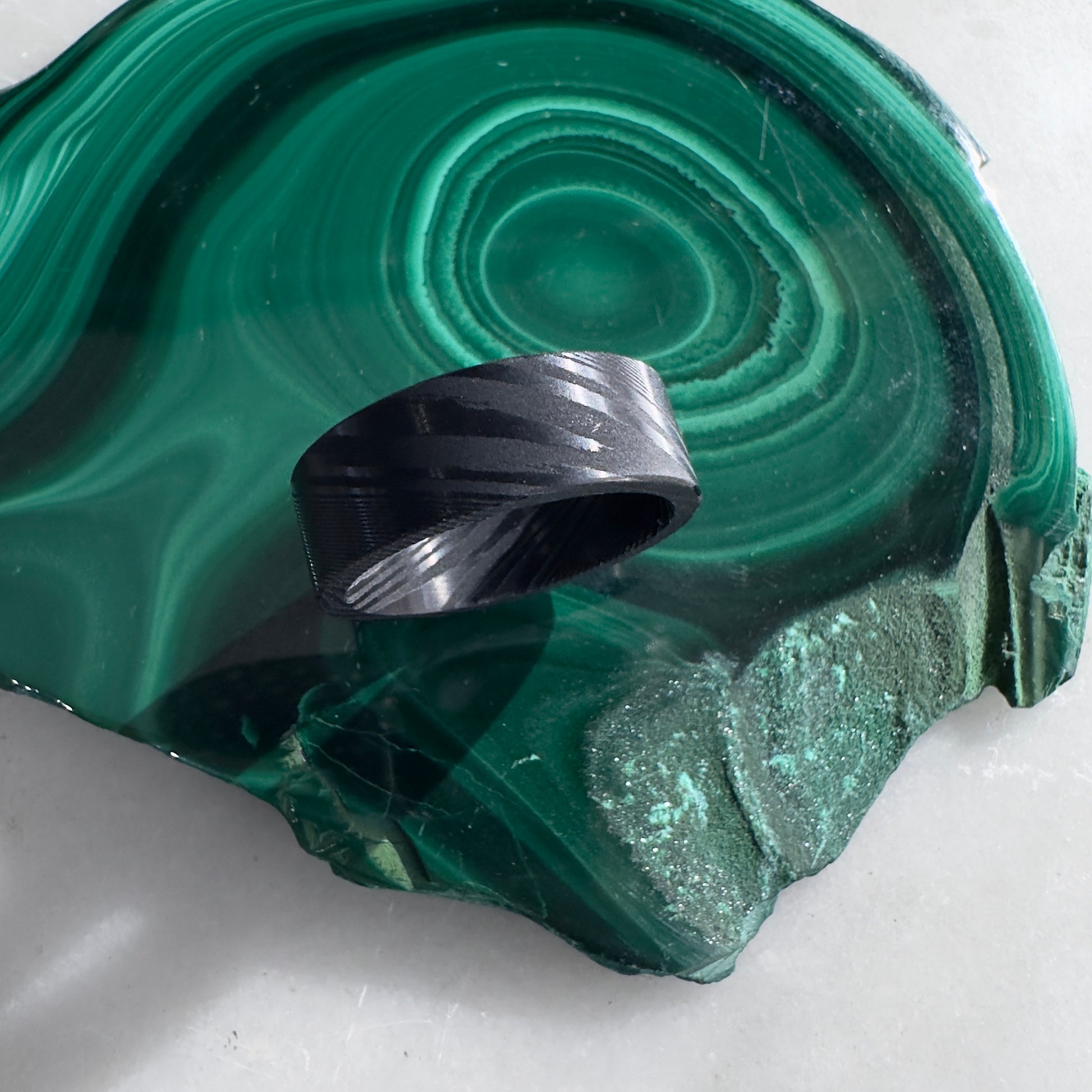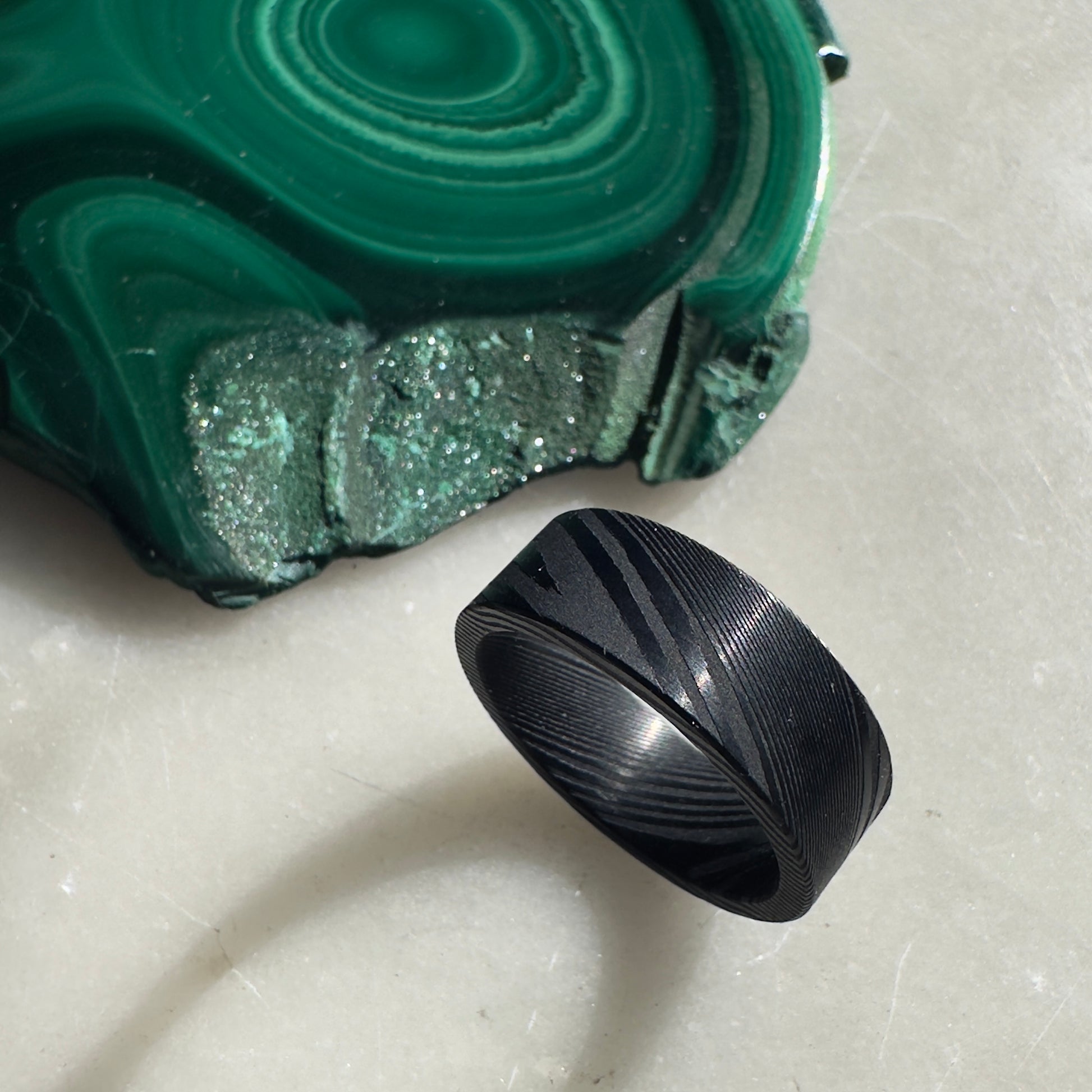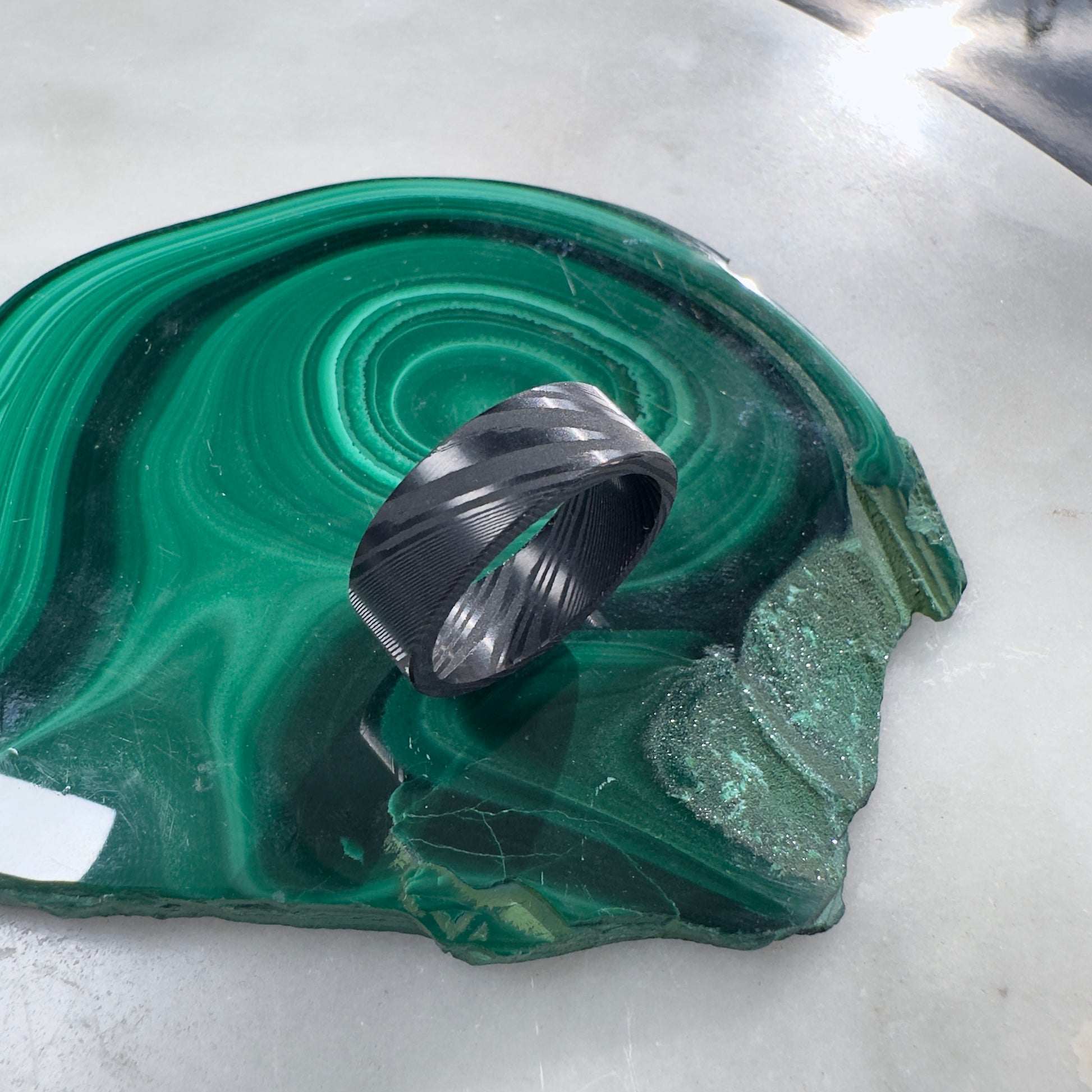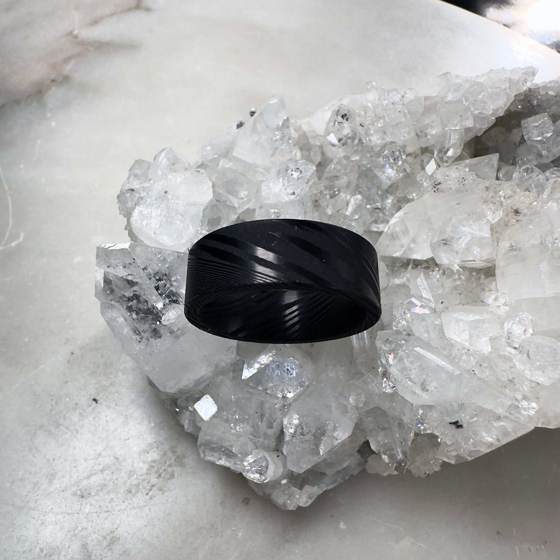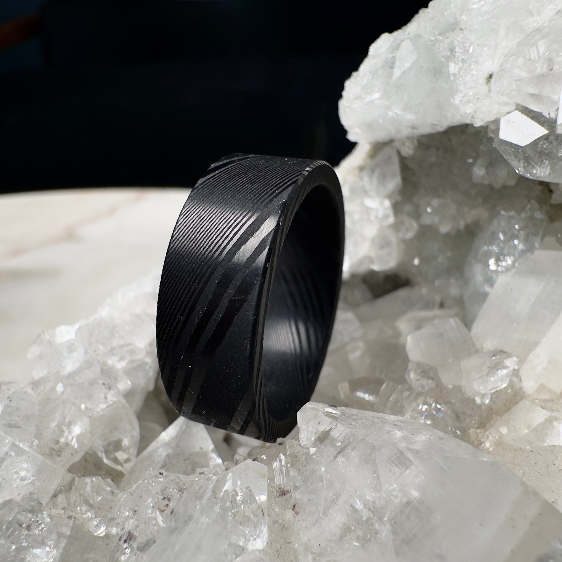 This matte-black damascus steel ring has a flat profile, and rounded interior, which we like to call comfort-fit due to its comfortable feel that will make you forget you're even wearing it!