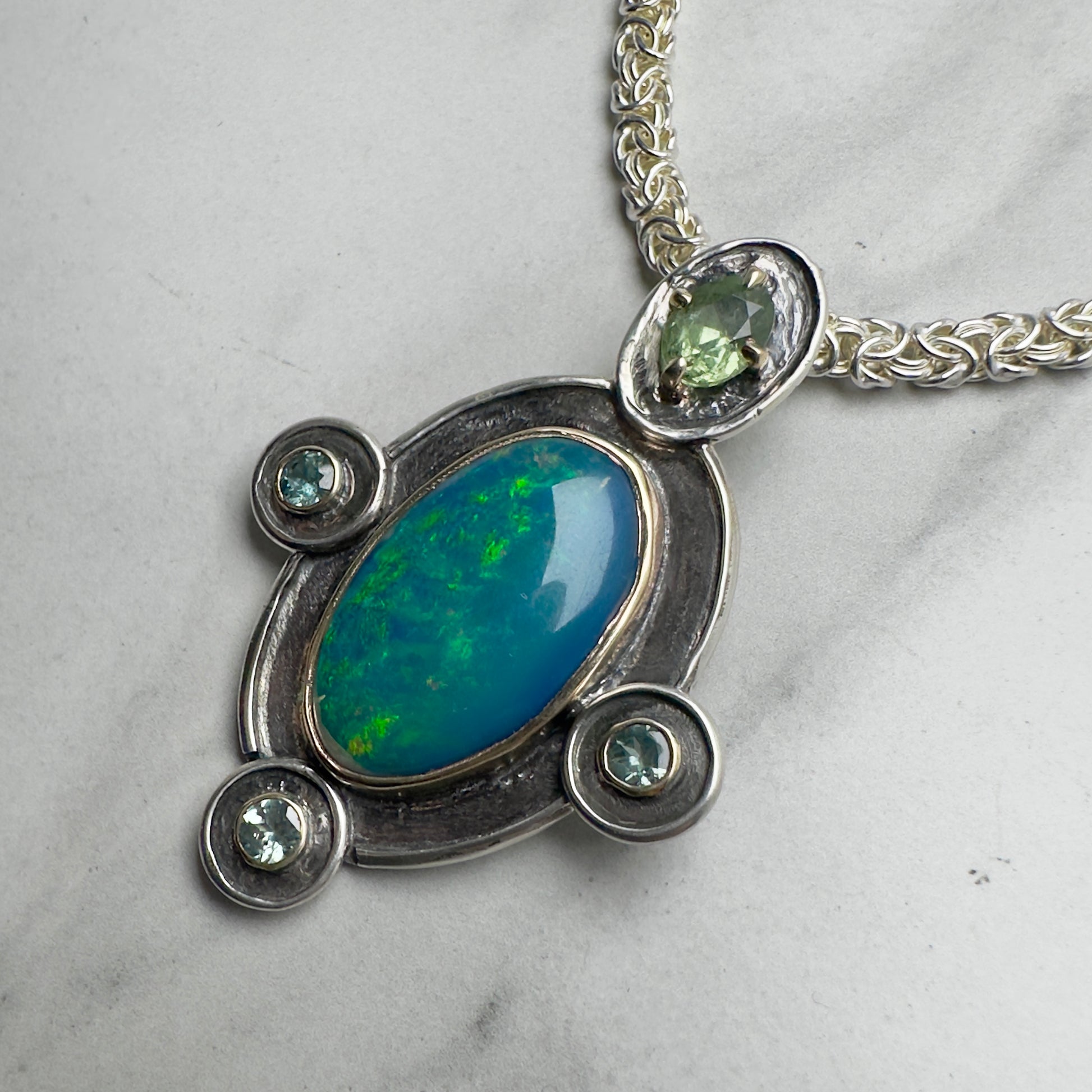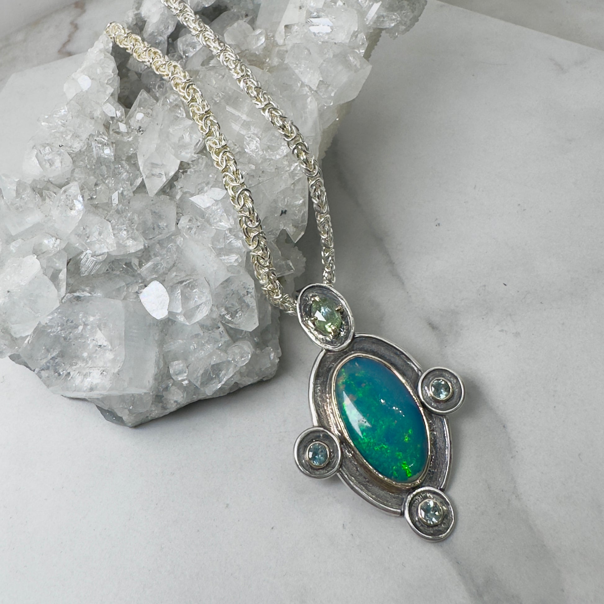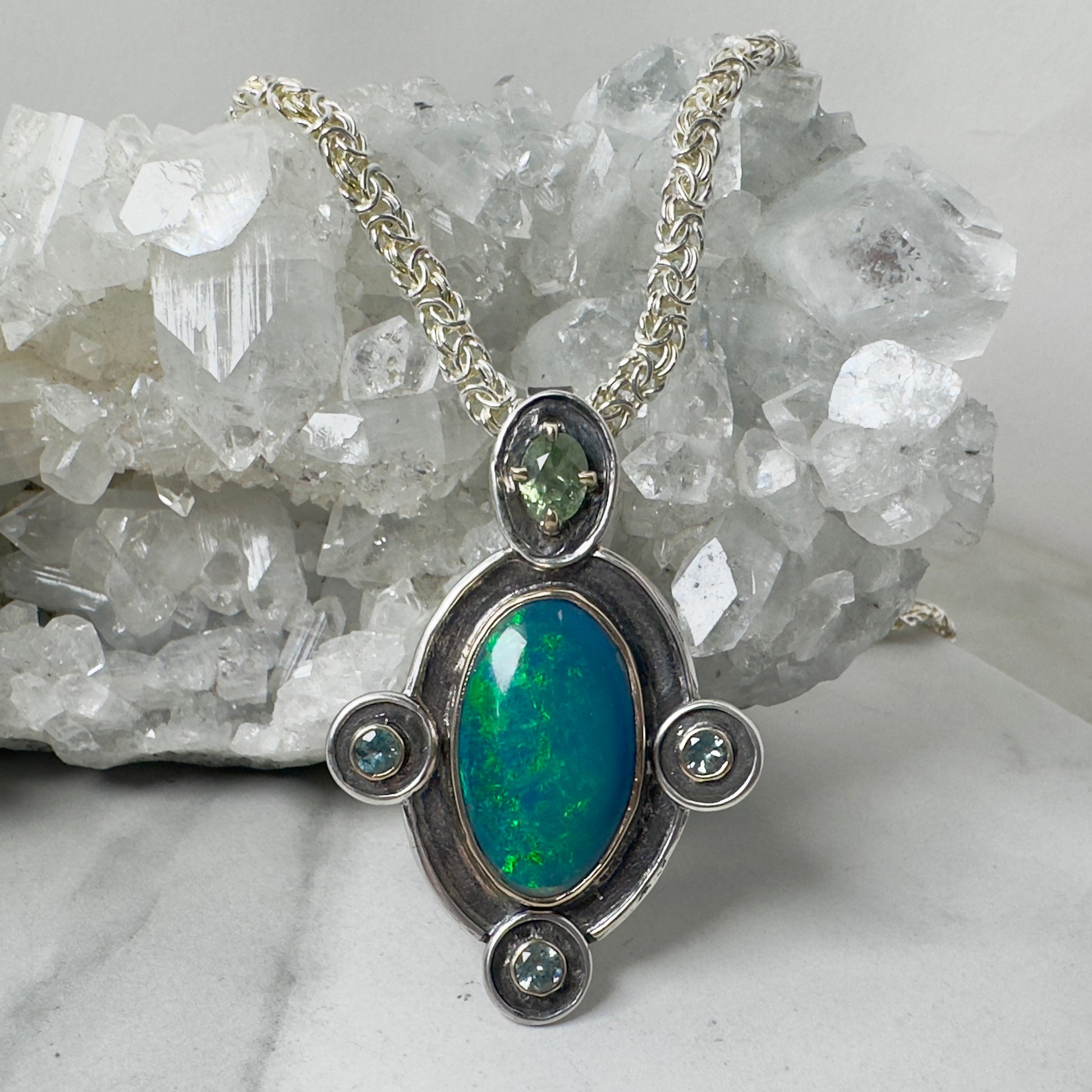 Discover a one-of-a-kind pendant showcasing an exquisite blend of gemstones: a 1.33ct Green Sapphire from Montana, three round teal-blue Montana sapphires totaling 0.97ct, and a large Australian Black Opal doublet in the center. Crafted from 14k yellow gold and granite-textured sterling silver with an oxidized patina, its design draws inspiration from the age-old allure of Caribbean shipwreck treasures. This striking piece combines timeless elegance with a story waiting to be worn. We love the pairing of it with the antique-inspired Byzantine chain, which is pictured in the photos here.