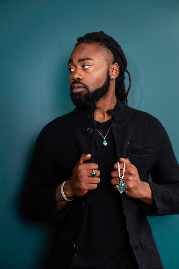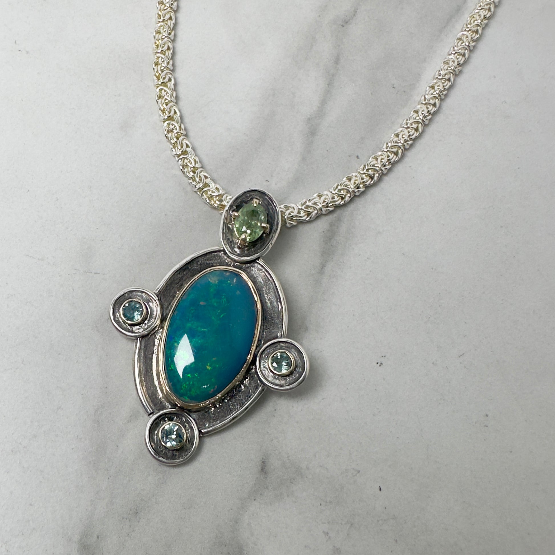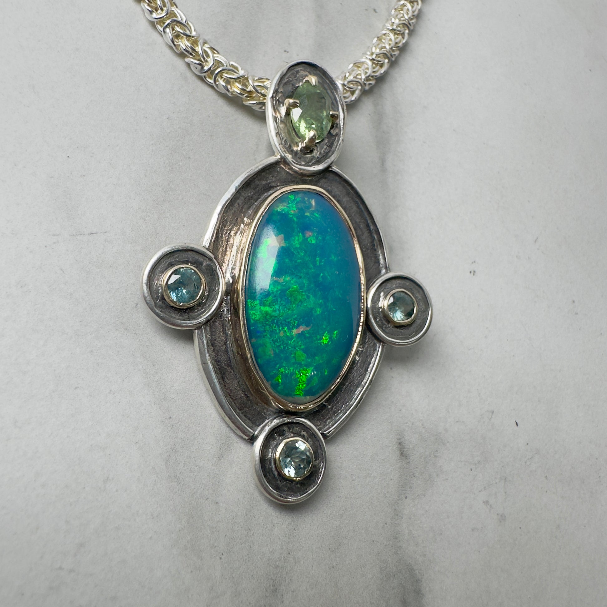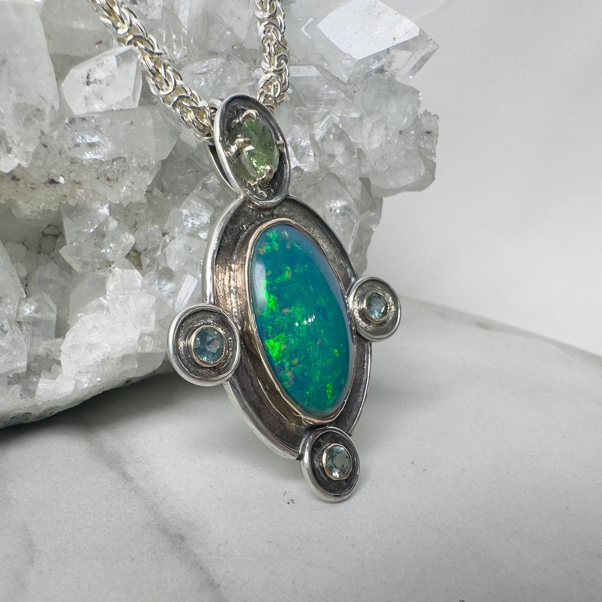 Discover a one-of-a-kind pendant showcasing an exquisite blend of gemstones: a 1.33ct Green Sapphire from Montana, three round teal-blue Montana sapphires totaling 0.97ct, and a large Australian Black Opal doublet in the center. Crafted from 14k yellow gold and granite-textured sterling silver with an oxidized patina, its design draws inspiration from the age-old allure of Caribbean shipwreck treasures. This striking piece combines timeless elegance with a story waiting to be worn. We love the pairing of it with the antique-inspired Byzantine chain, which is pictured in the photos here.