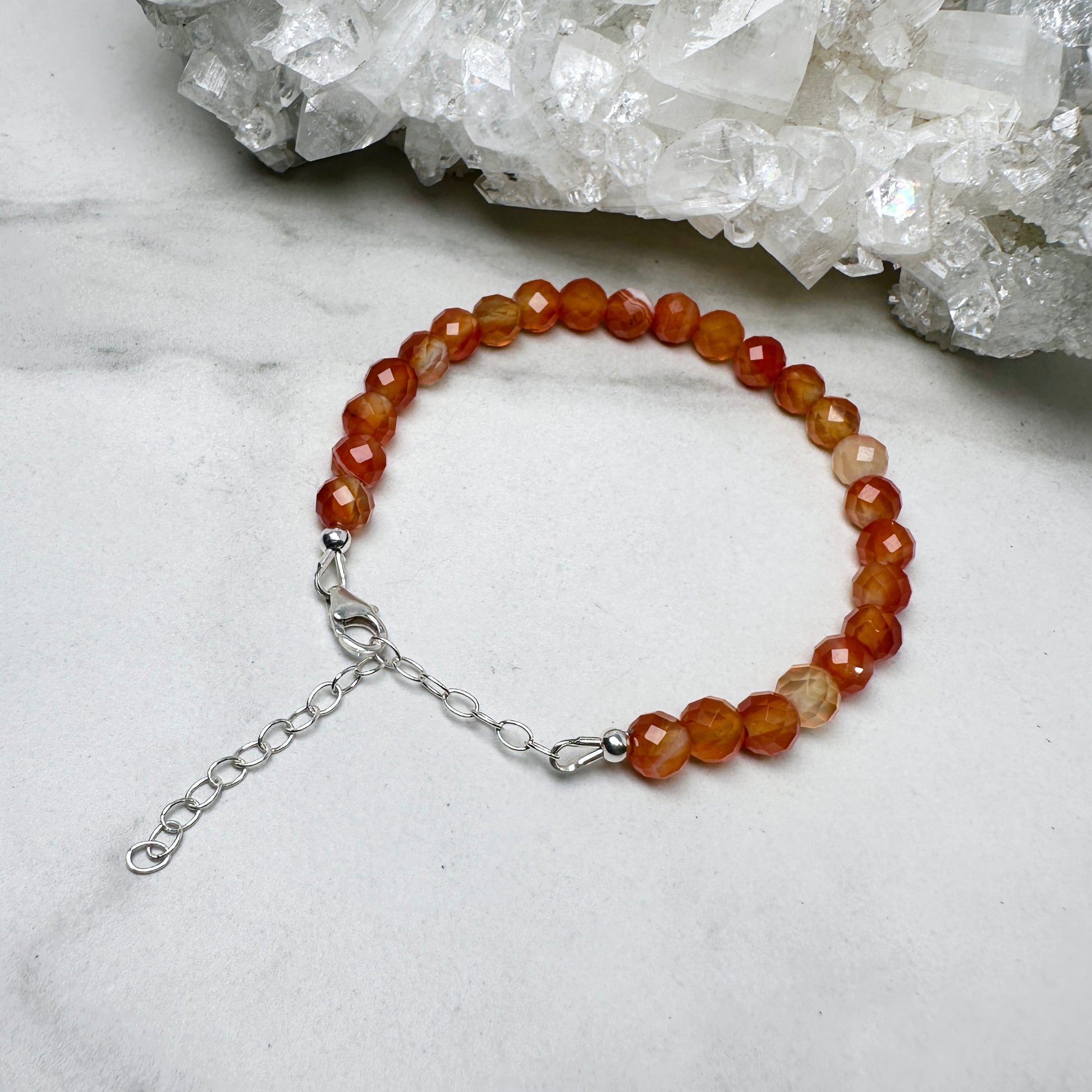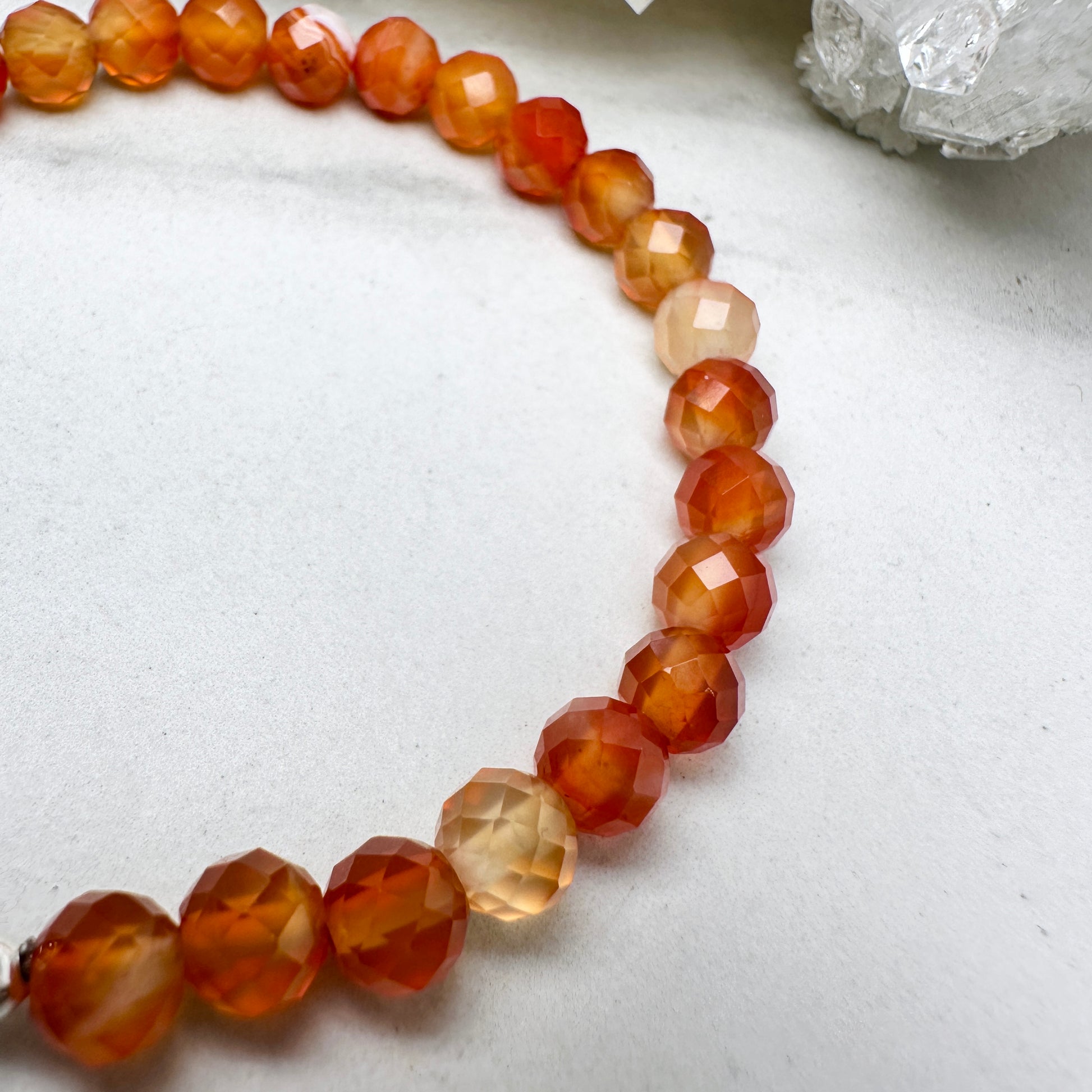 Add vibrant warmth to your look with this adjustable carnelian beaded bracelet. Featuring faceted carnelian beads that catch the light beautifully, it offers both style and meaning. Designed to fit wrists from 6 to 8 inches comfortably. Perfect for everyday wear or special occasions, this bracelet combines natural beauty with versatile comfort.
