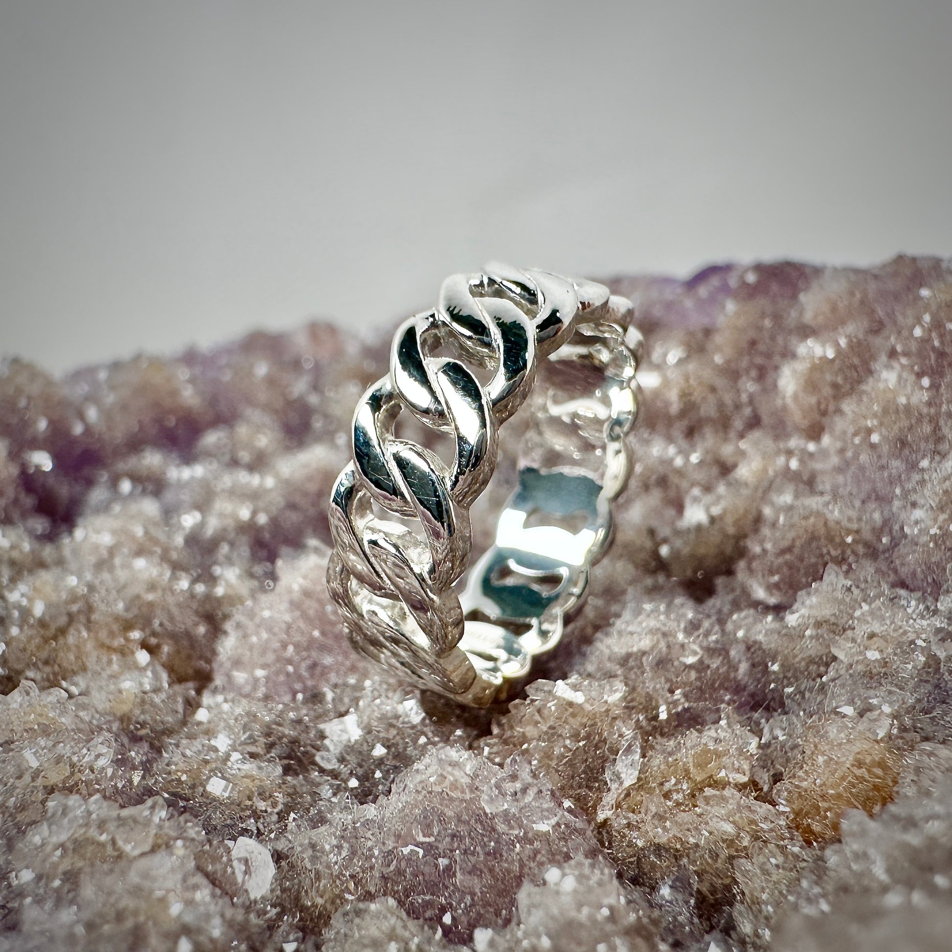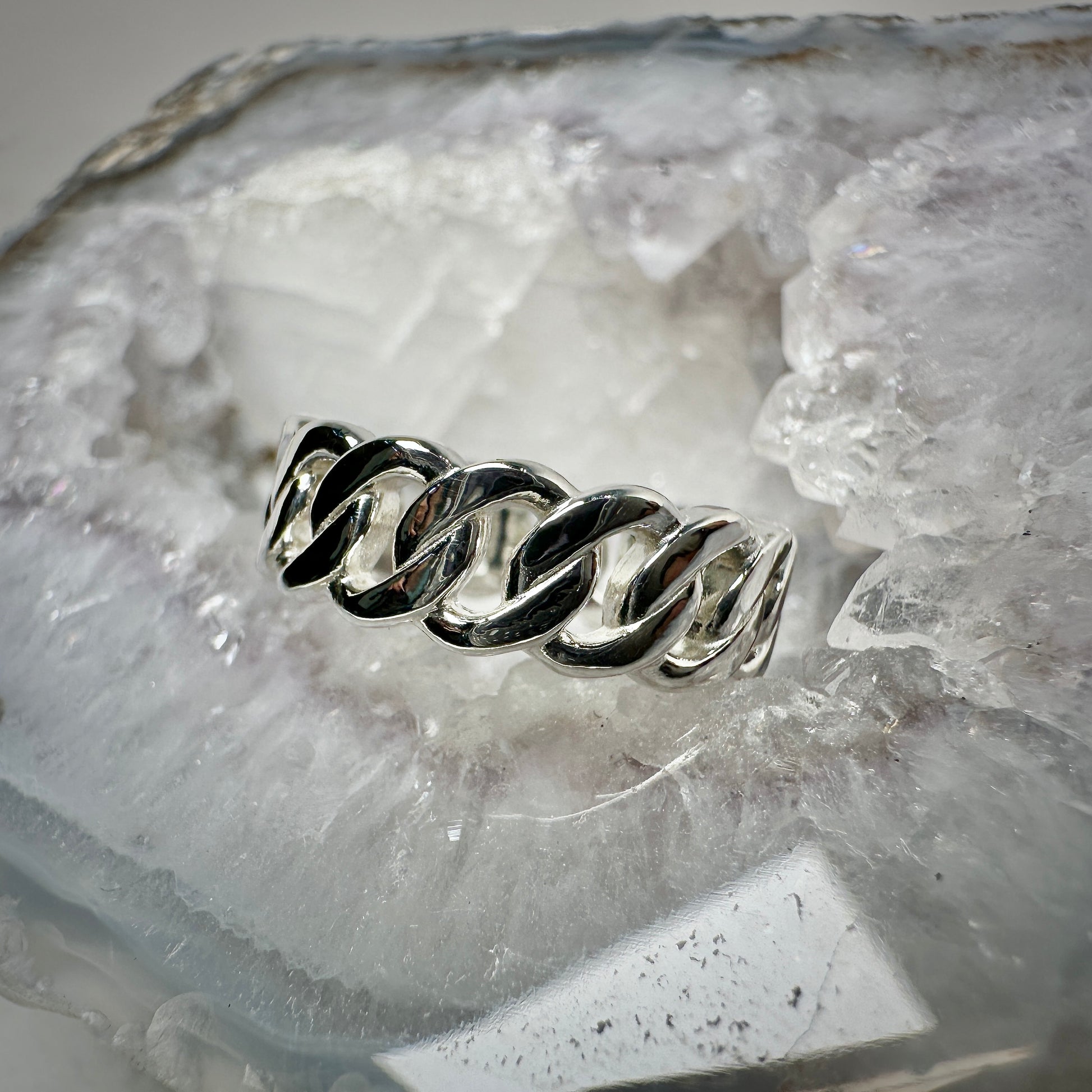 This sterling silver chain link band combines durability with modern style in a sleek, genderless design. Sized at 6.5, it offers a comfortable and versatile fit, making it an ideal accessory for any occasion. Add a touch of refined edge to your look with this timeless piece crafted to complement all styles effortlessly.