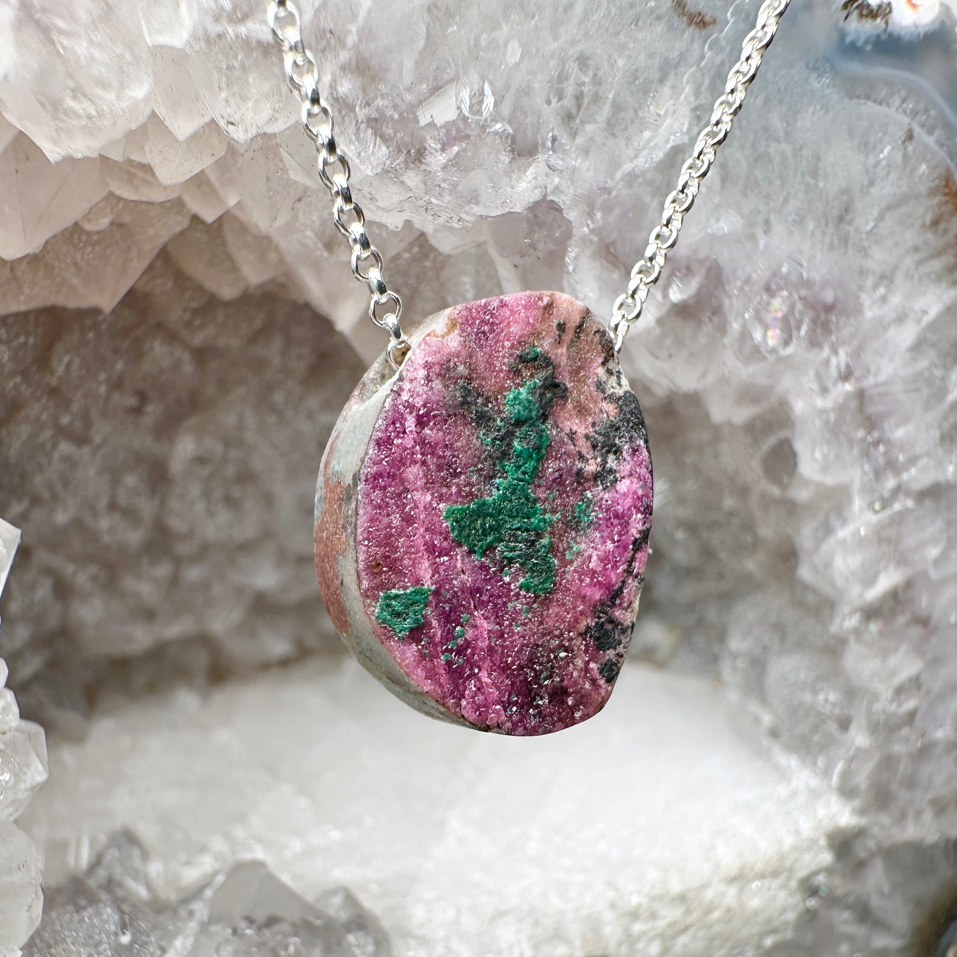This necklace showcases a truly exceptional specimen: cobaltocalcite adorned with vibrant green malachite streaking across delicate pink crystals. The striking interplay of these two minerals creates a captivating color contrast that makes each piece a one-of-a-kind treasure. Suspended from sterling silver, this pendant celebrates the natural artistry found in rare mineral combinations.