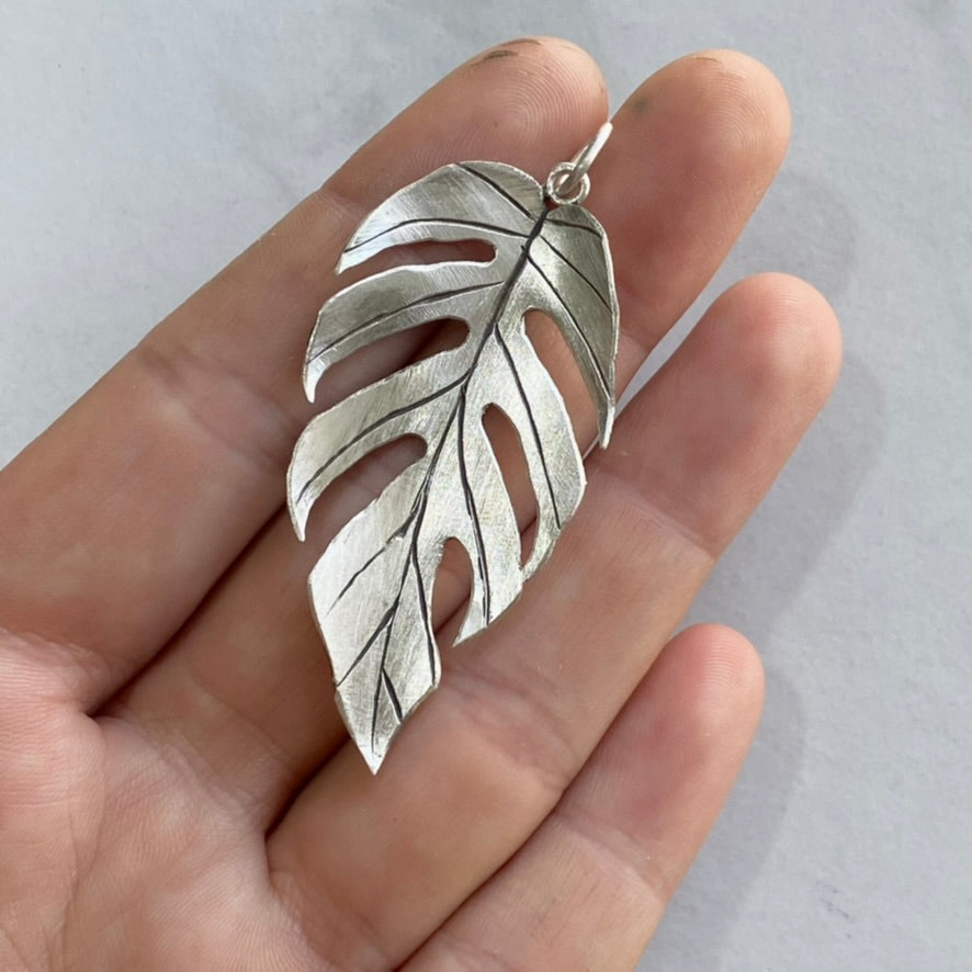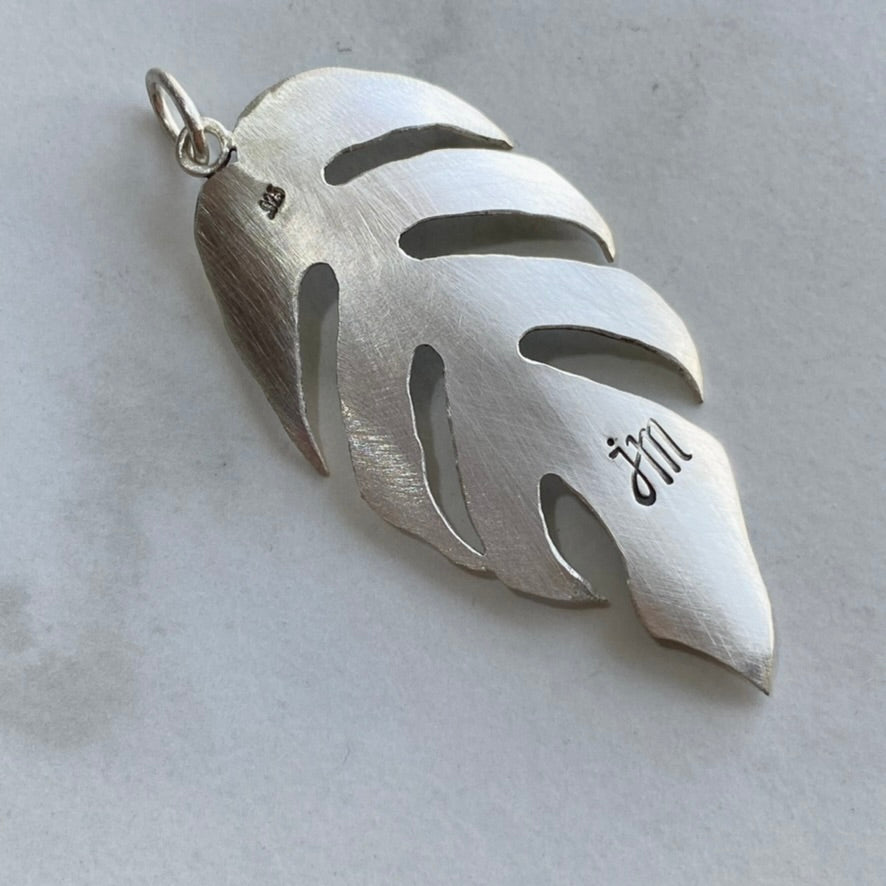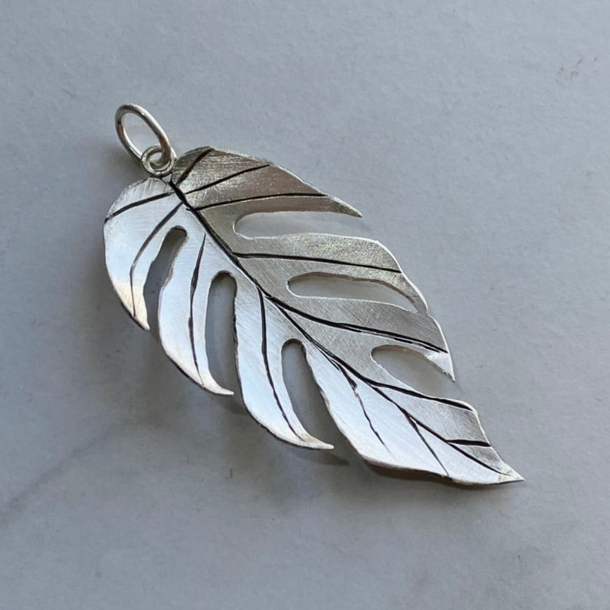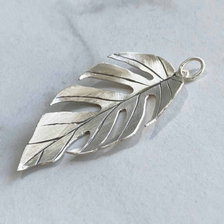 This feather-like leaf pendant is modeled after a plant in the aroid family, Epipremnum Pinnatum 'Cebu Blue'. It received this nickname because it was originally found in Cebu Island in the Philippines. As the plant grows vertically, like many other aroids, it develops more and more mature leaves. The leaf that this piece is modeled after is a great example of the fenestrations that appear when given the opportunity to climb.