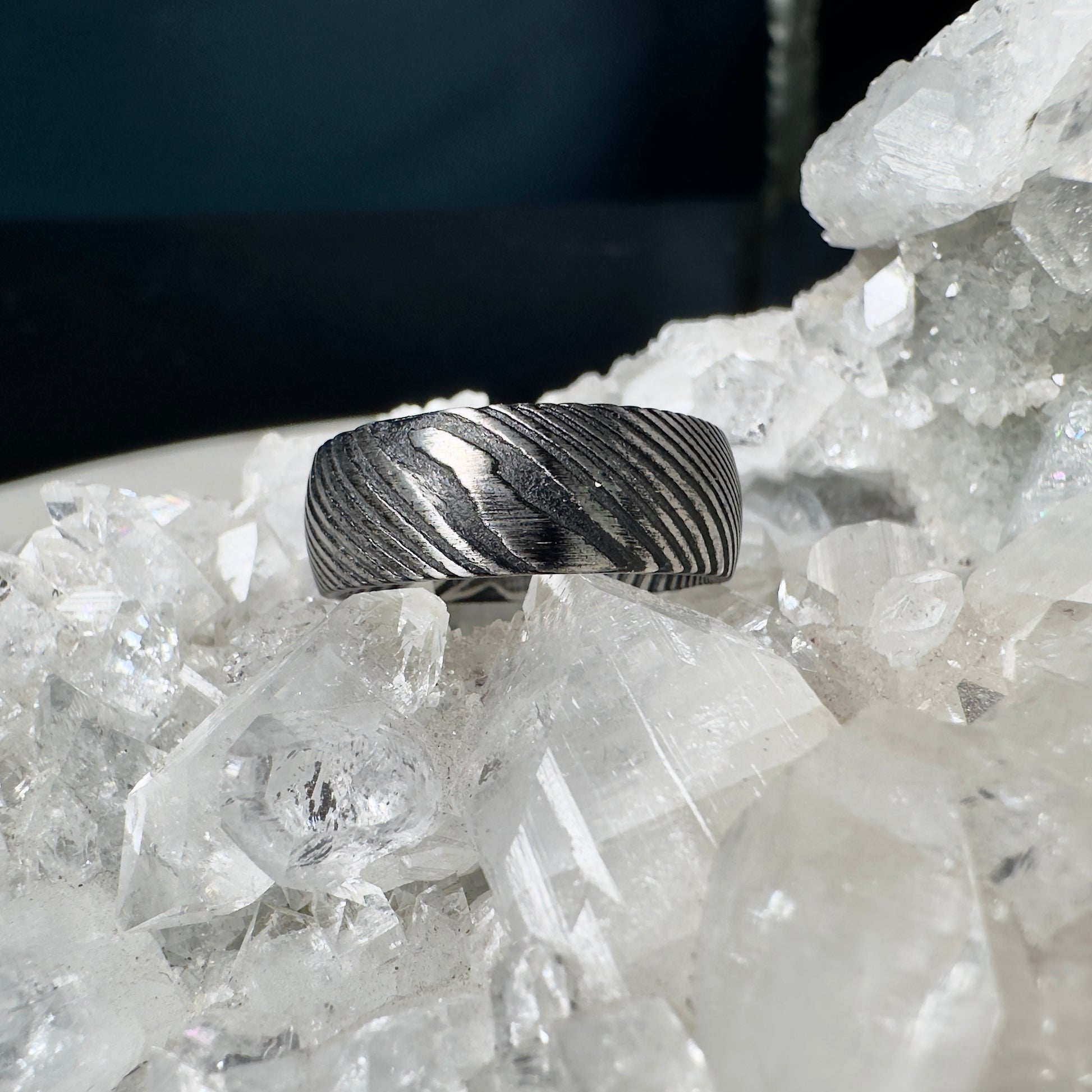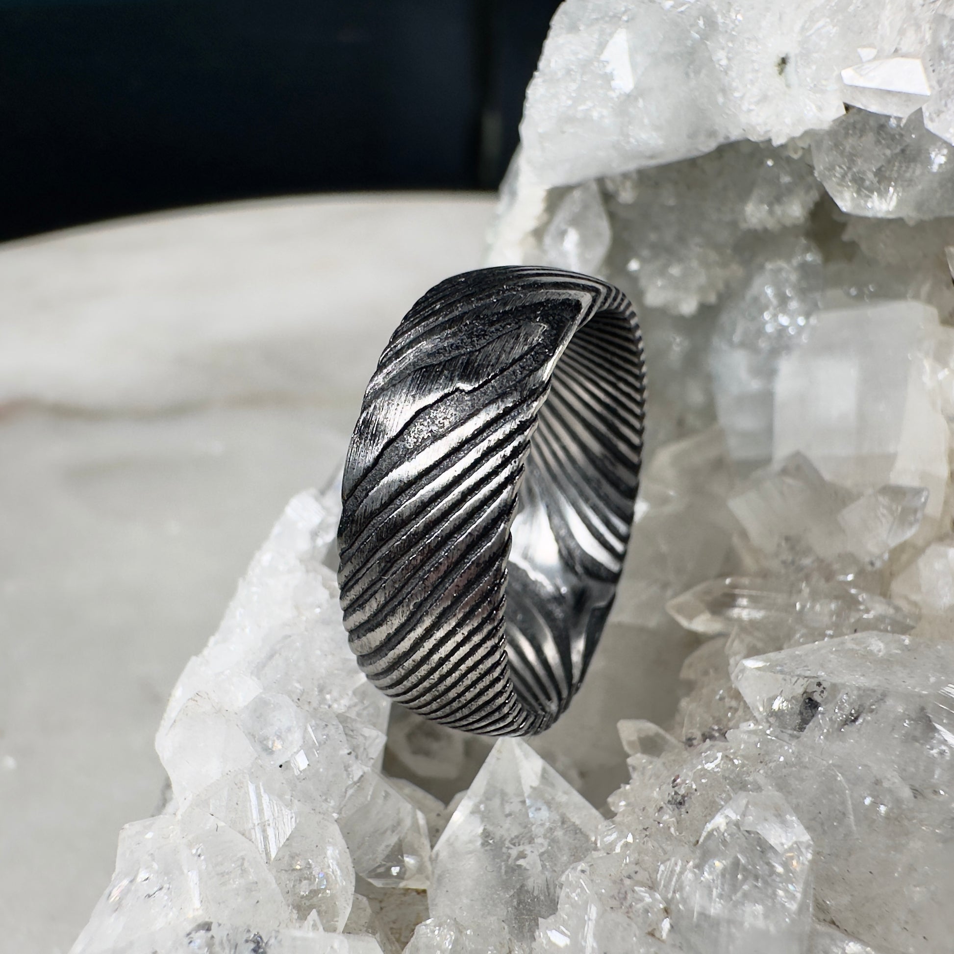 This richly textured band is made from damascus steel, which is a durable and unique material that has been around for centuries. Known for its use in knife making and bladesmithing, it has recently been incorporated into jewelry by innovative jewelers all over the world. This particular band is 8mm wide, and features a half round profile. It is comfort fit on the inside of the band, which means it's extra smooth and rounded, which will make you forget it's even on your finger!