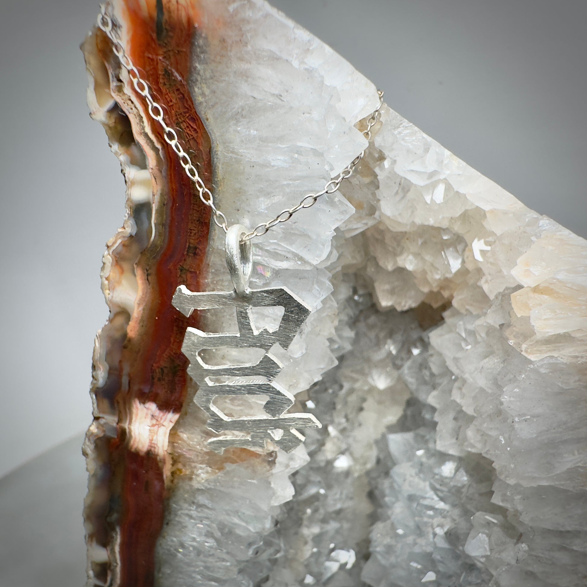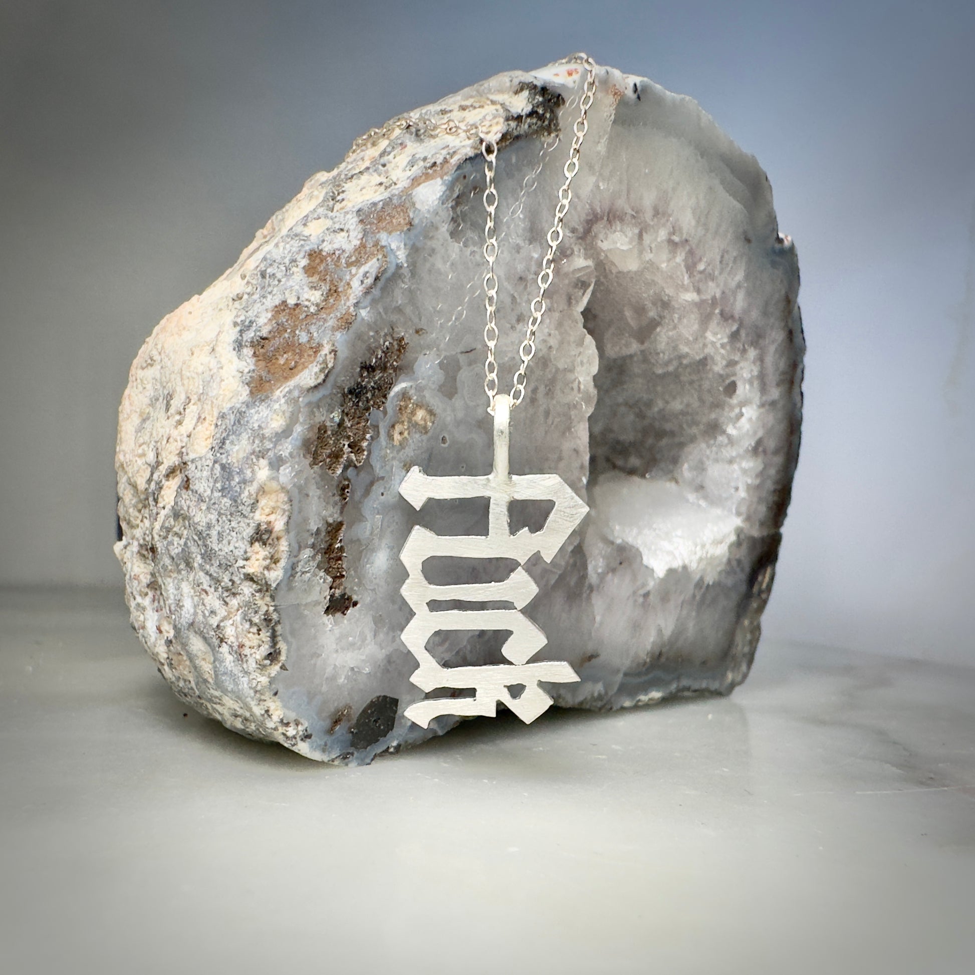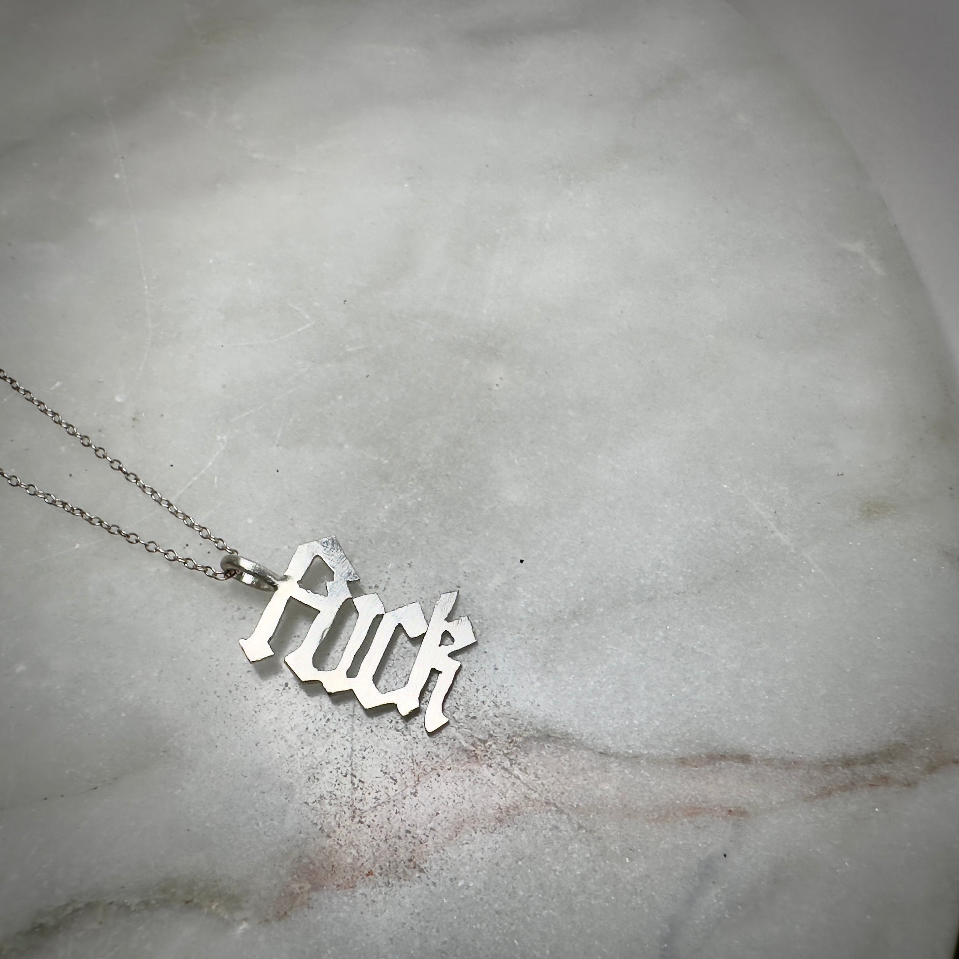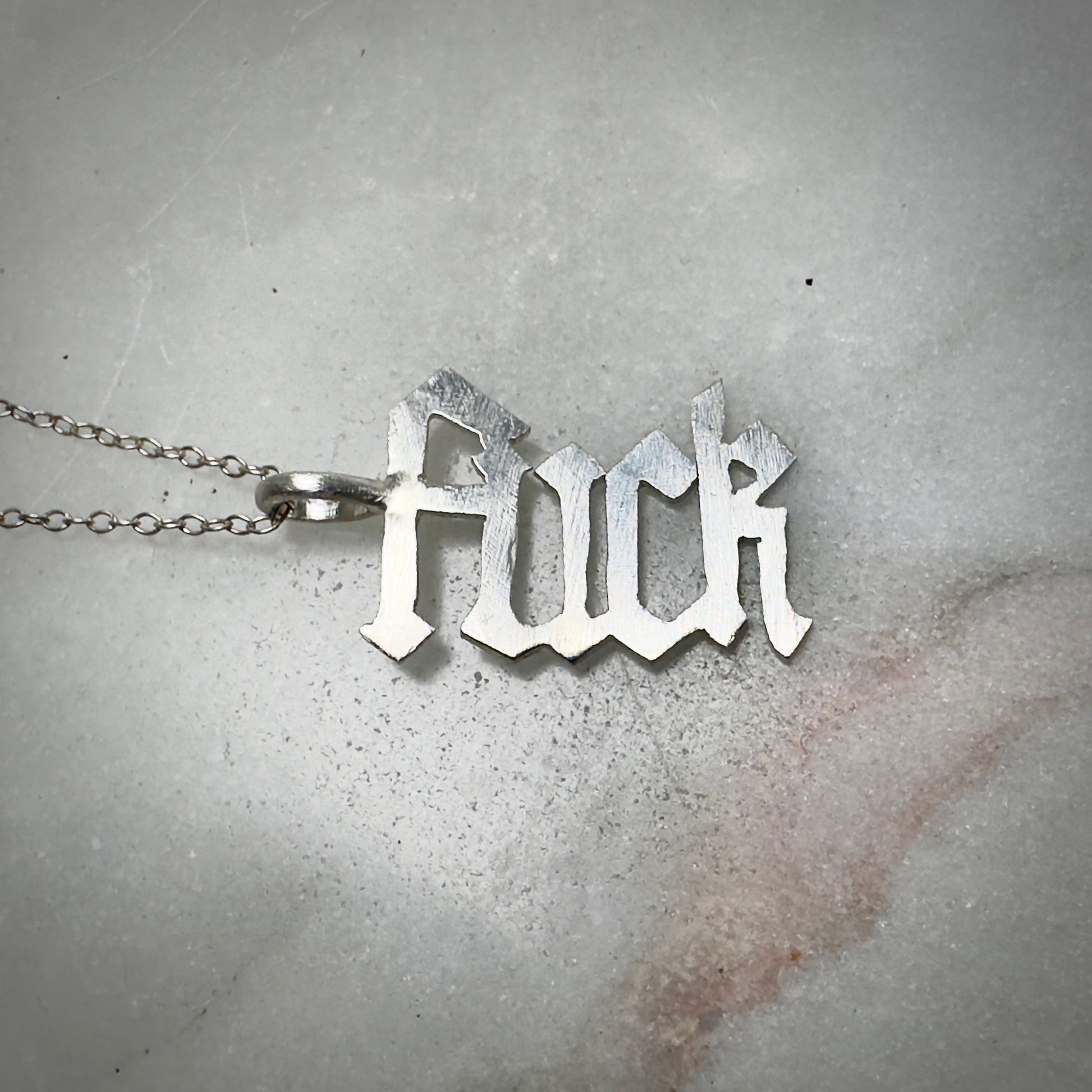This beautifully crass pendant features a hand-cut name plate with the word fuck, which is in a gothic-style font. It hangs from your chain of choice with a teardrop shaped bail, which is large enough to accommodate most chain sizes. This pendant would be perfect to layer with other pieces, or worn by itself, whatever is speaking to you! The styling possibilities are endless. It is made from solid sterling silver and due to the handmade nature of this design, each piece is slightly different.