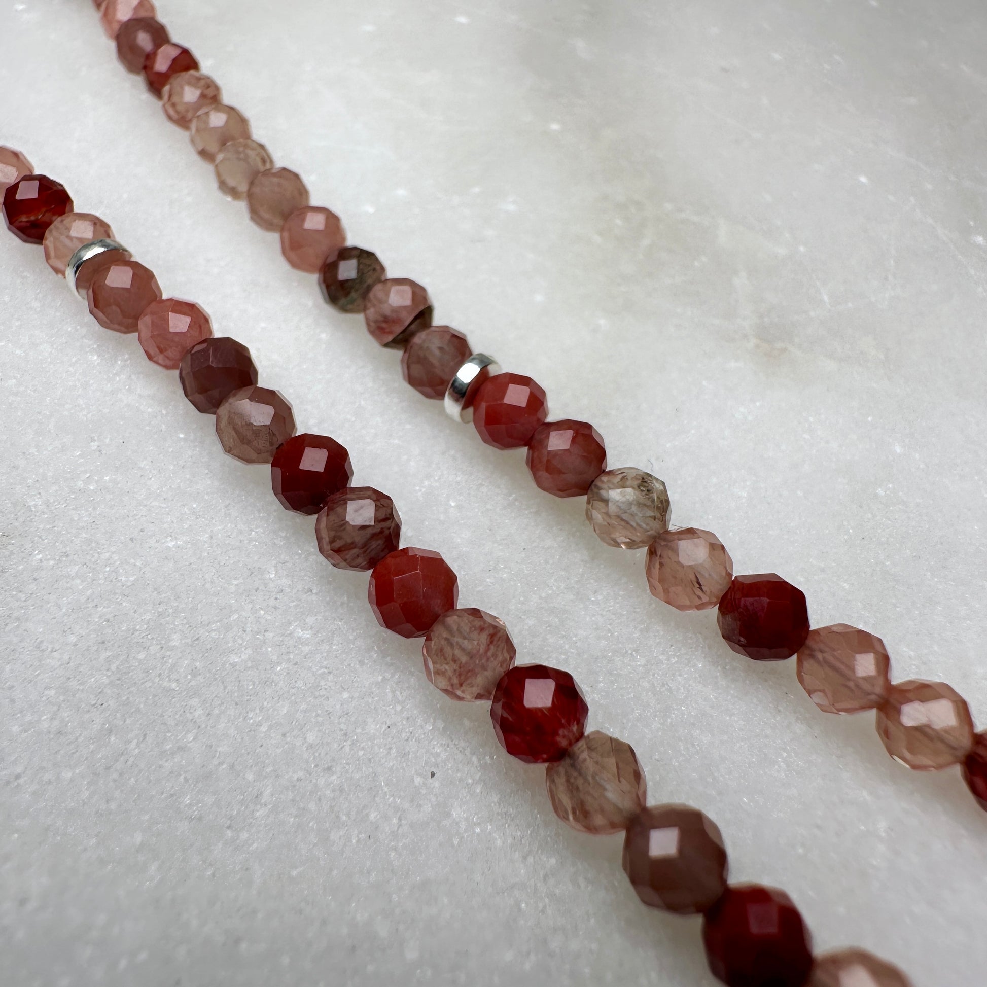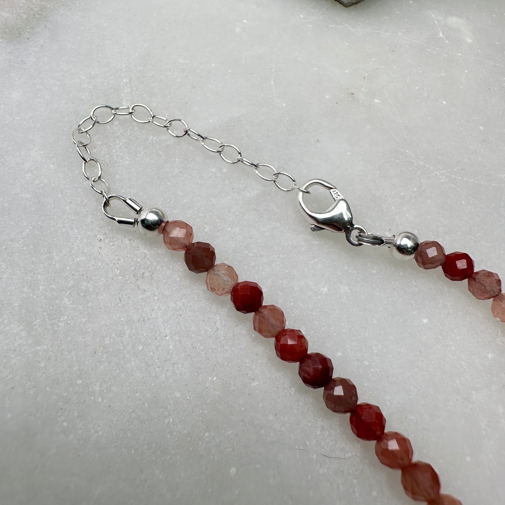 Warm your collection with this radiant necklace featuring faceted natural Andesine gemstone beads that glow with rich orange-yellow and crimson hues. Also known as red labradorite, these gemstones capture light beautifully, shifting subtly with every movement. Secured on stainless steel cable with solid sterling silver hardware and a generous cable chain extender, this piece offers remarkable versatility—wear it long for an elegant layered look or wrap it around your wrist several times to transform it into a statement bracelet. Truly a multi-purpose treasure.