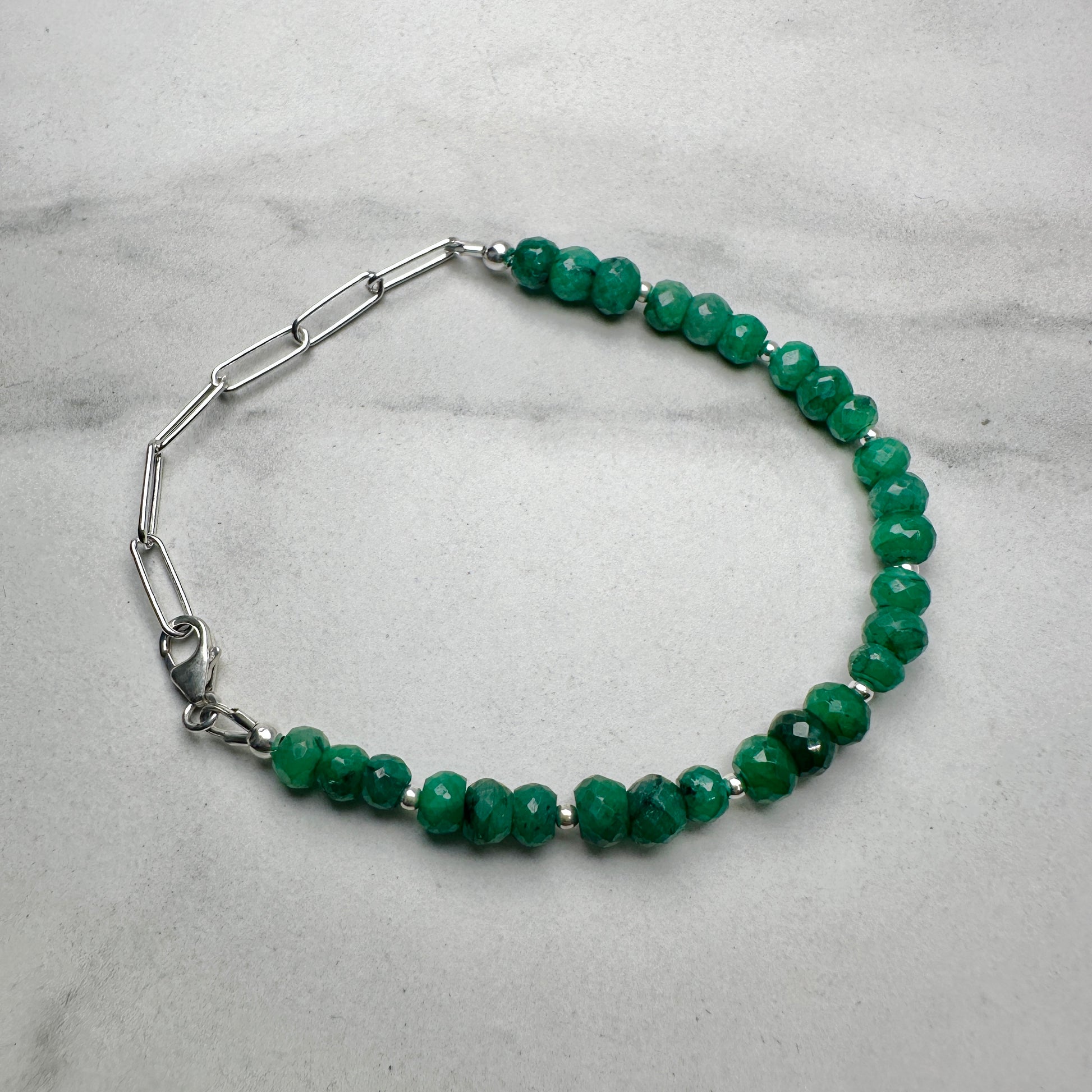 This faceted emerald beaded bracelet features vibrant green stones accented with polished sterling silver beads for a refined touch. Adjustable from 5 to 7.5 inches, it offers a comfortable, customizable fit. Perfect for layering or wearing alone, this bracelet adds a sophisticated splash of color and timeless elegance to any outfit.