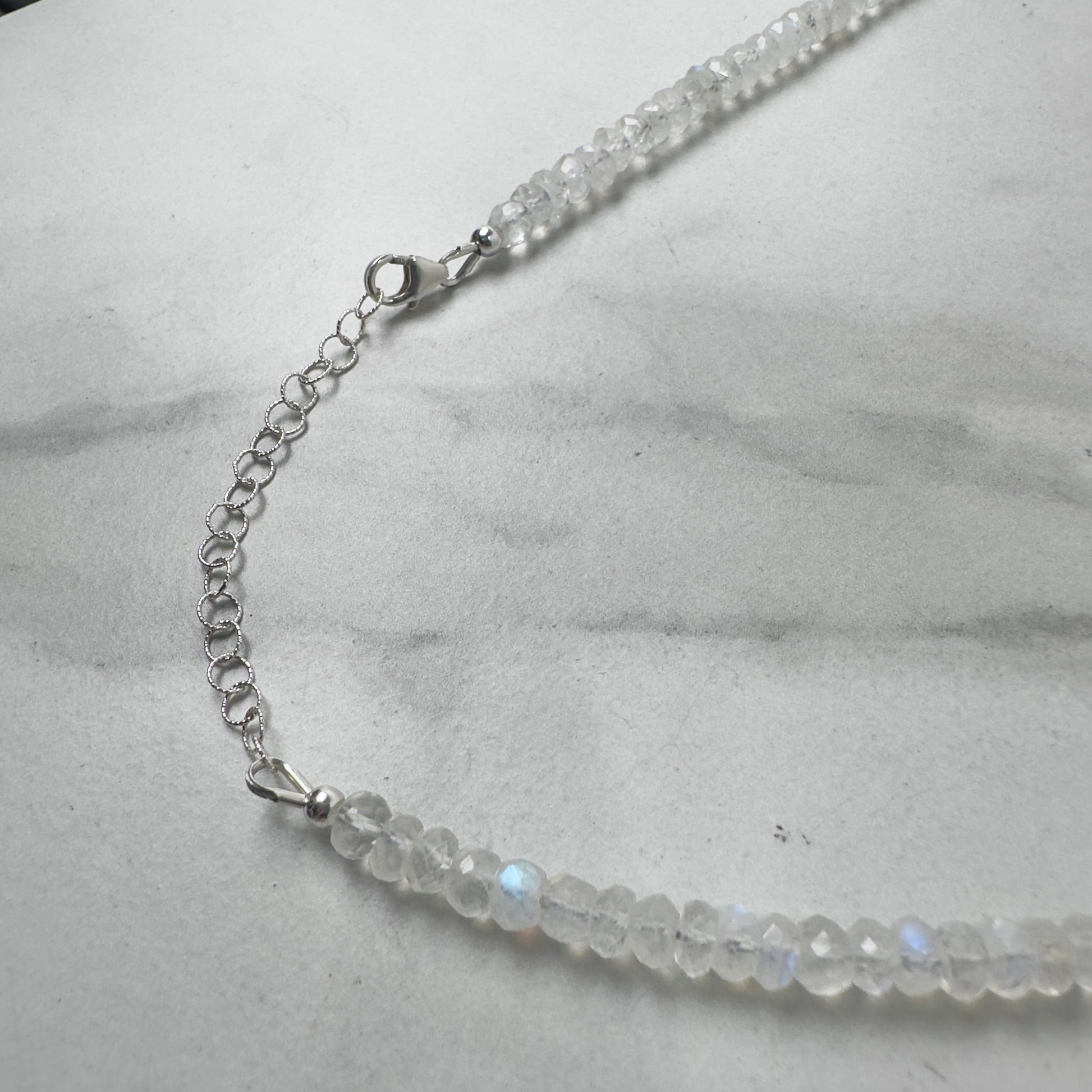 This elegant necklace showcases faceted moonstone beads threaded on a durable stainless steel cable, finished with a sterling silver clasp. Its adjustable length ranges from 15.5 to 17.5 inches, offering versatile styling options perfect for layering with your favorite pieces.