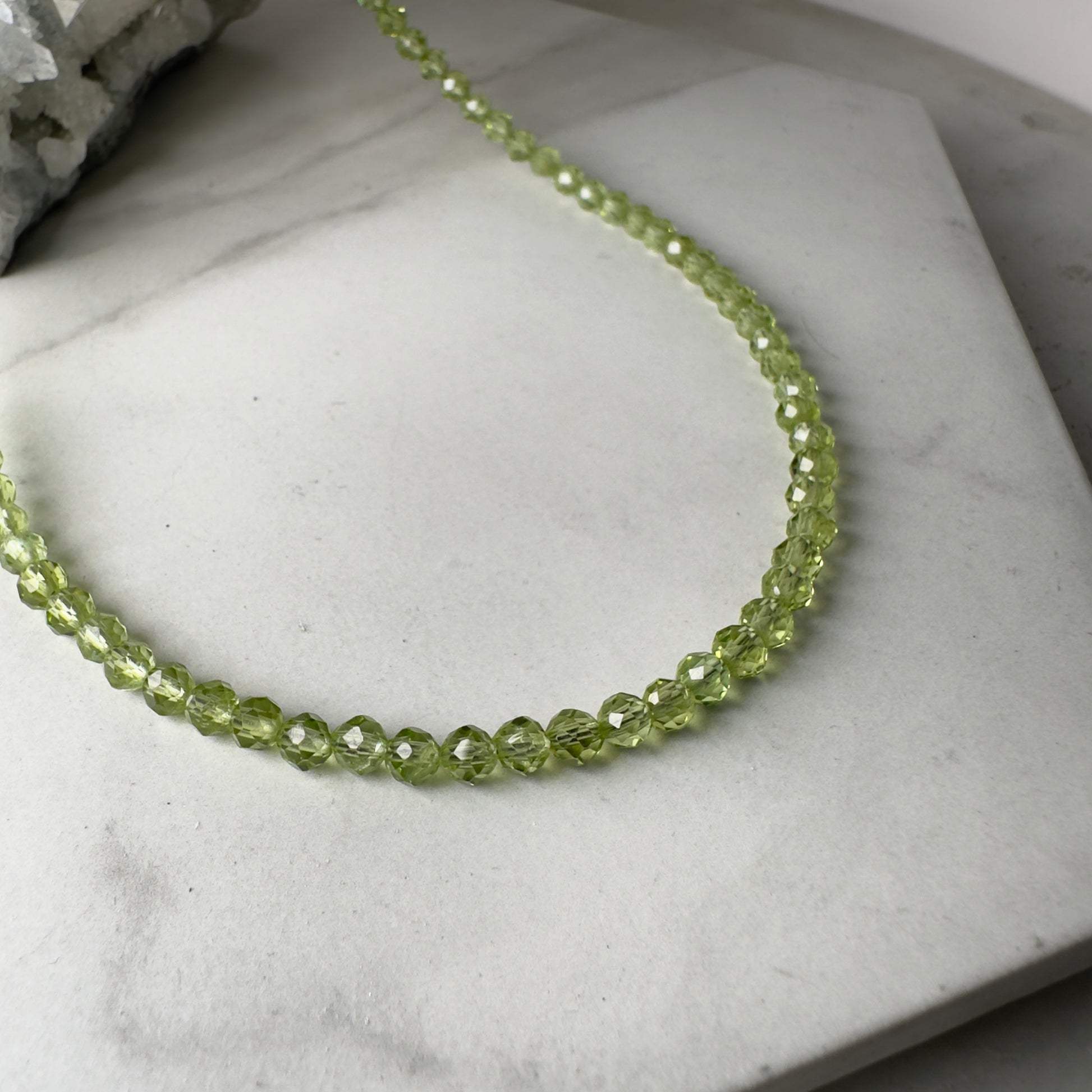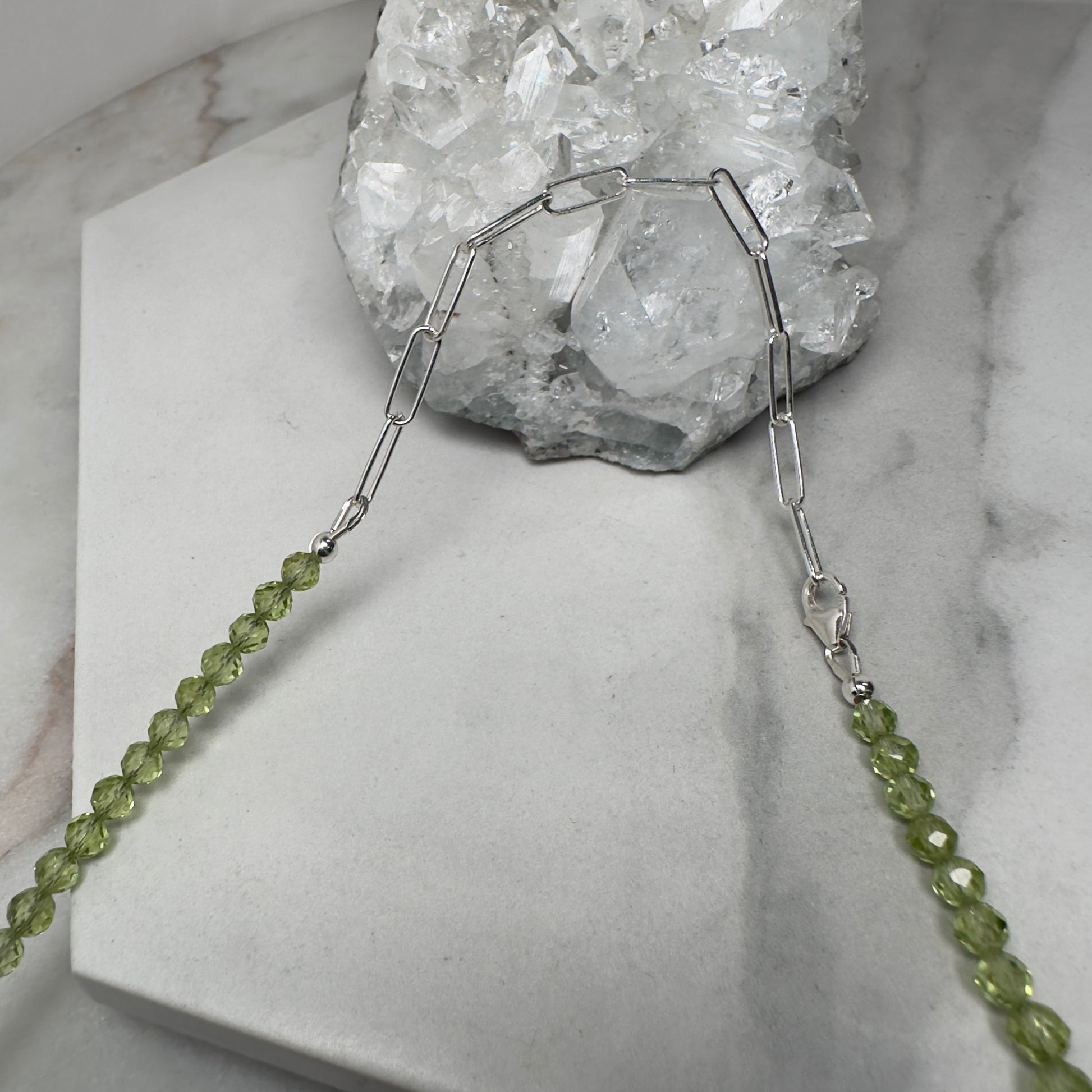 This necklace features faceted peridot beads strung on a stainless steel cable, with a sterling silver clasp. The length is adjustable and can be worn from 16 to 20 inches, making it great for layering.