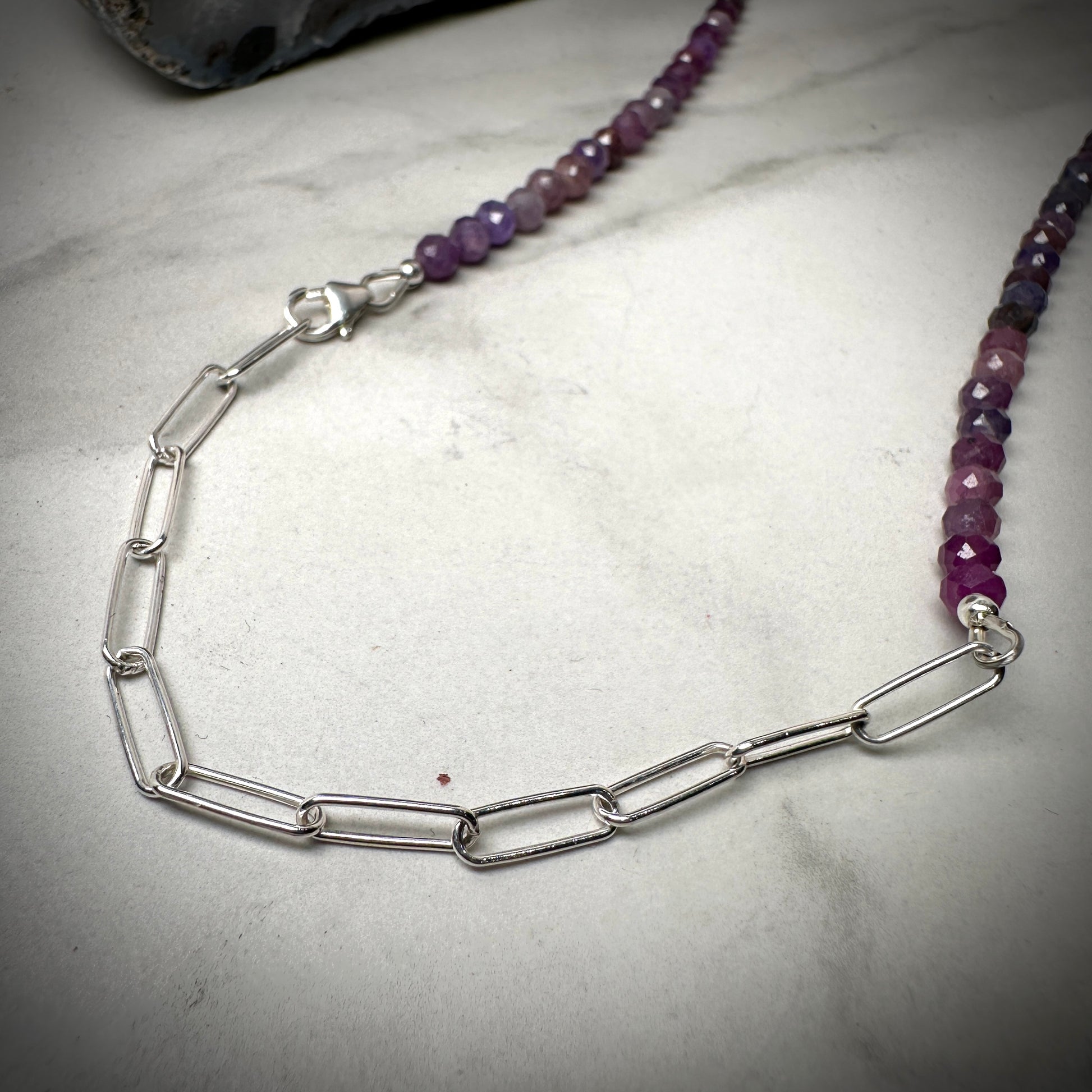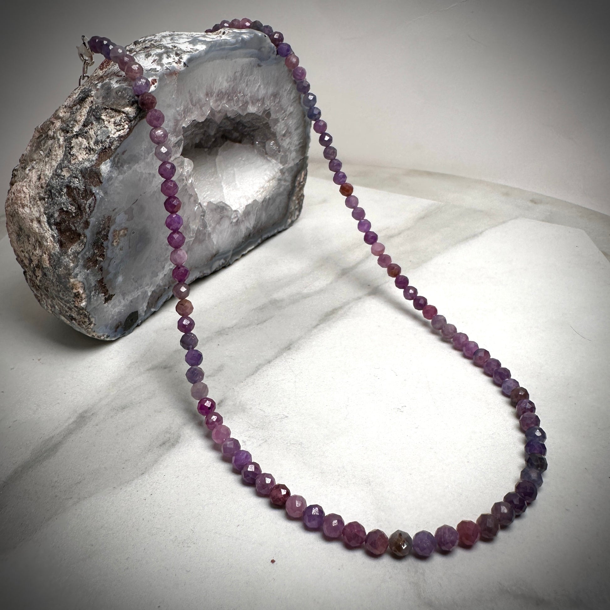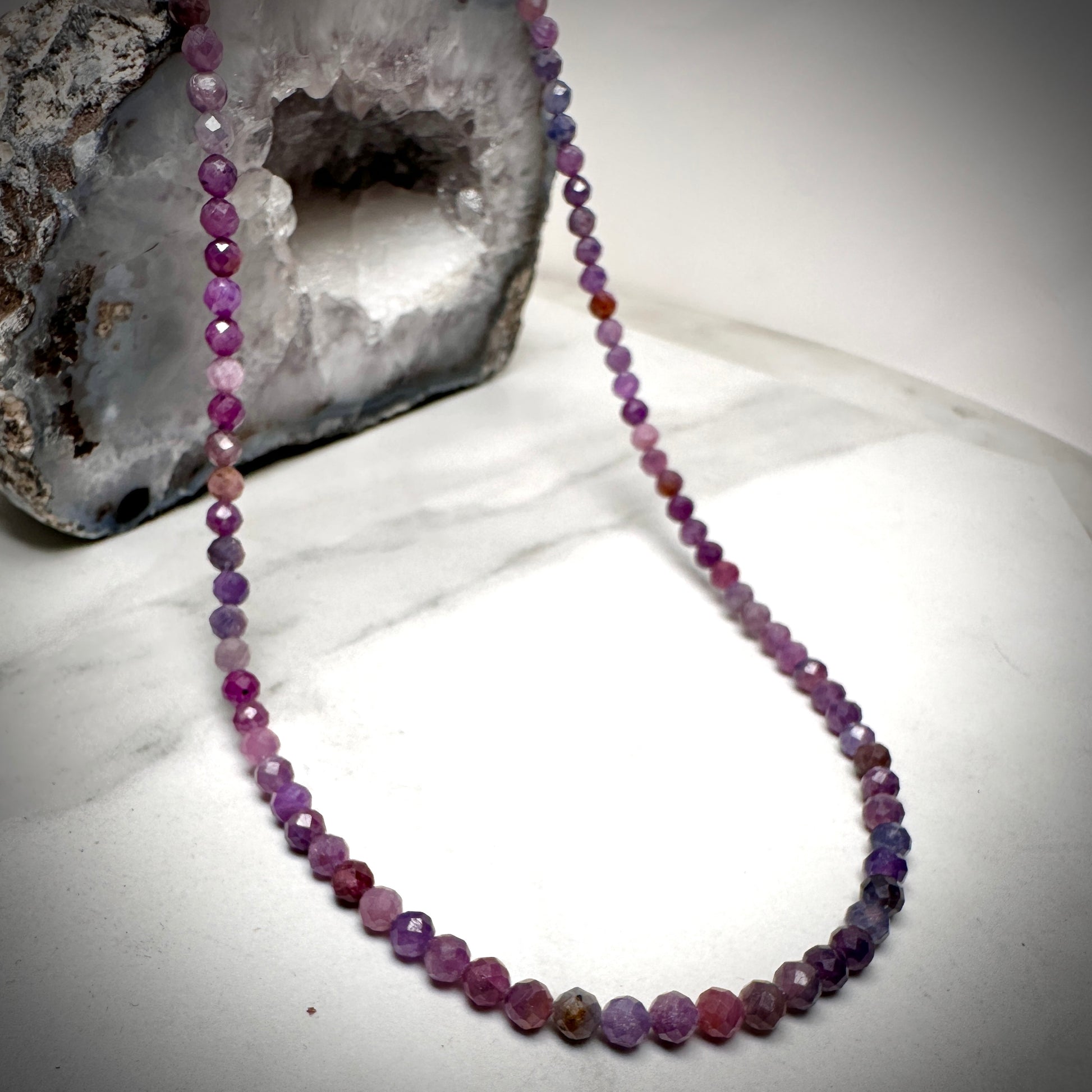 This necklace features a gorgeous variety of naturally occurring colors of ruby! Each bead was carefully faceted to bring out its best sparkle, and then strung onto a stainless steel cable so it can be worn for years to come! The strand is finished with a paperclip chain and sterling silver findings. Its length is adjustable from 16” to 20”, making it a truly versatile piece and easily layer-able.