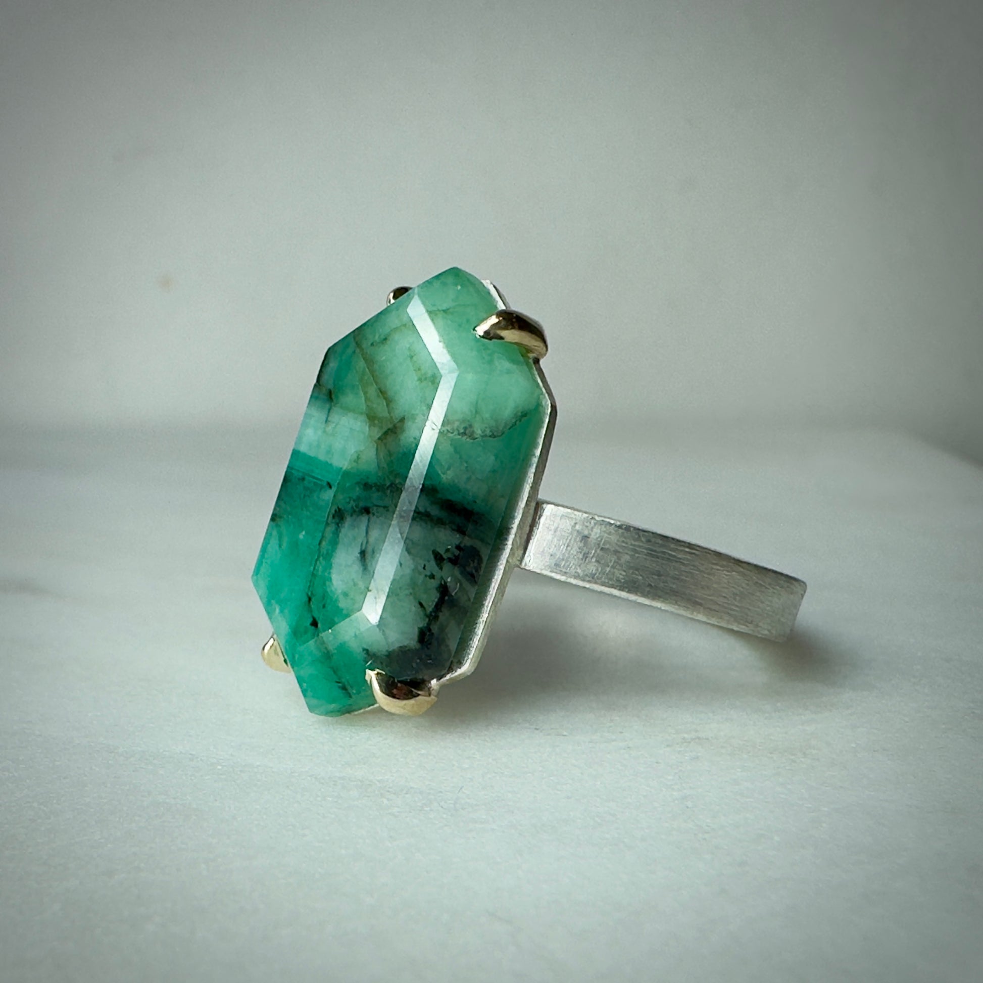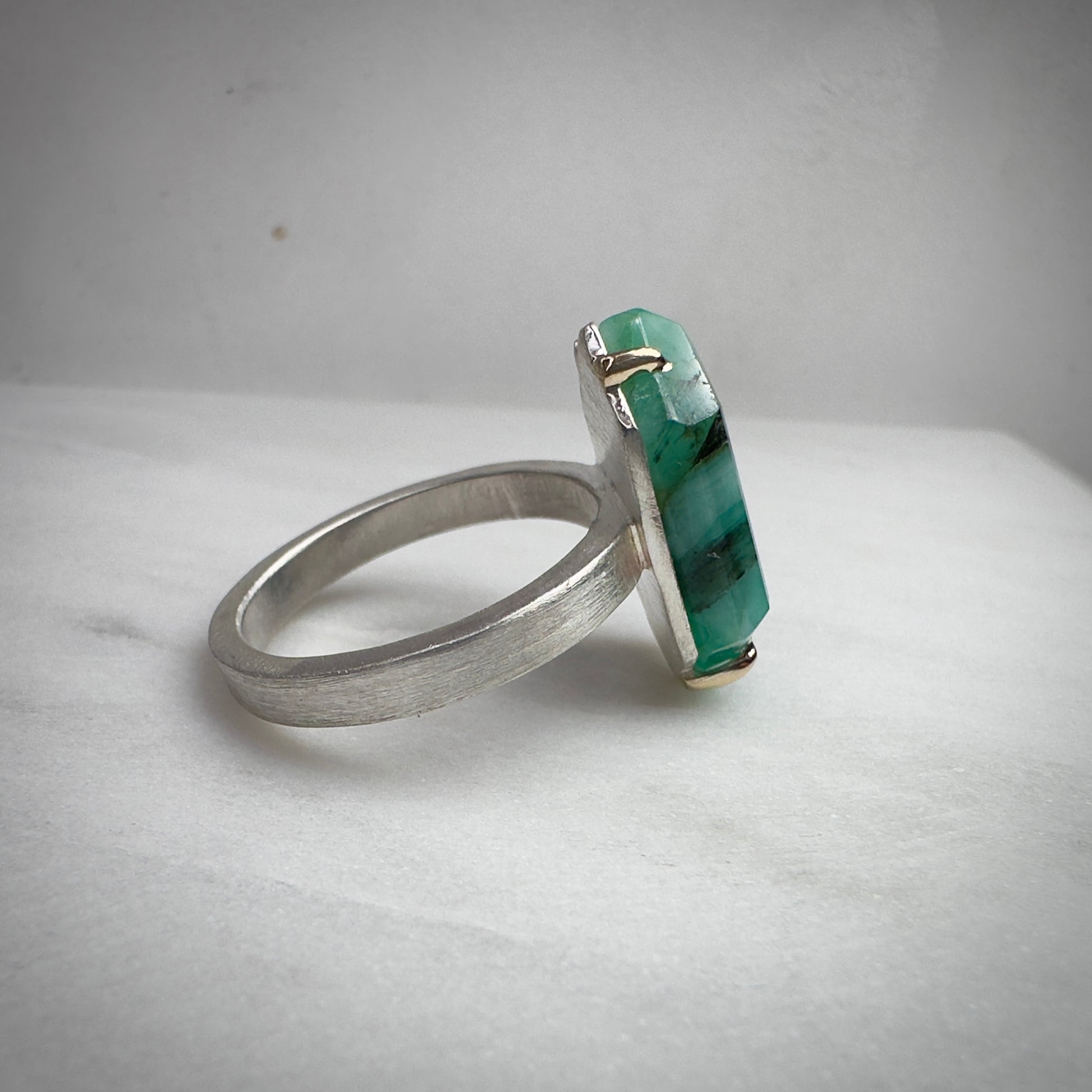 This gorgeous ring features a glowing green Zambian emerald, which was polished and faceted in the contemporary portrait style, in a geometric hexagonal shape. The stone is held in place by 14k yellow gold prongs, which compliment the vibrant green gemstone. The rest of the ring is made from bright matte-finished sterling silver.