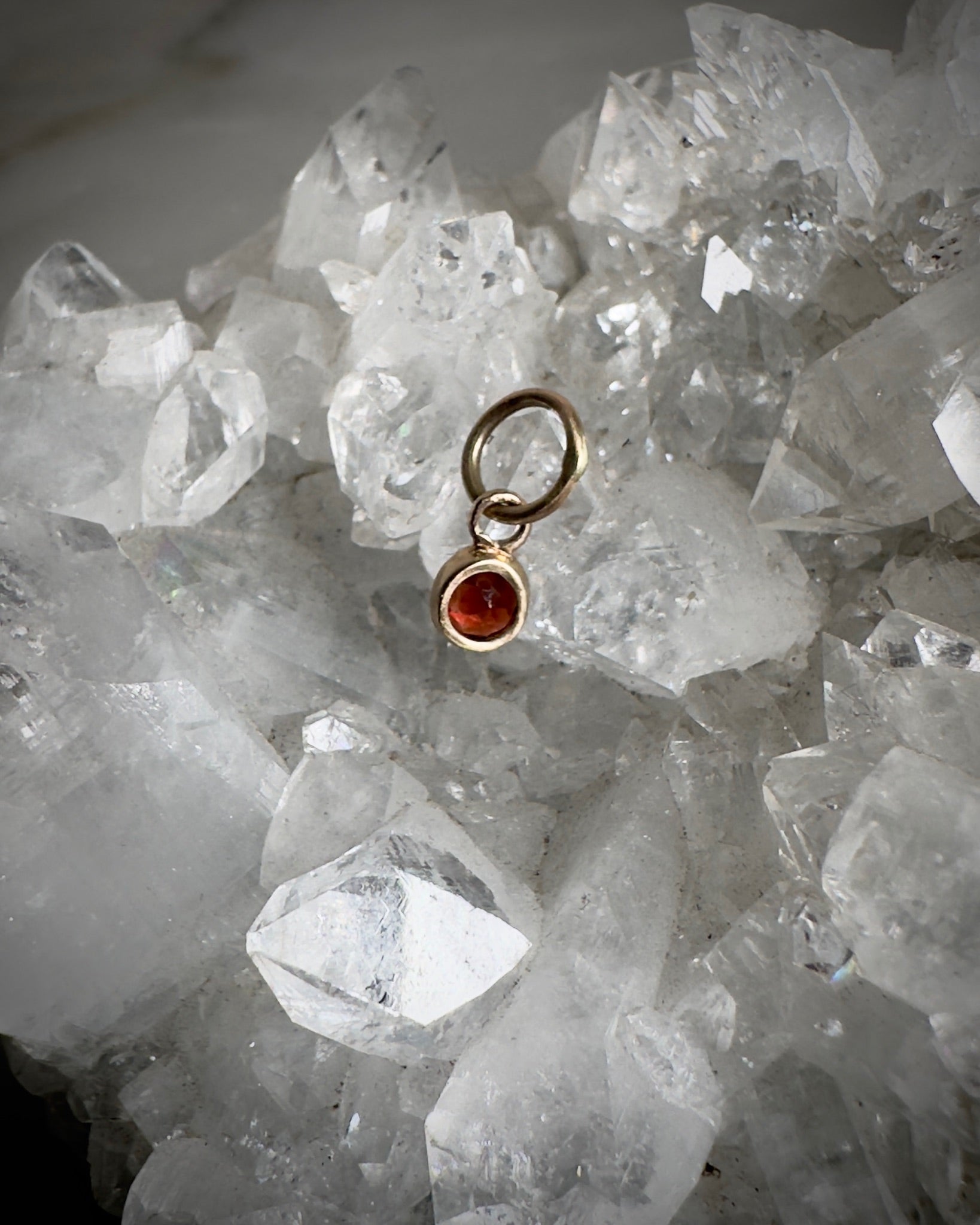 This petite charm features a gorgeous, deep red garnet. The secure bezel setting allows the gemstone to shine brightly while still being protected by normal wear and tear. The bezel is completed with a circular bail, which is large enough to accommodate for a variety of chain sizes and styles.