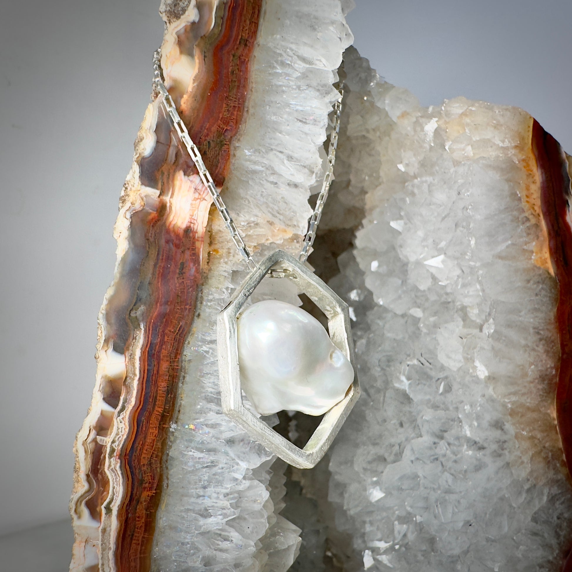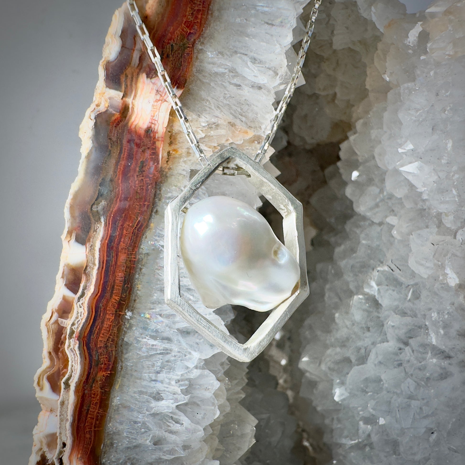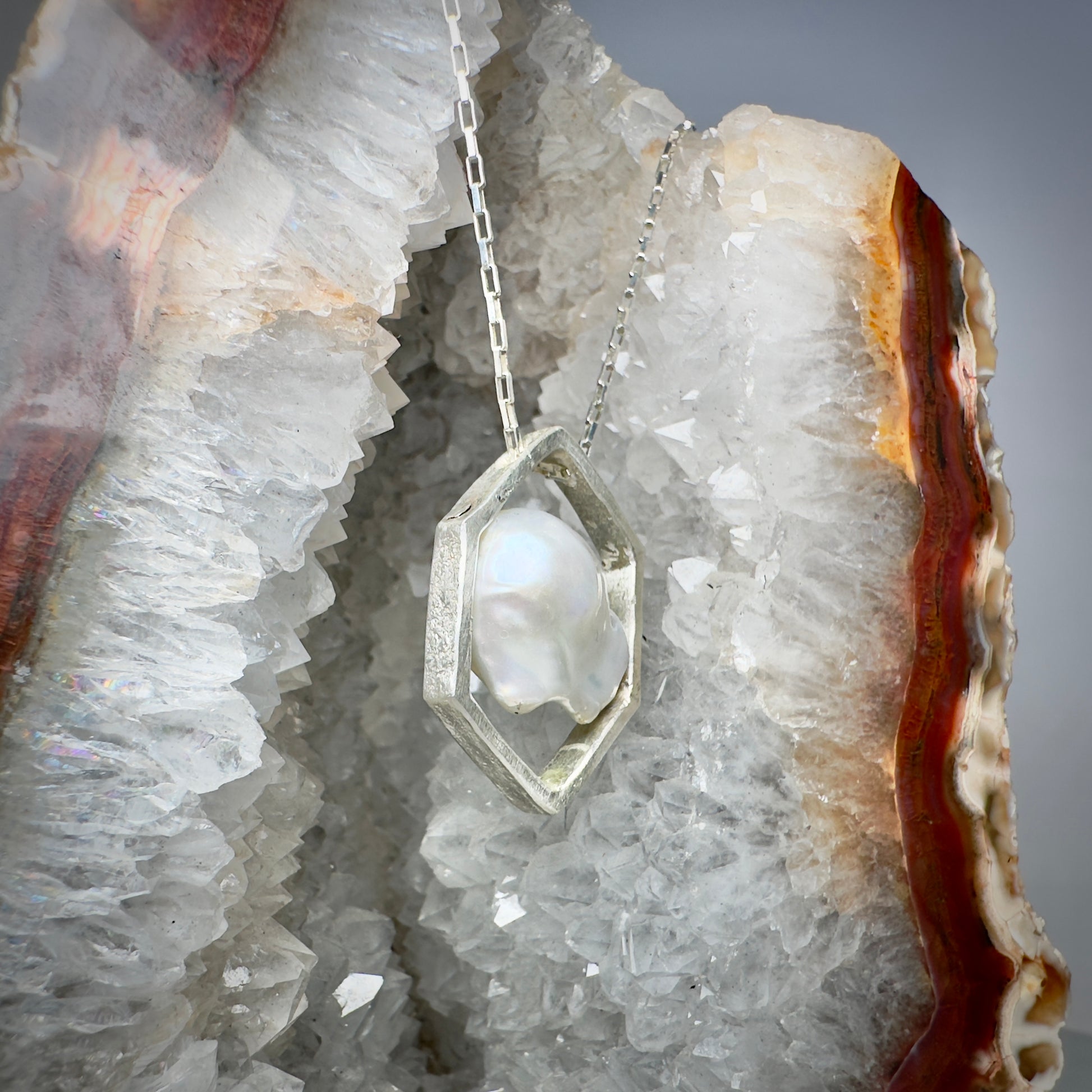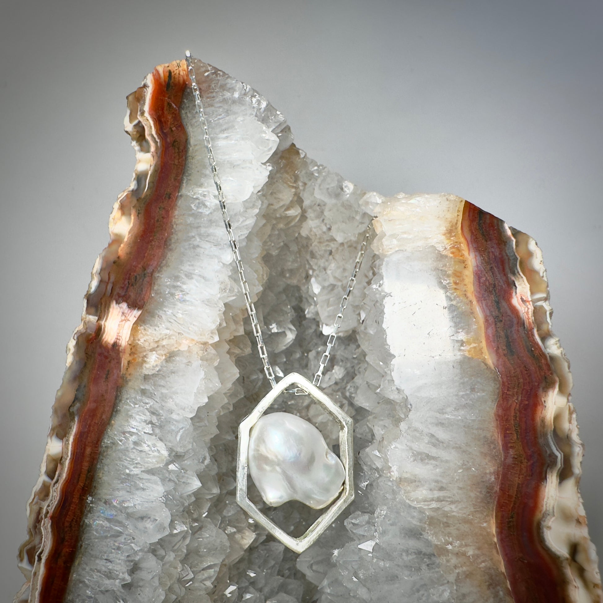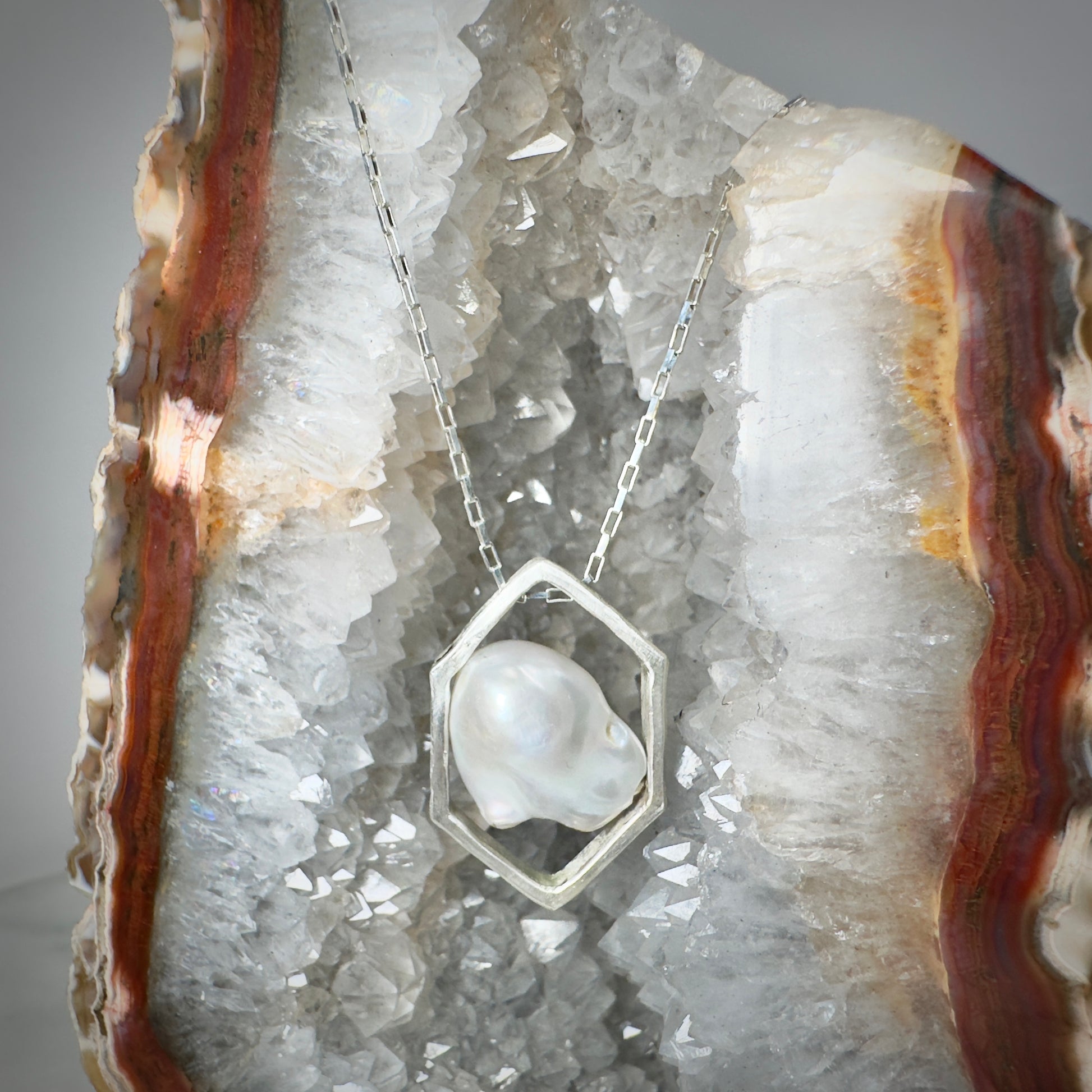 This necklace features a natural freshwater Baroque pearl, which is suspended inside of a textured sterling silver frame. An elongated box chain elegantly threads through the top of the hexagonal pendant and has a standard size lobster clasp at the back. The chain itself has an adjustable length, allowing you to choose your perfect length between 16" and 18"