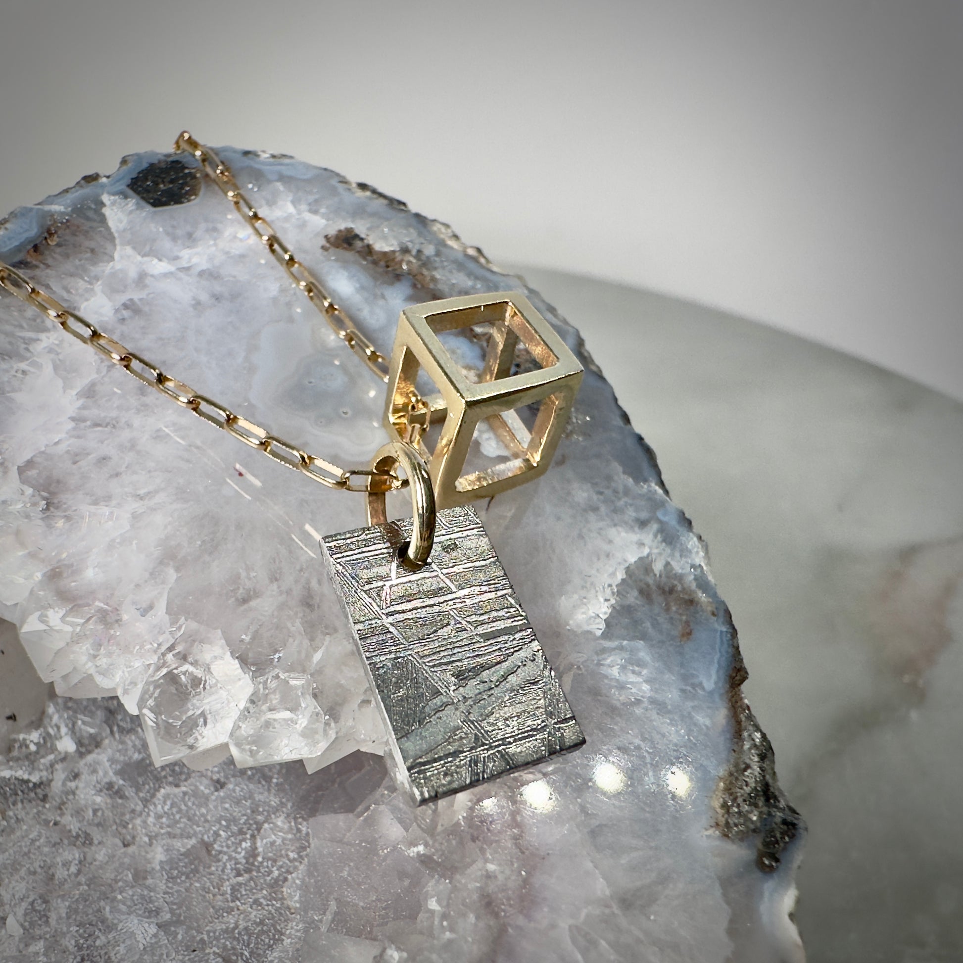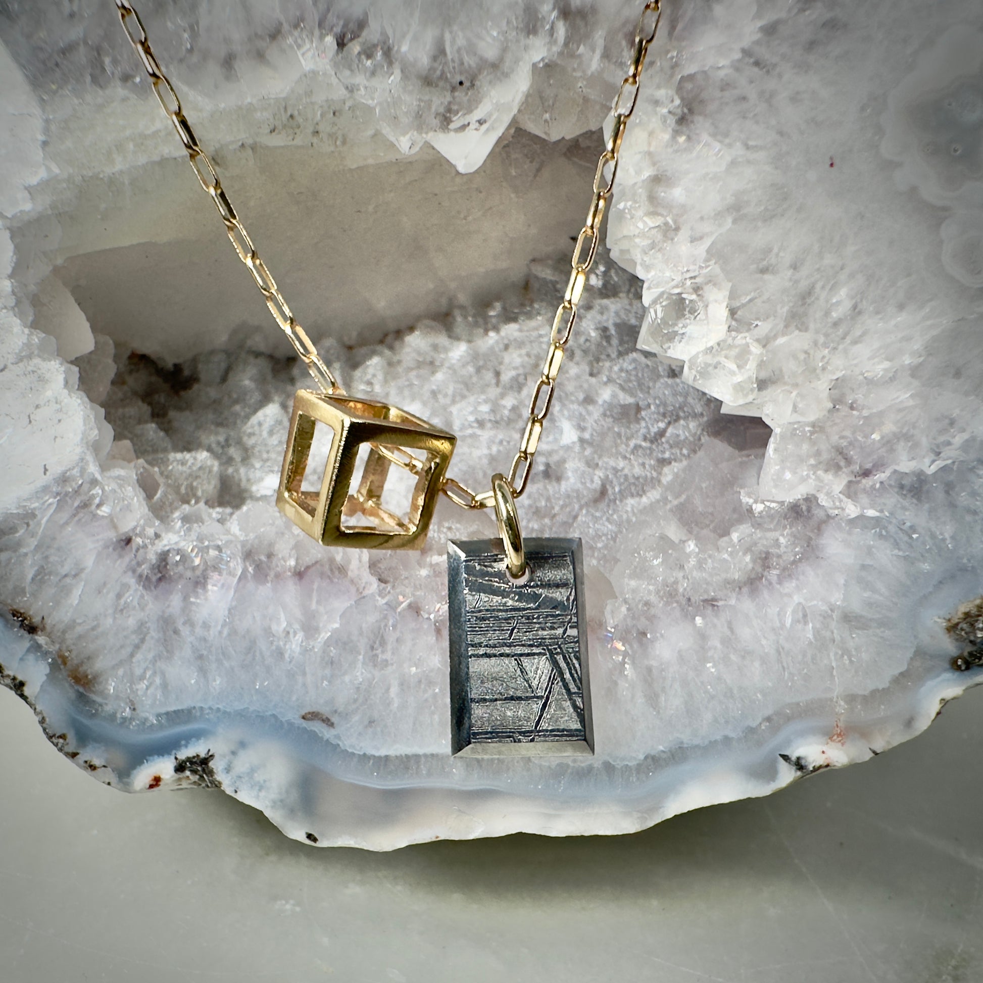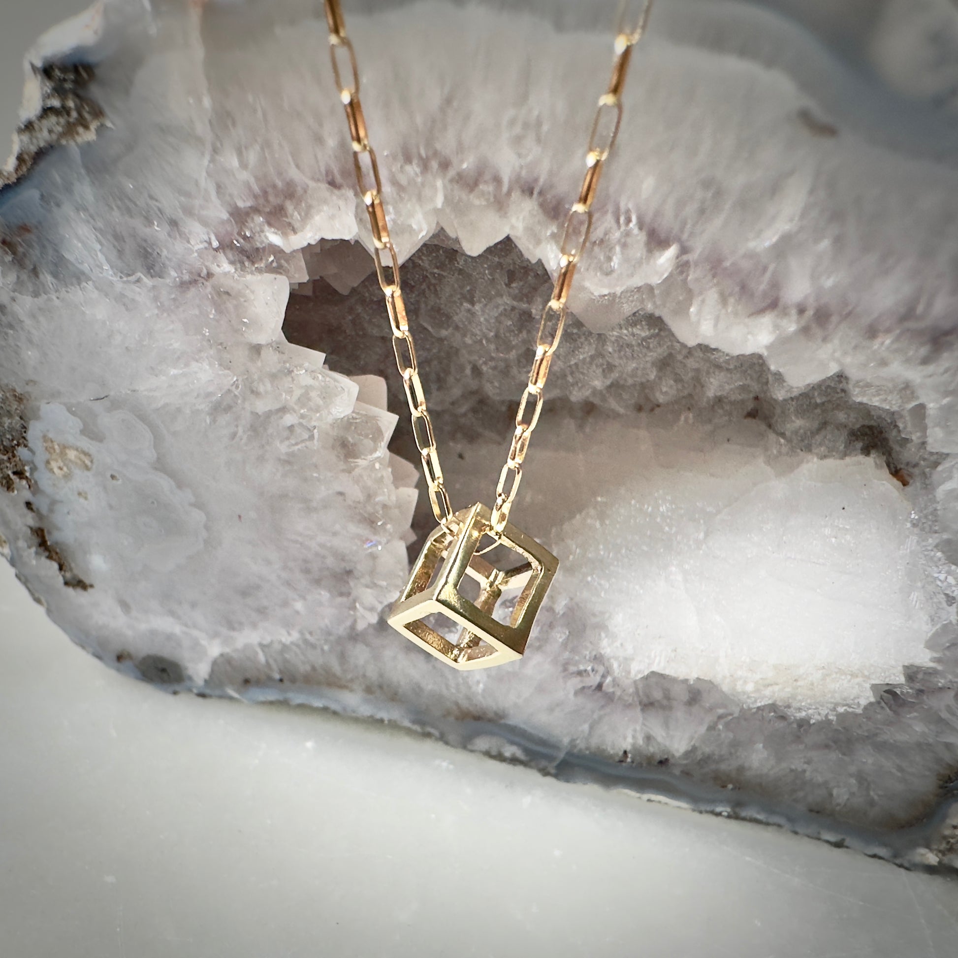 This fully three dimensional cube is a celebration of a simple shape, that is quite literally a building block of life. It was hand fabricated from 14k yellow gold, and cones in your choice of finish: highly polished or satin finish. It measures at a quarter inch, or 7 mm, in each dimension.