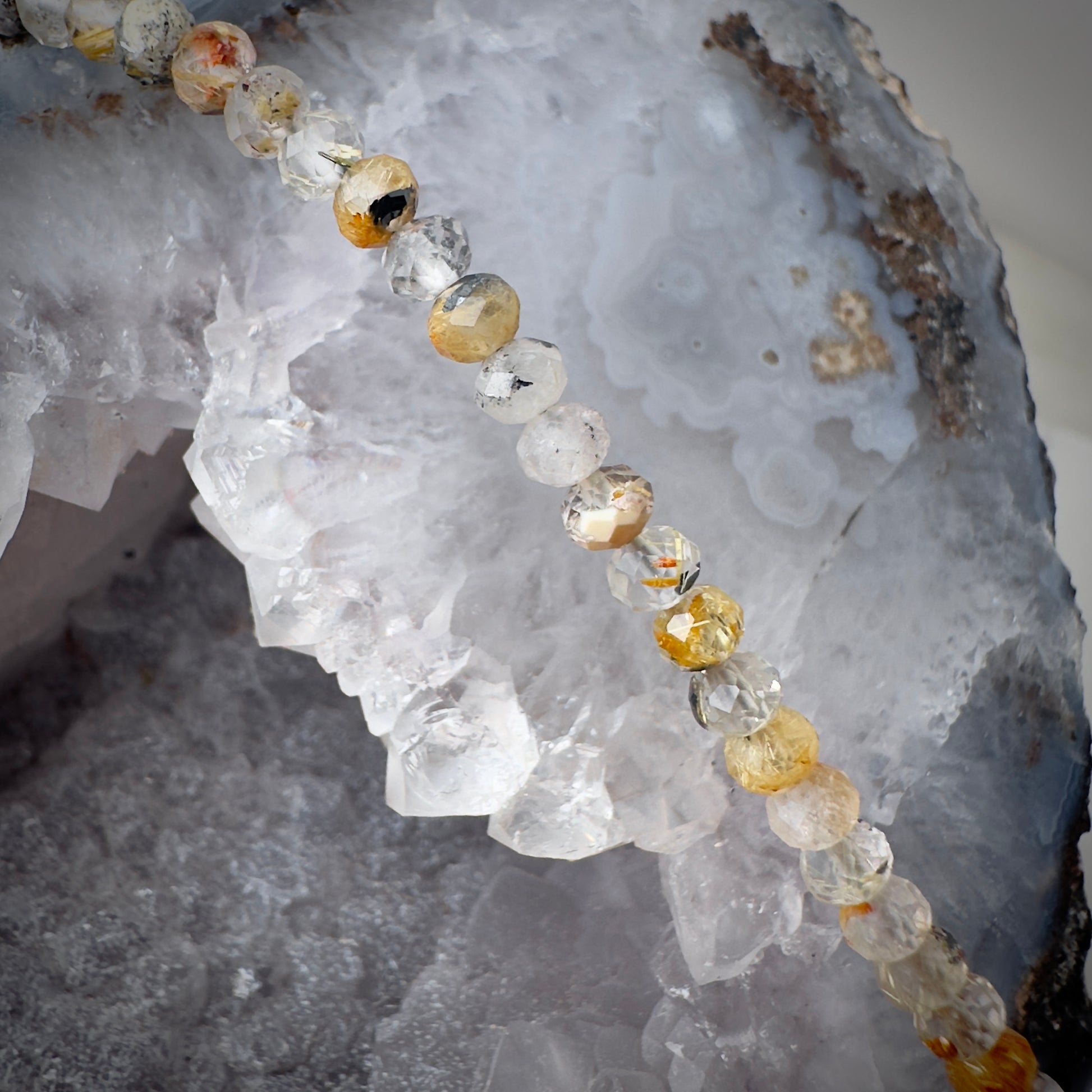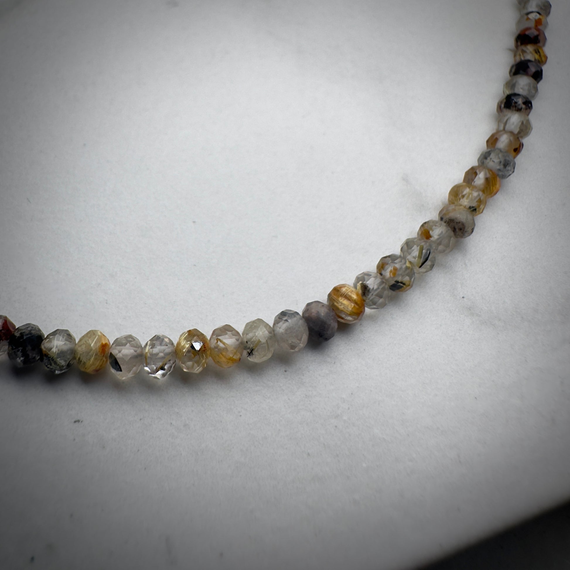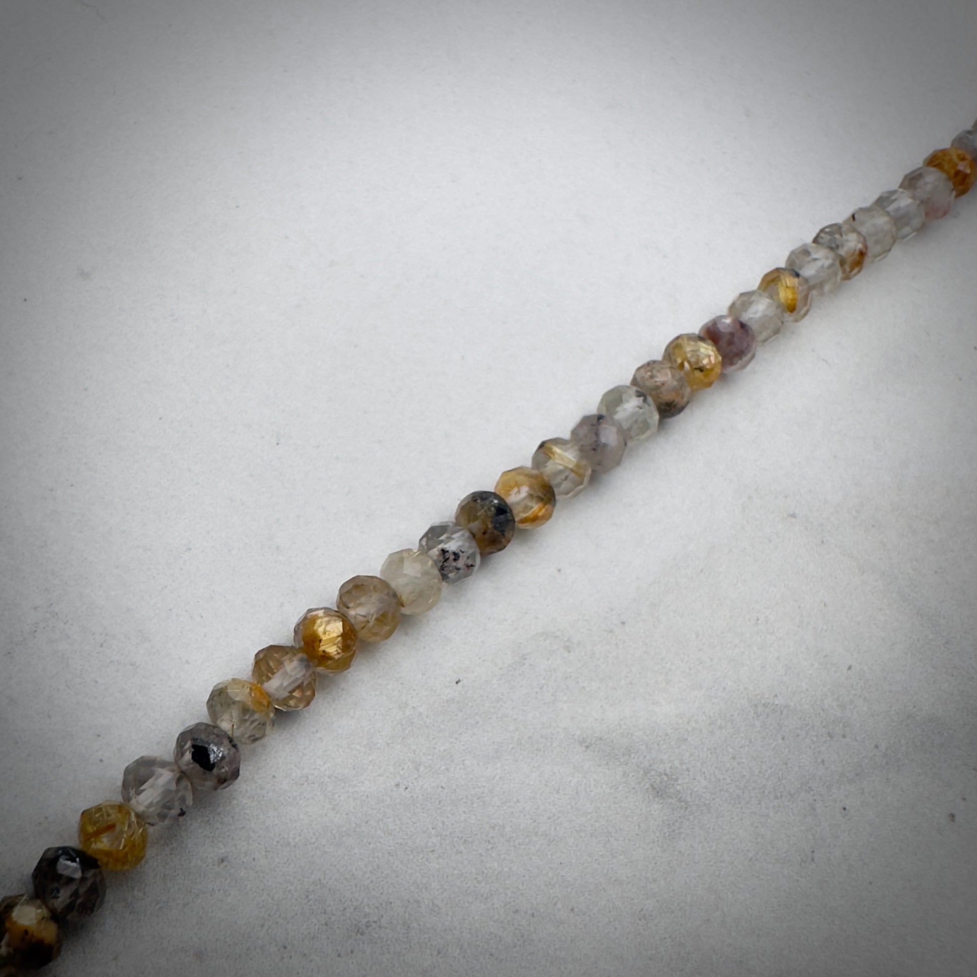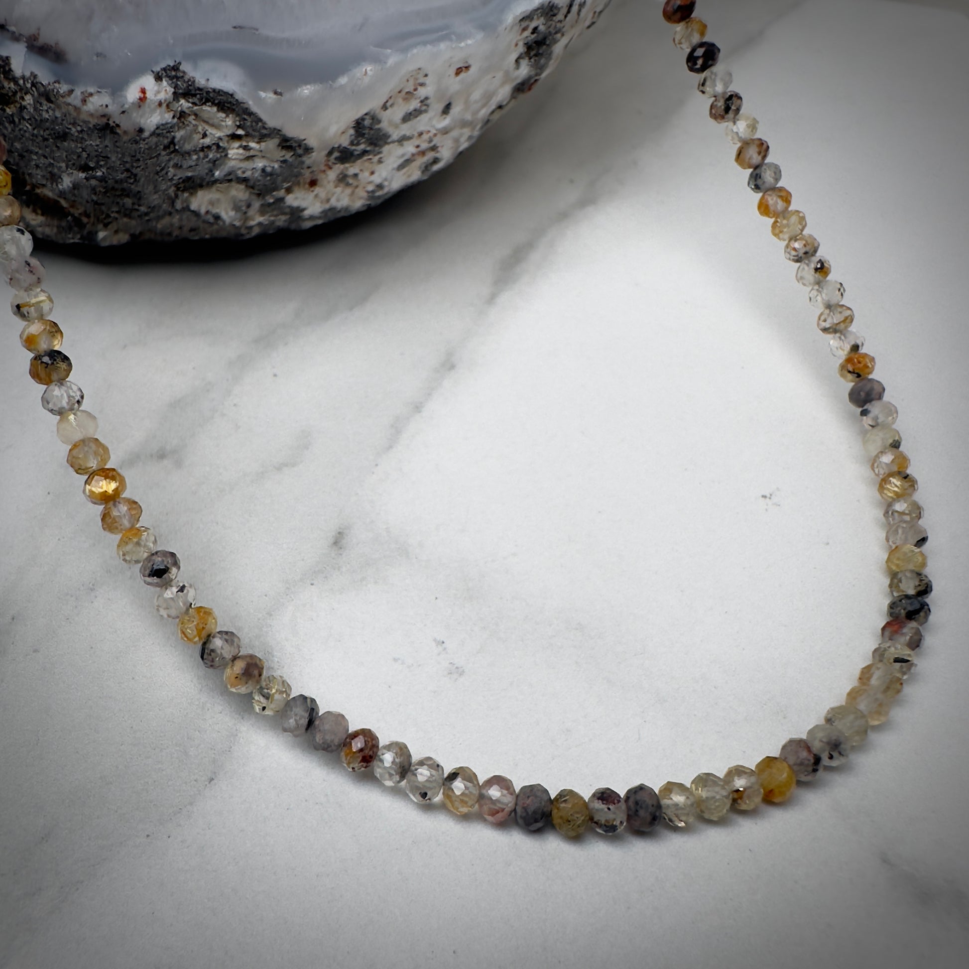 16-18" Adjustable necklace featuring microfaceted, natural golden rutilated quartz beads from Brazil, which were strung onto a braided cable for durability. The necklace is finished with a solid sterling silver clasp and adjustment chain.