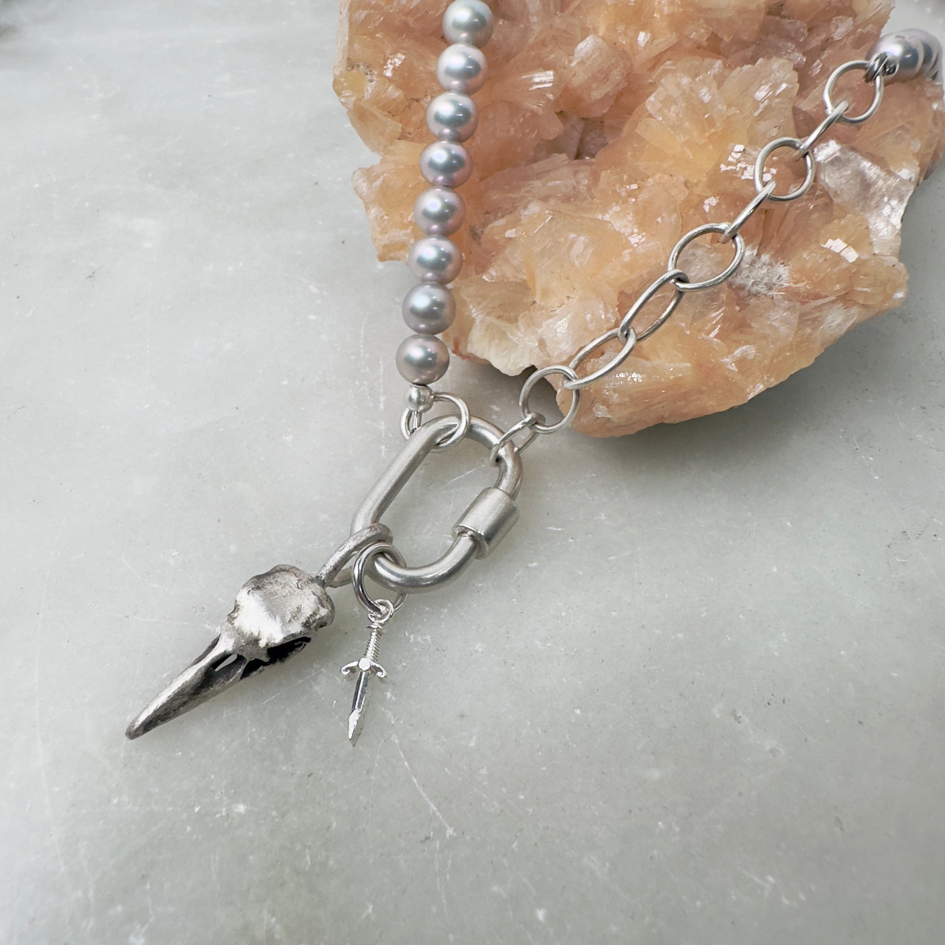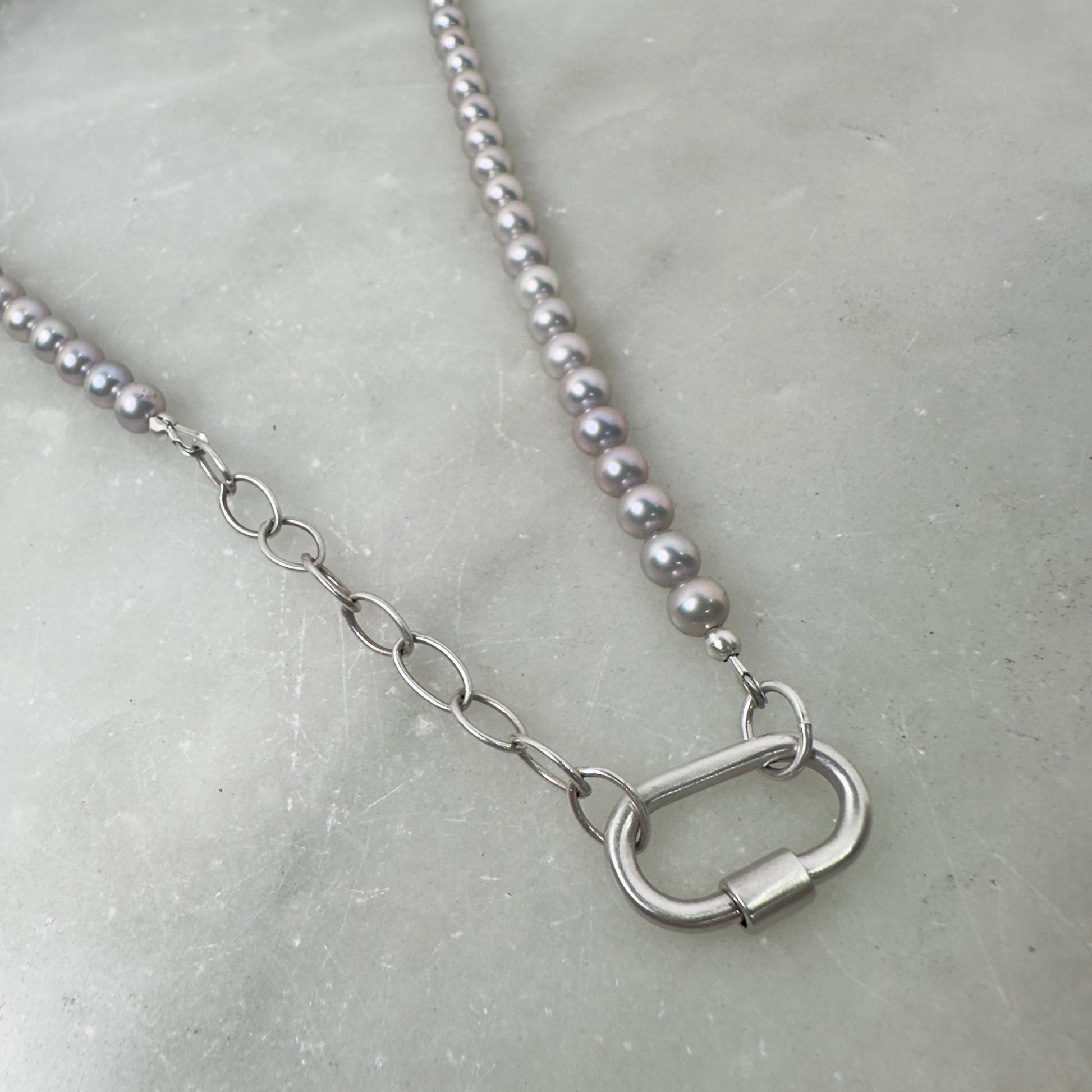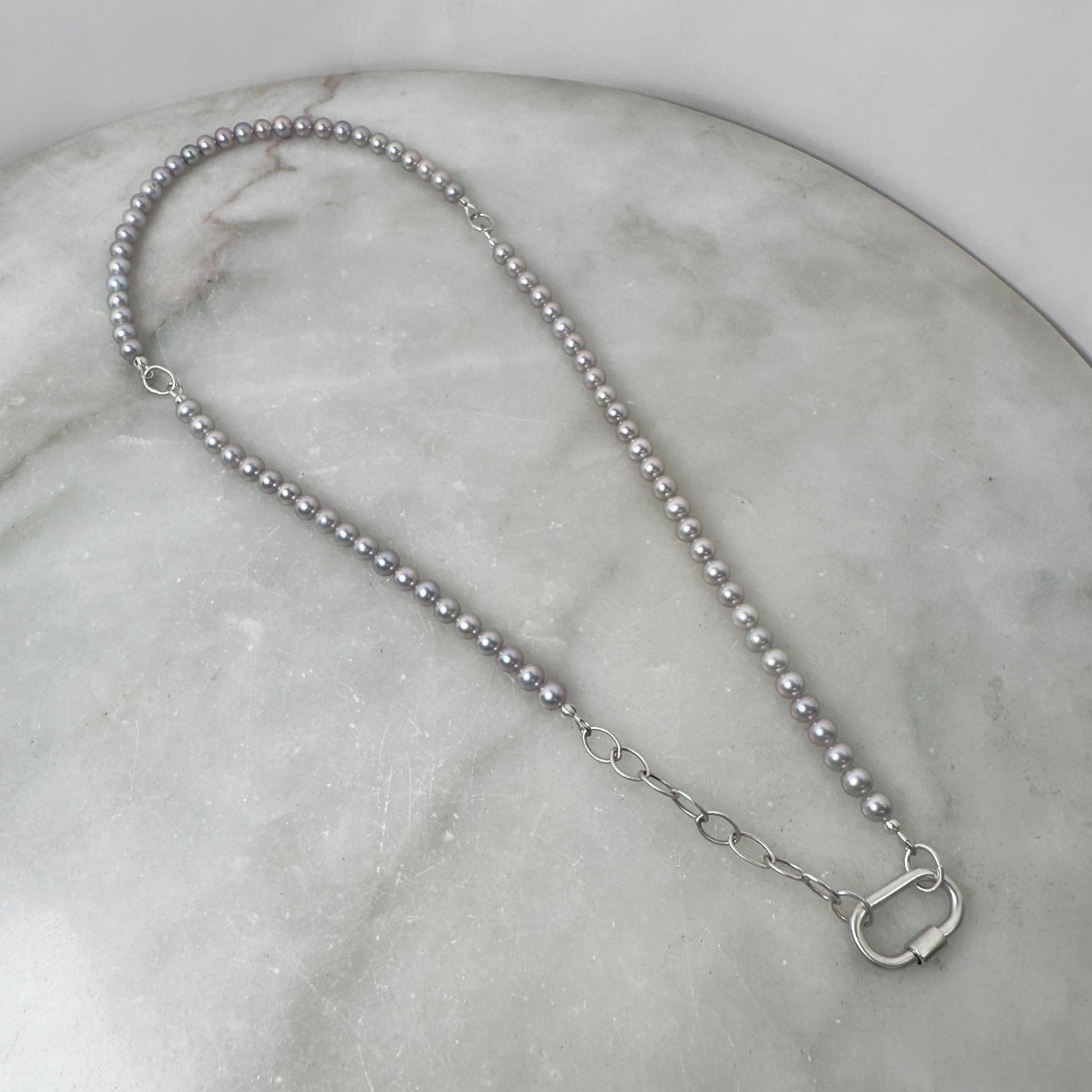 This stunning piece showcases an elegant string of grey freshwater pearls paired with a polished sterling silver carabiner clasp, this versatile piece blends style and practicality. The clasp not only secures the necklace but also lets you add your favorite charms for a personalized touch. Wear it as a necklace or wrap it as a bracelet to effortlessly match your mood and elevate any jewelry ensemble.