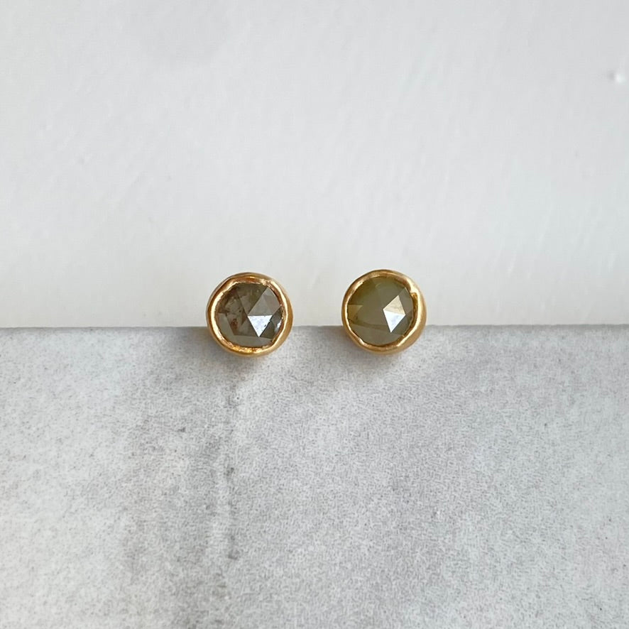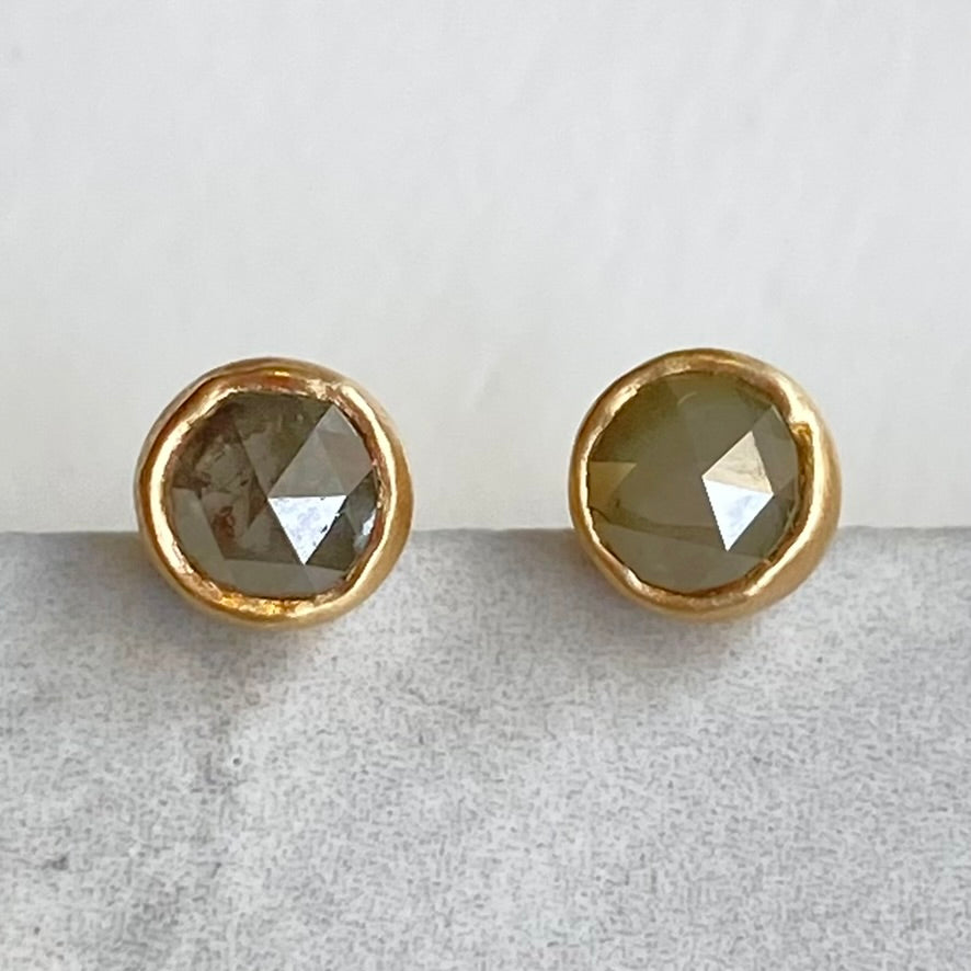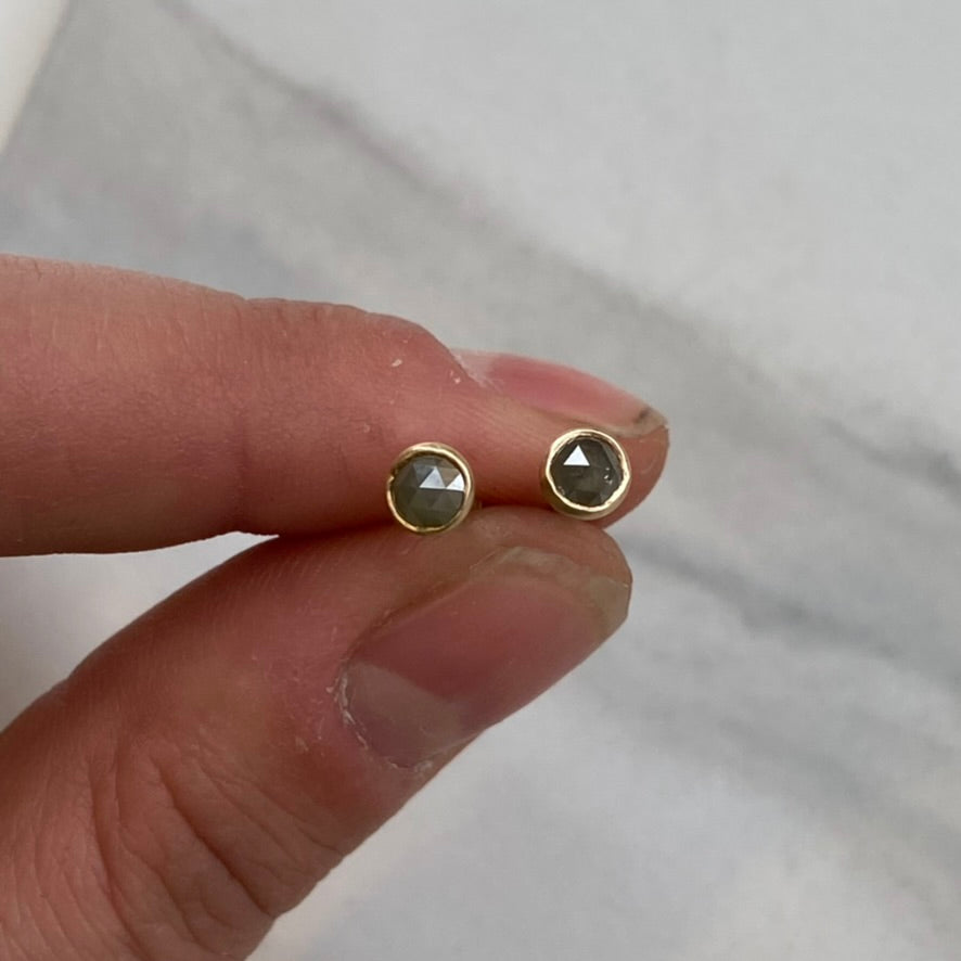 This pair of earrings features a pair of Icy Grey, Salt and Pepper style diamonds, which have been rose cut for some extra sparkle. They are set in solid 14k yellow gold bezel settings. A standard size friction back and post secure these earrings to the ear with comfort.