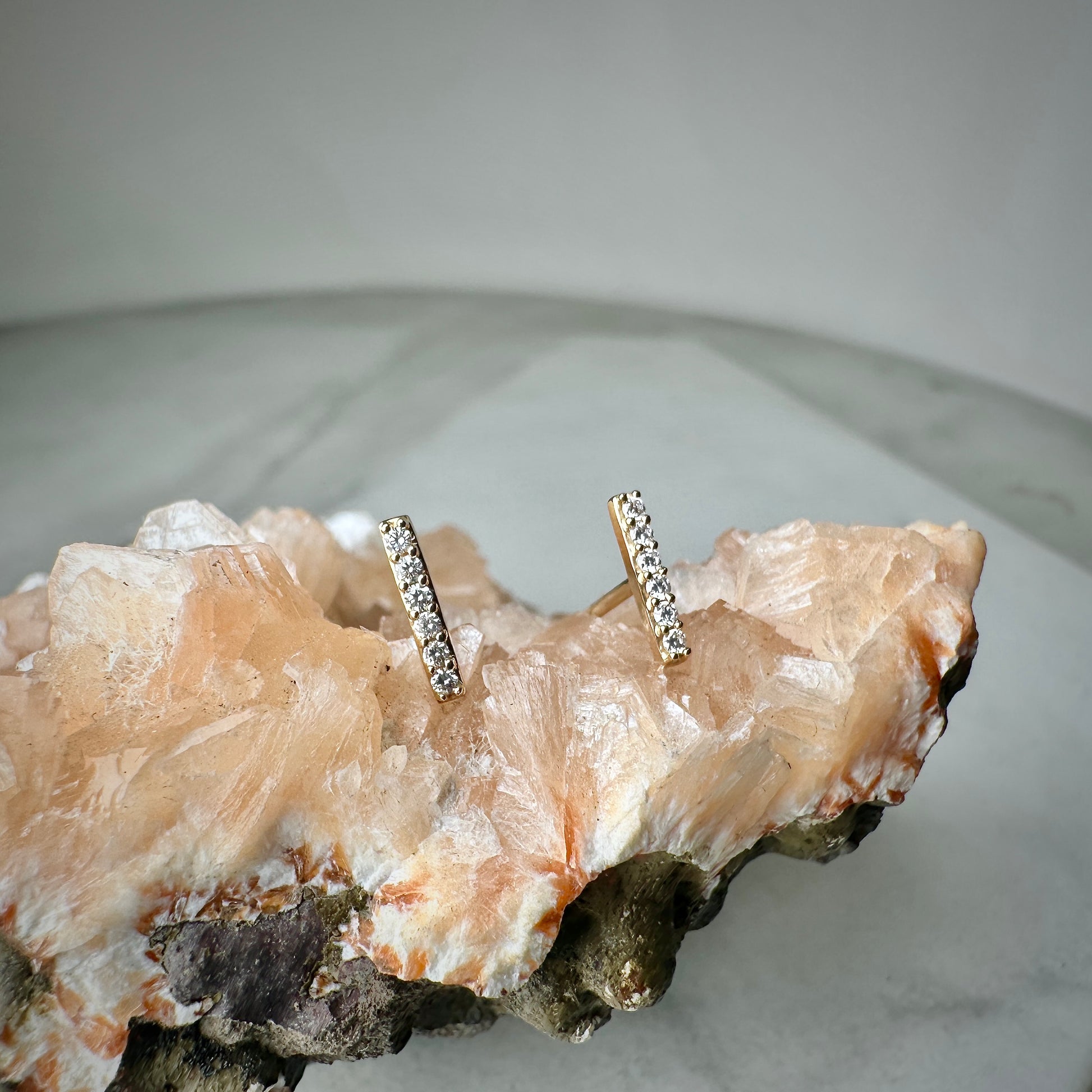Delicately crafted from 14k yellow gold, these minimalist bar earrings feature six sparkling 1.2mm lab grown diamonds. Their sleek design adds a subtle elegance that enhances any look, making them perfect for daily wear or special occasions. Embrace sustainable luxury with ethically sourced stones that shine with exceptional brilliance, all while maintaining a refined and modern aesthetic.