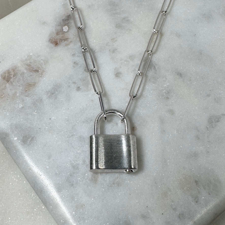 This necklace features a functional sterling silver padlock, which also acts as the clasp! Pull up the spring loaded top to fasten the chain to your neck or wrist. It is made from brushed sterling silver, which is 100% recycled -- meaning that no freshly mined precious metal was used to create this piece. The paperclip style chain is stocked in 18" long, and can easily be adjusted to be the perfect length for you.