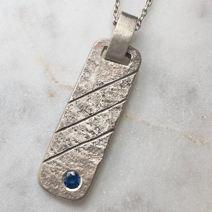 Sapphire is a timeless beauty known best for its variety of blue hues, however it can come in any color. It's a resilient gemstone which can withstand high temperatures and is scratch-resistant due to its hardness. Three diagonal lines interrupt the organic granite texture, and a rich grey patina adds depth to the engraved accents. A high-quality sapphire is flush set into the bottom corner.