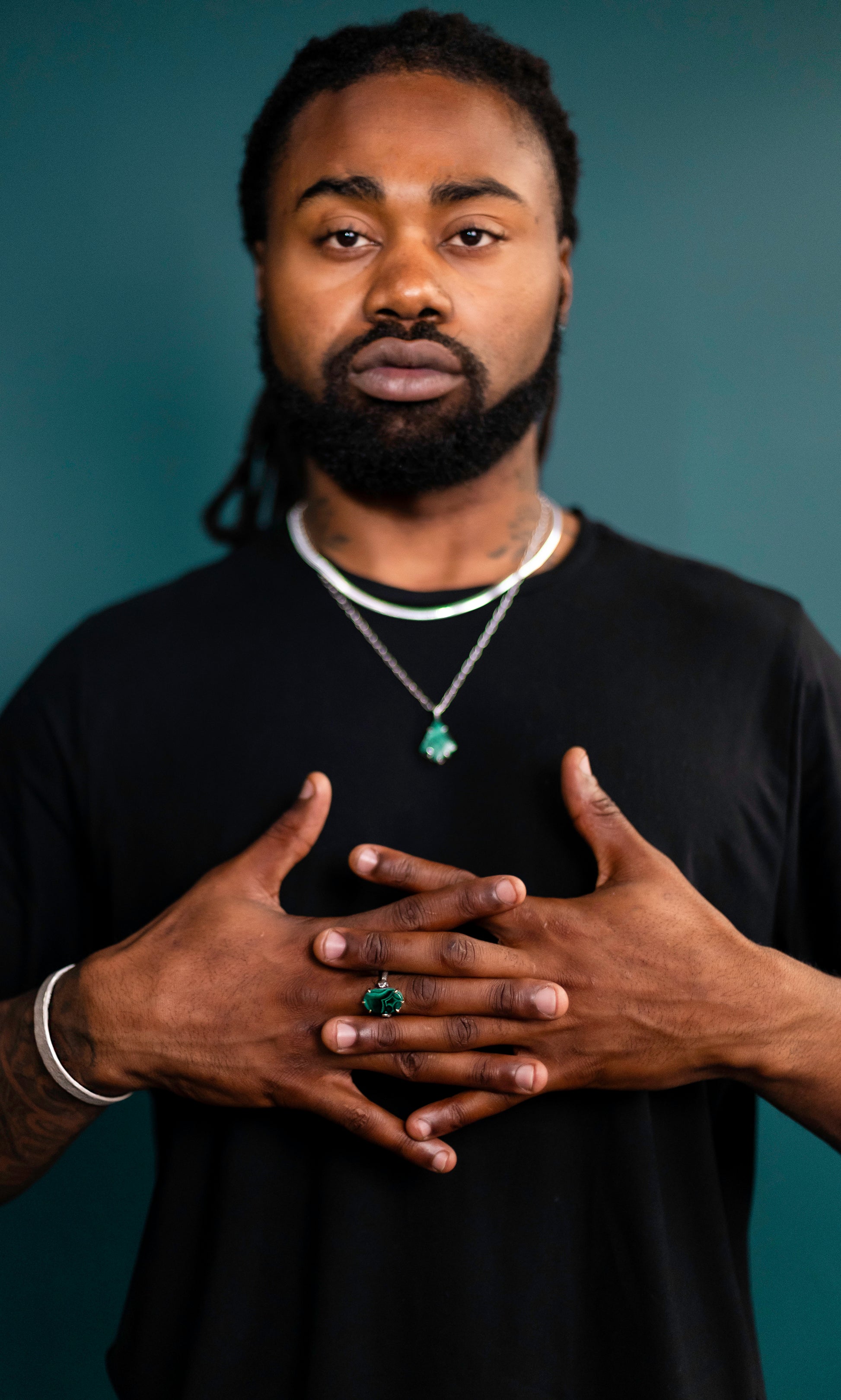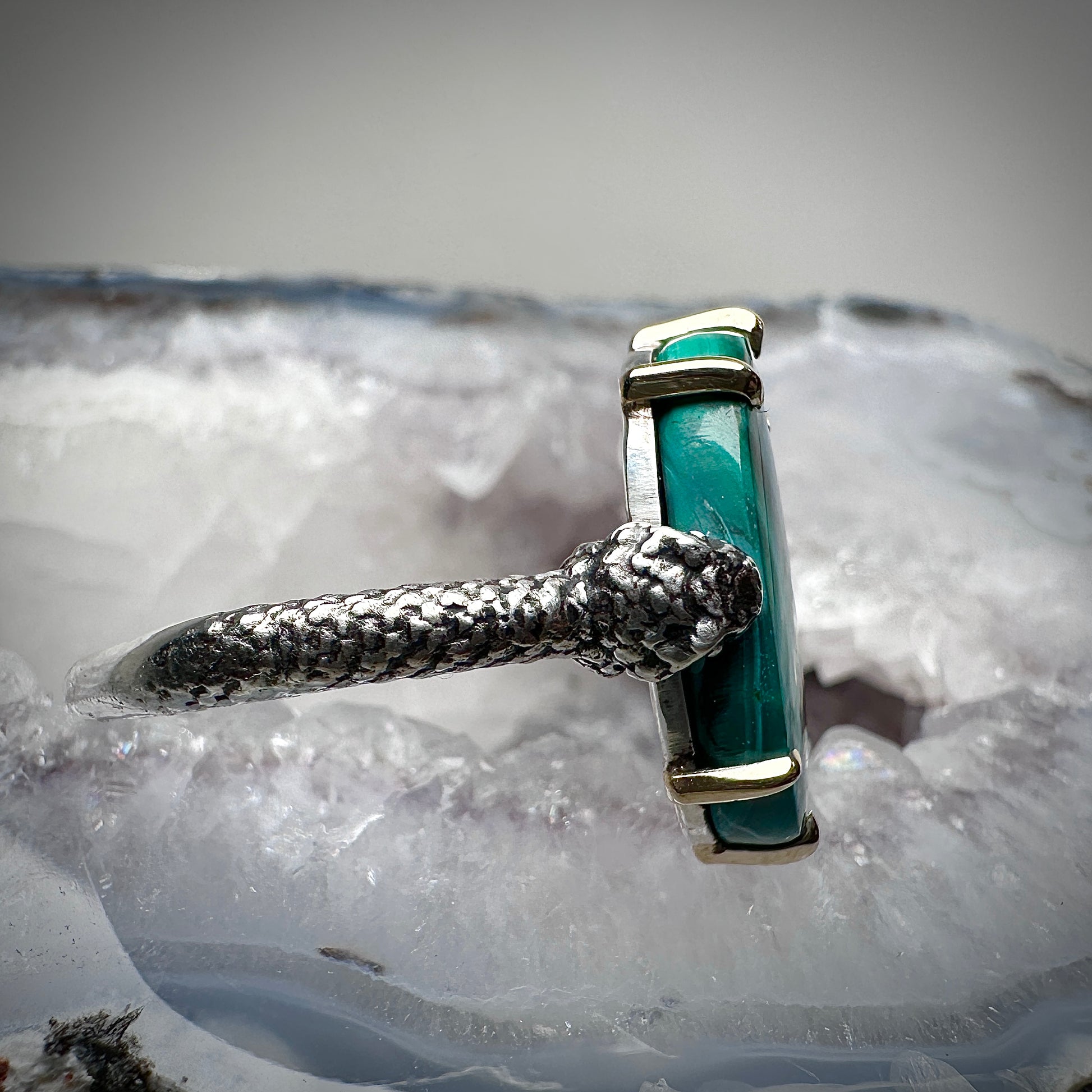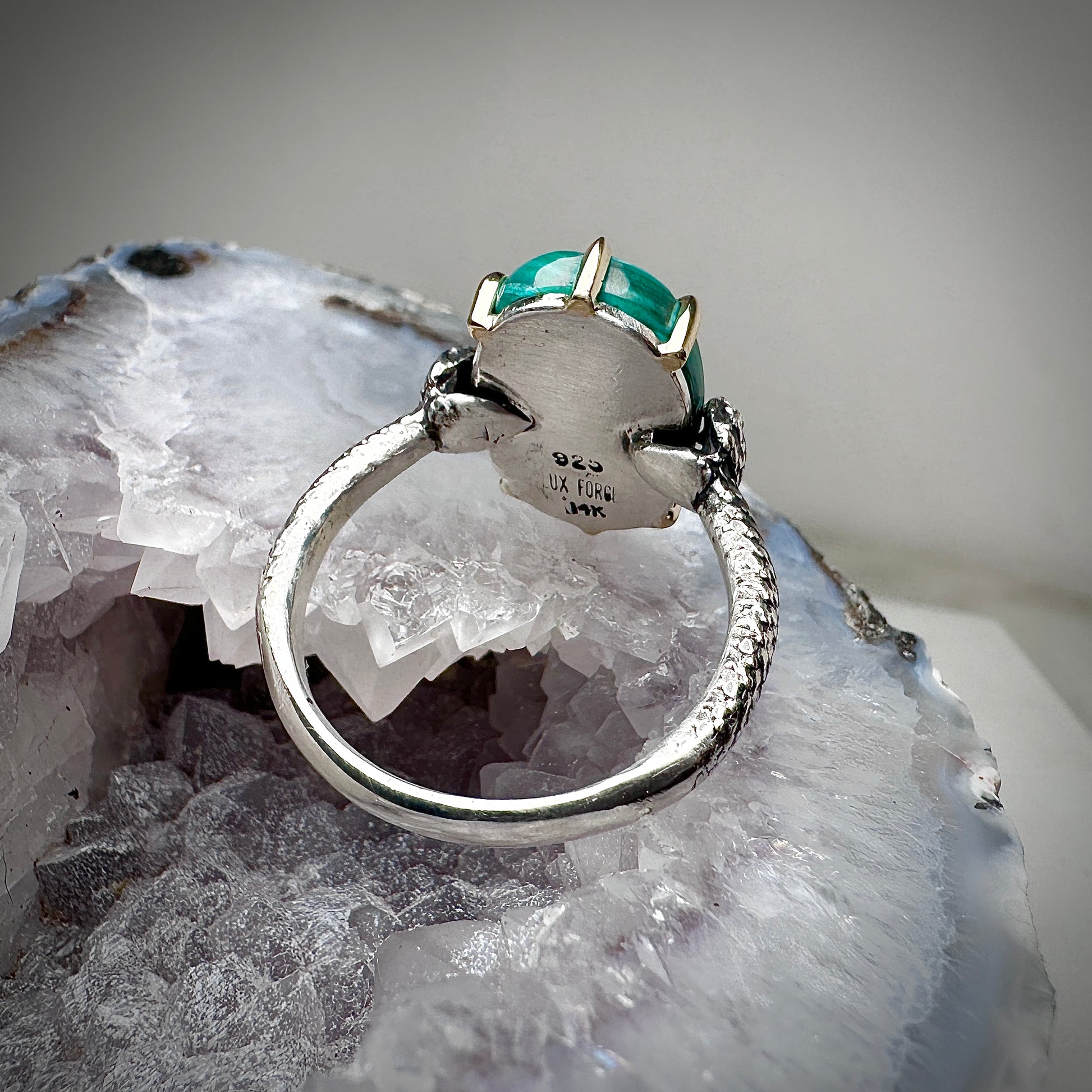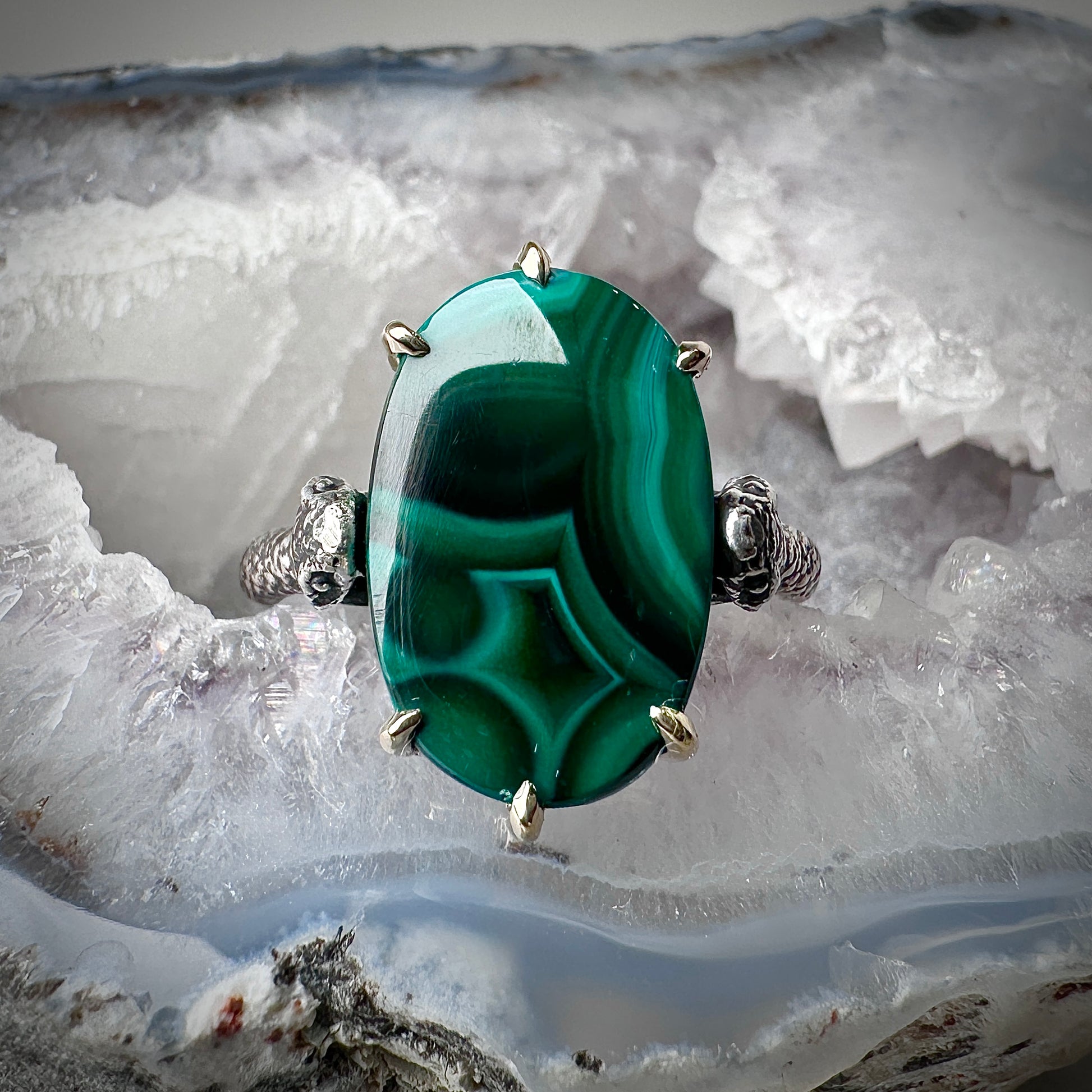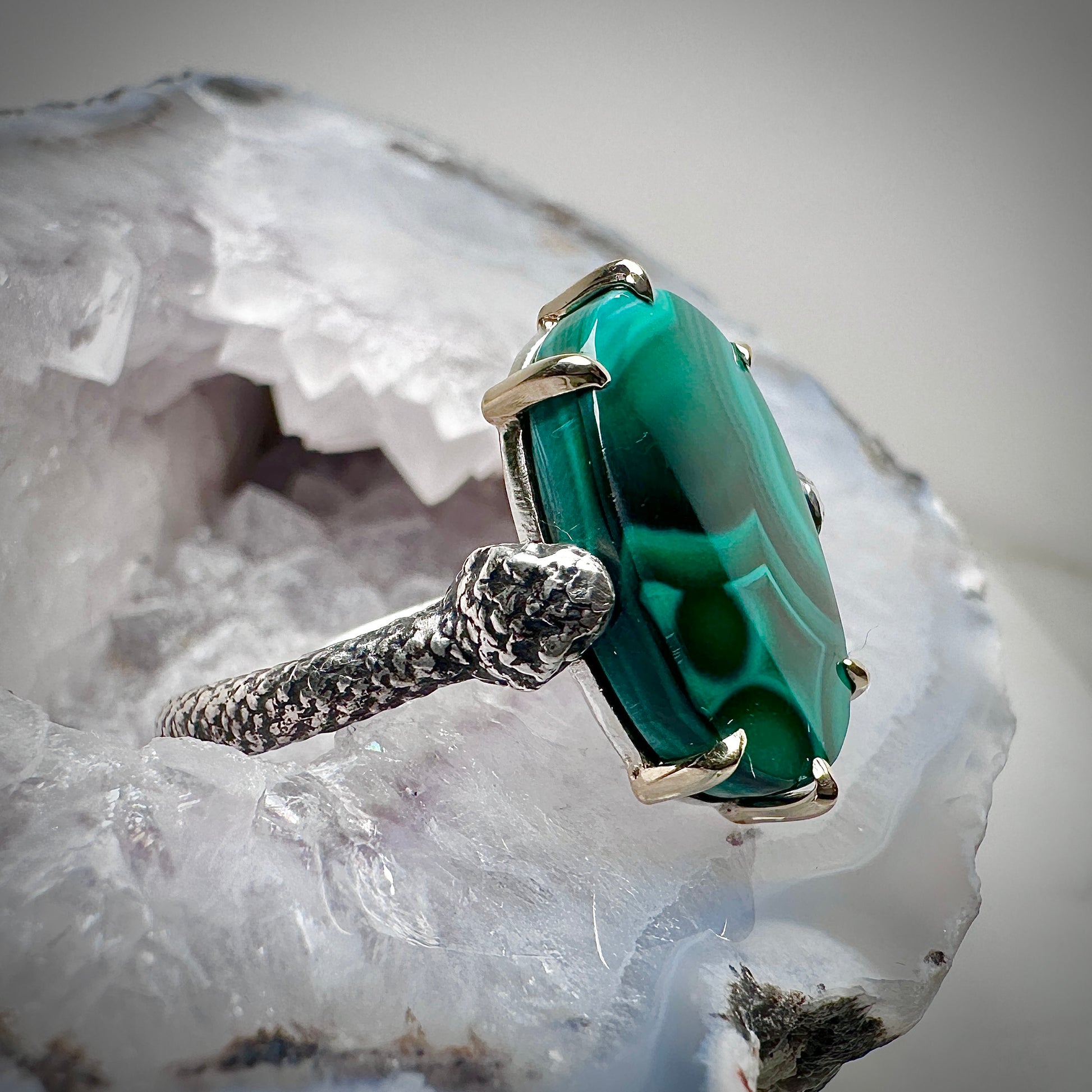 Featuring a gorgeous natural green Malachite cabochon, this unique ring’s band is made from a double ended snake. The prongs which hold the stone in place are solid 14k yellow gold, and the band itself is made from sterling silver. The vibrant green Malachite gemstone is from Zaire, and weighs 12.46 carats.